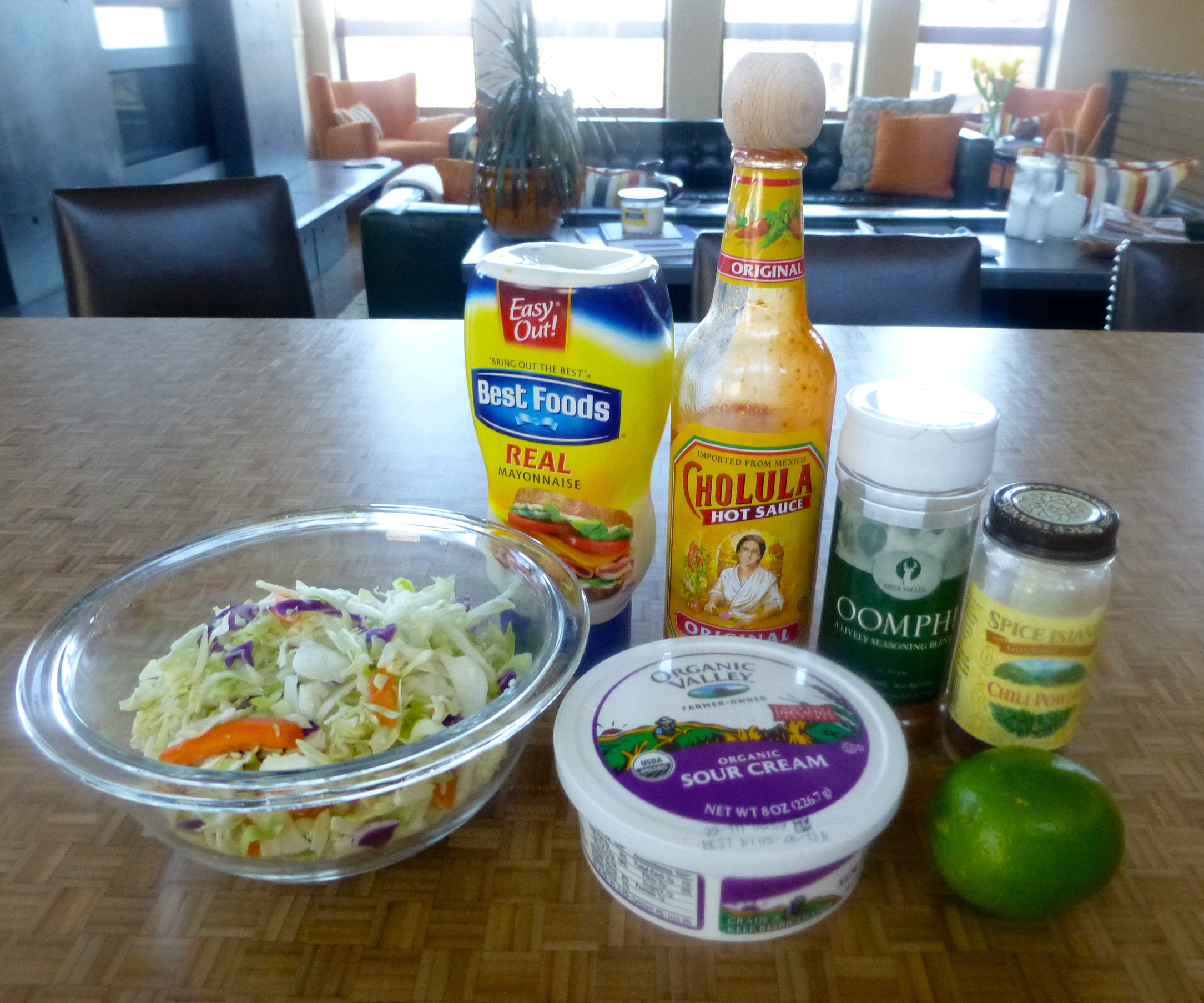 Combine all ingredients besides the slaw in a bowl; taste to adjust seasonings. Pour over the coleslaw and mix well. Serve inside the amazing carnitas tacos (or any taco). YUM!