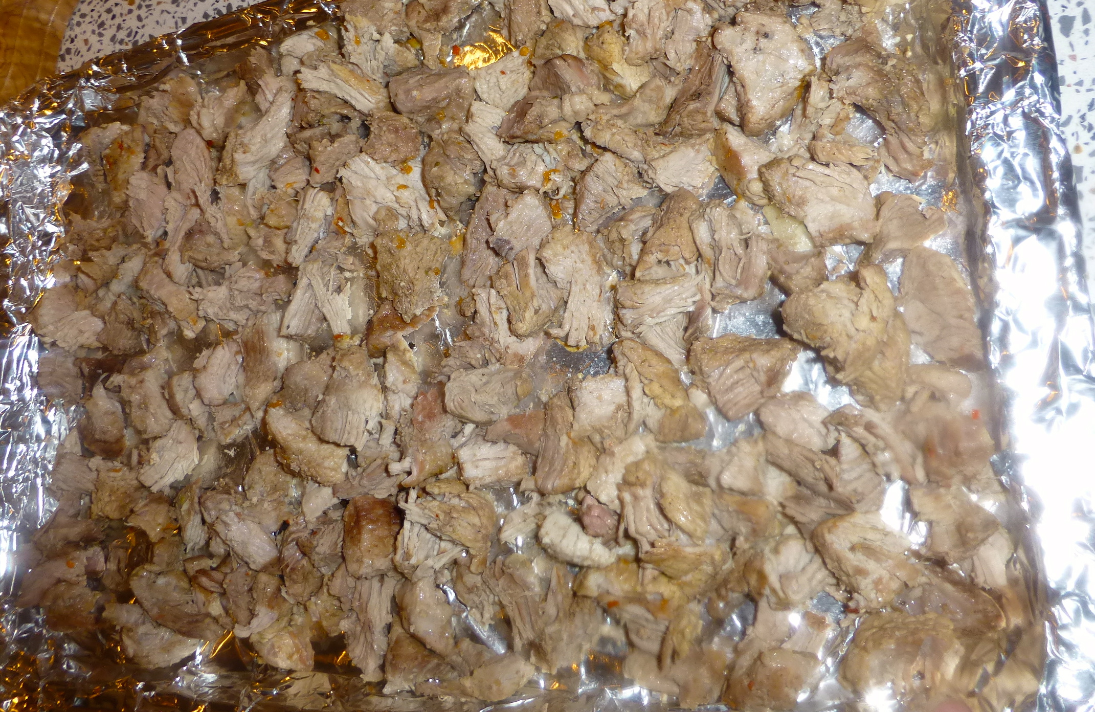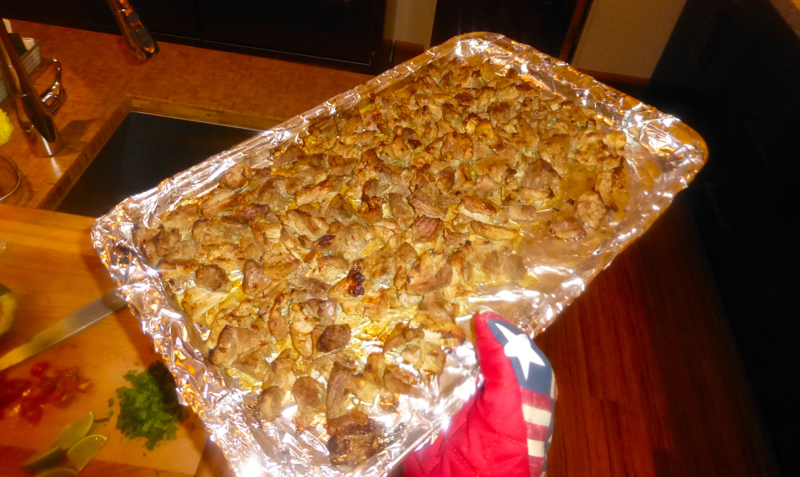 After a couple of hours, it was time for the next step in the carnitas process. I brought the pot out of the oven and removed all of the meat with a slotted spoon, placing it on a baking sheet lined with tin foil.