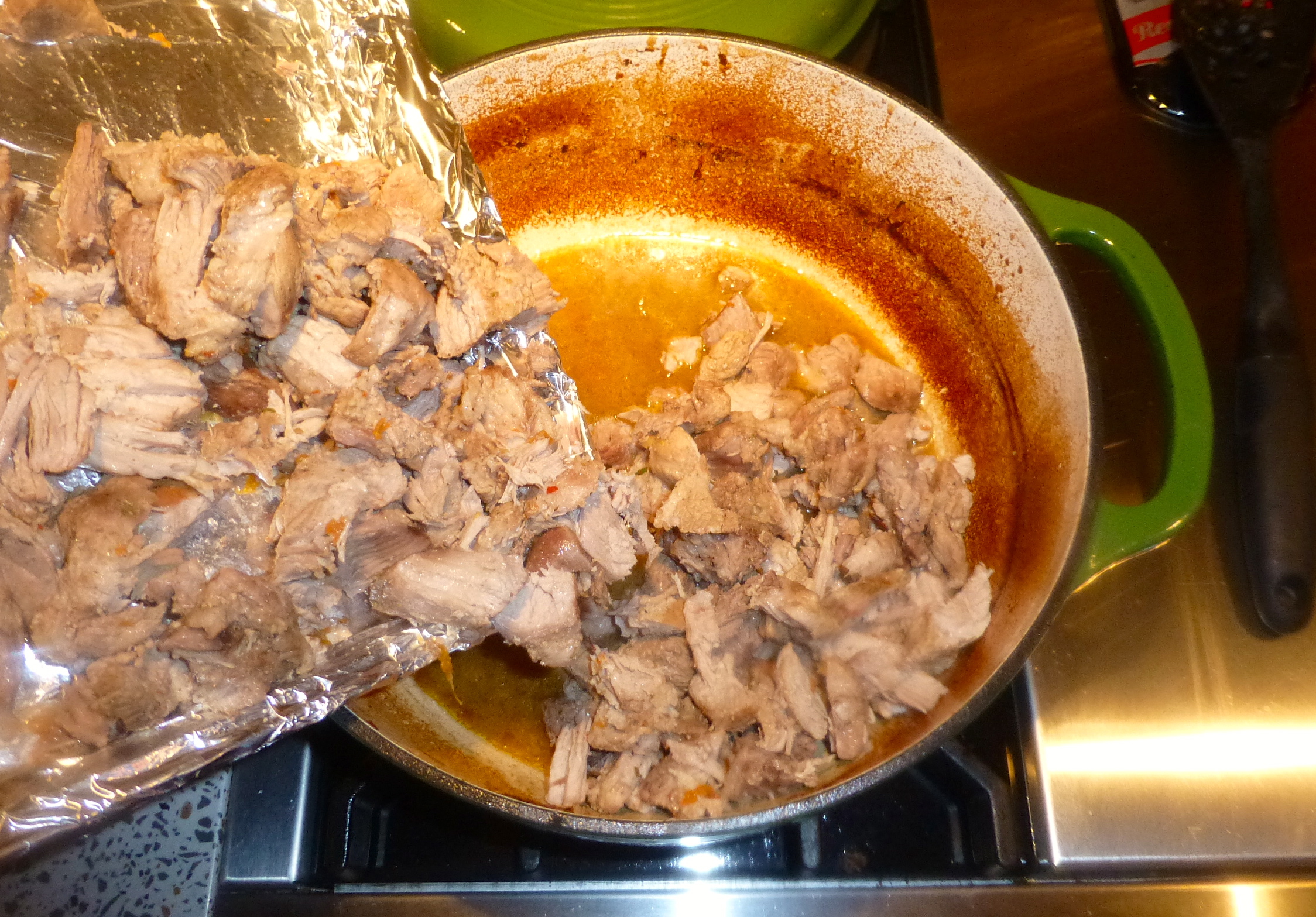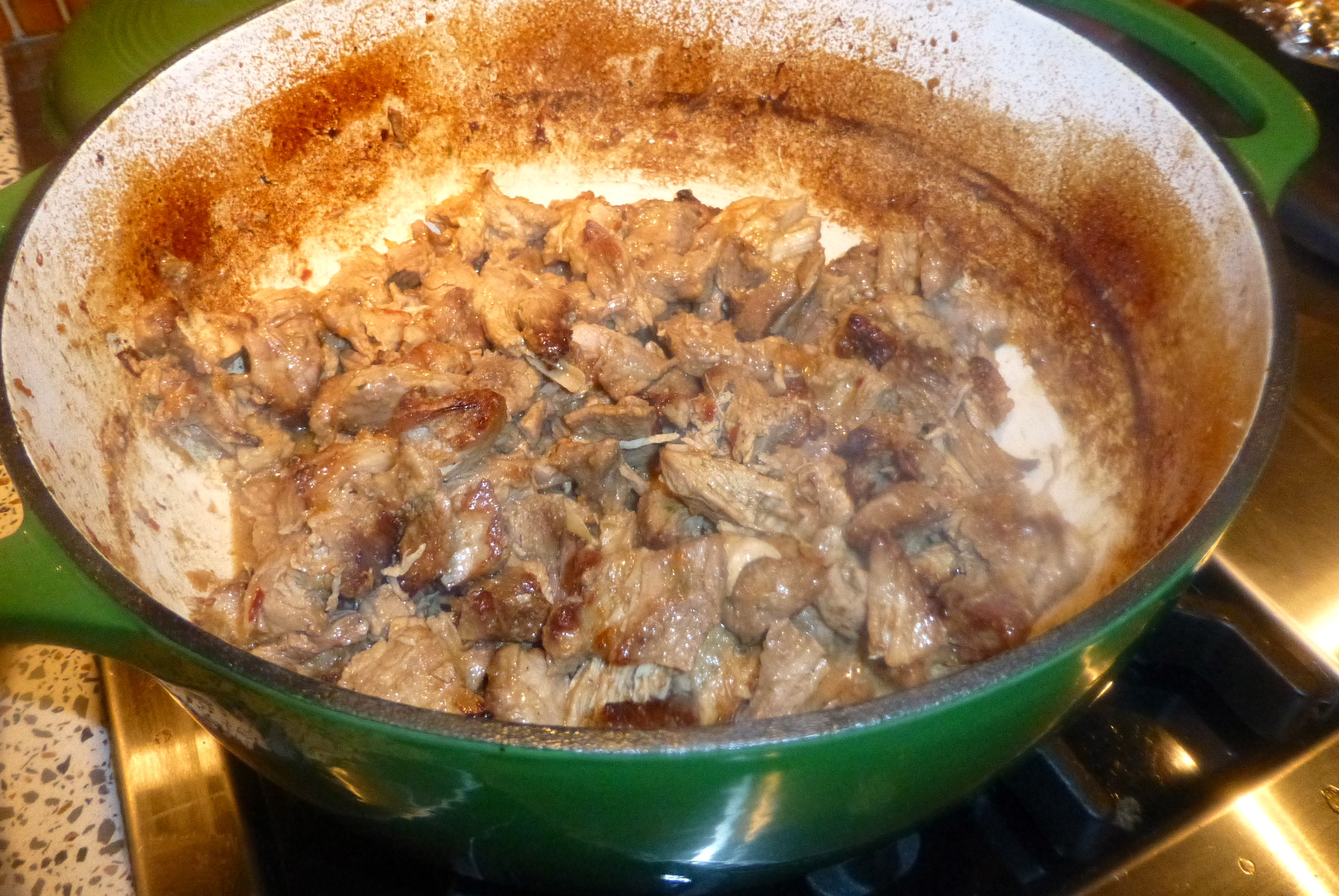 Next, I removed the onion, oranges, and bay leaves from the pot. They’d done their duty. Only the juices remained. I boiled the juices on high heat while I took a fork and knife and gently pulled the chunks of carnitas apart- not fully shredding them, but creating smaller chunks. According to Cholula’s face, so far, so good.