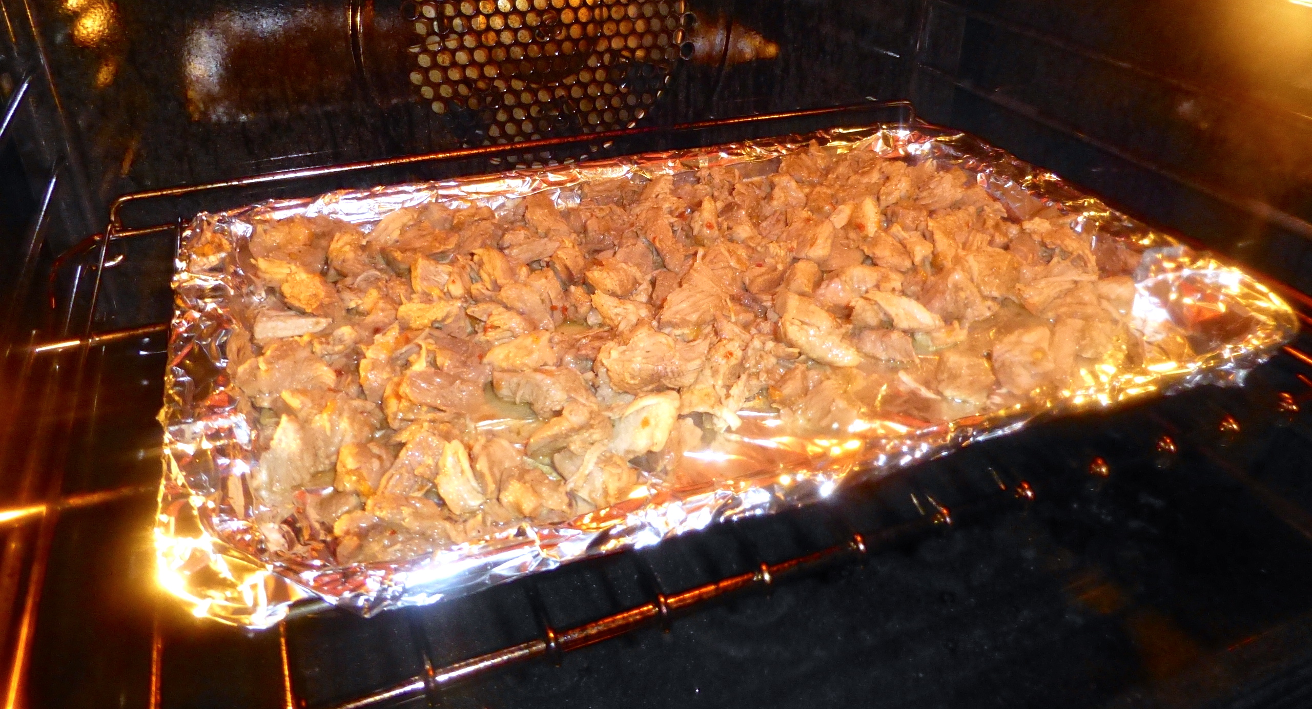 The semi-shredded meat went back into the pot of juices, which had reduced into a thicker sauce. I stirred it all together into a juicy, meaty mess, then poured it all back onto the baking sheet. It went into the oven and broiled for a few minutes, getting crispy and browned. Cue drool.