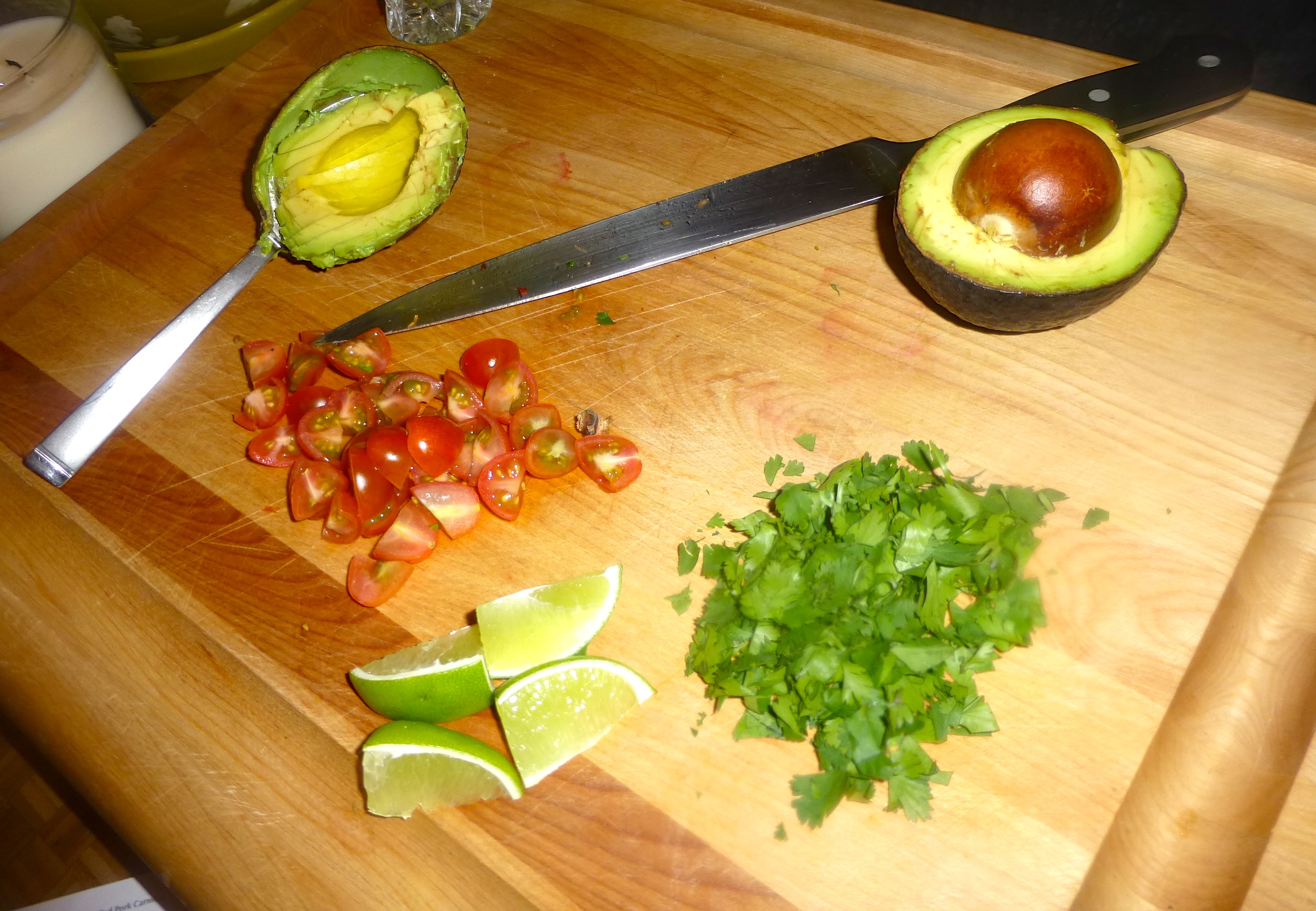 While the carnitas were browning, I added the spicy sauce to the slaw and prepped some taco toppings- fresh tomatoes, cilantro, and big slices of creamy avocado.