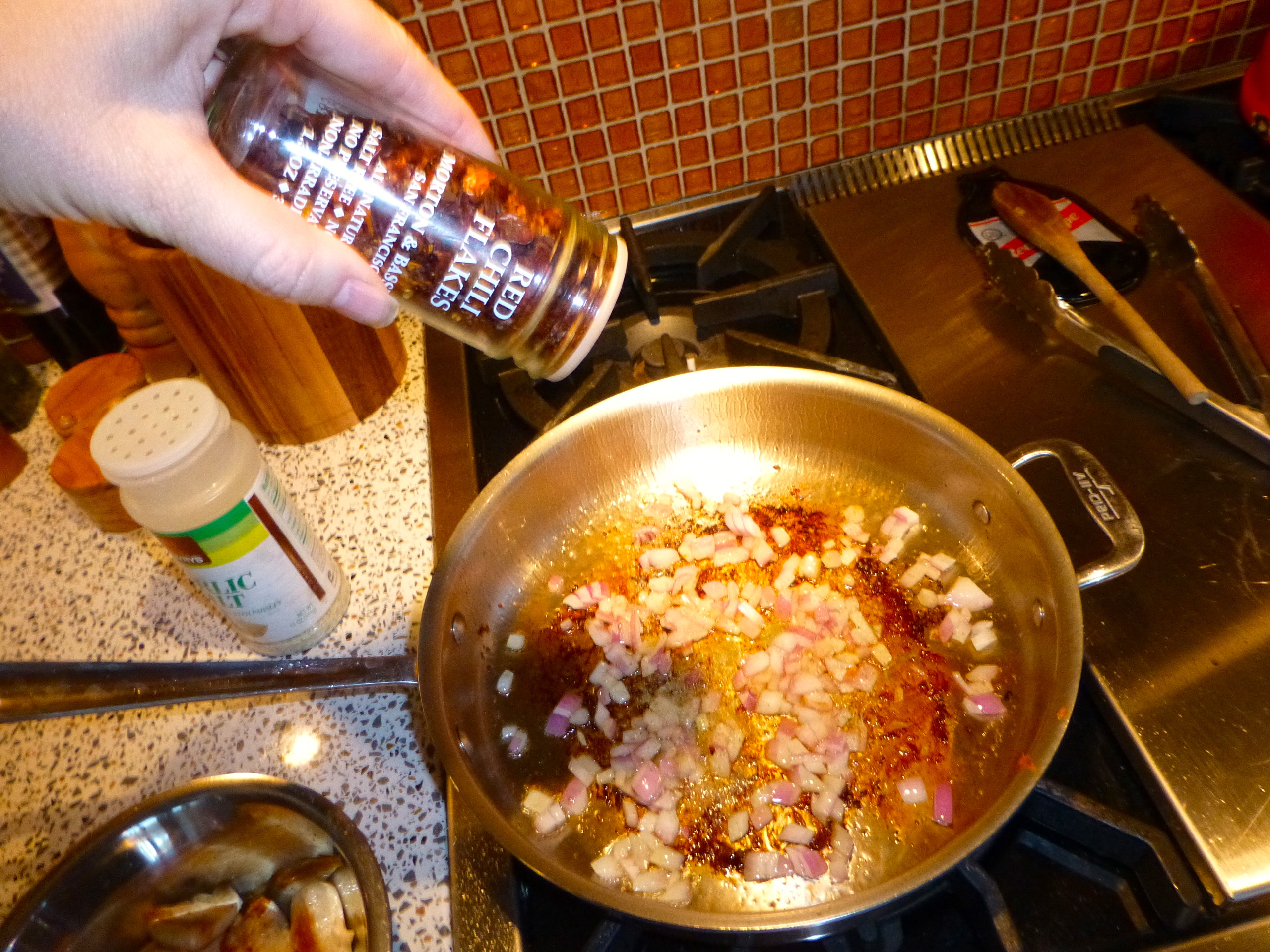 The chicken came out and half of the onion went in, along with MANY shakes of crushed red pepper. After a couple of minutes, I added half of the ginger and garlic and let it all soak up some of the chicken flavor in the pan.