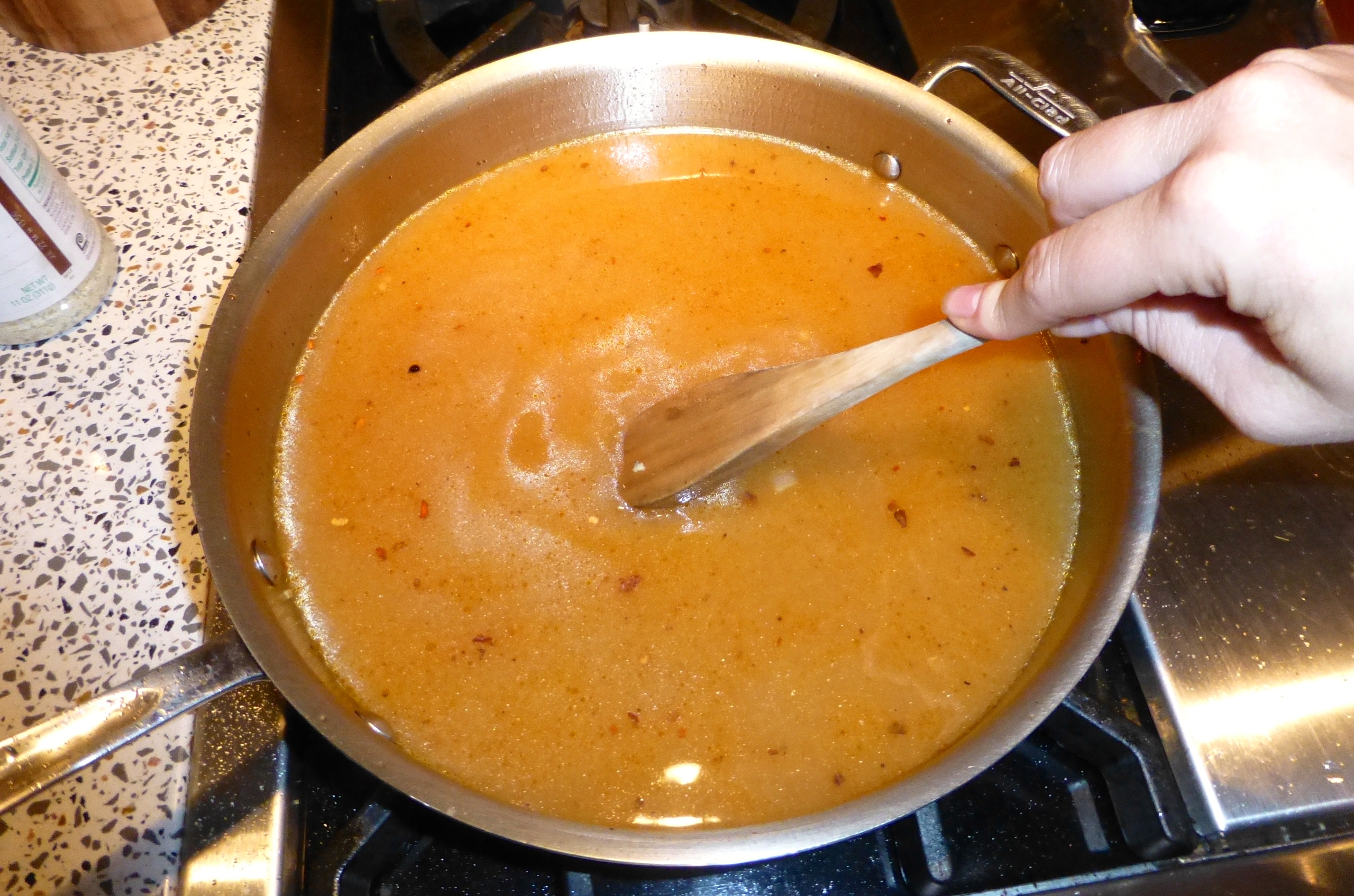 Return pan to medium high heat. Add 1 tablespoon olive oil. Add half of the onion, then half of the ginger and half of the garlic. Add crushed red pepper and a little garlic salt. Cook for a few minutes, then add the chicken stock, water, and wine. Bring to a boil, scraping the pan for the browned bits. Cover and simmer for 15 minutes.