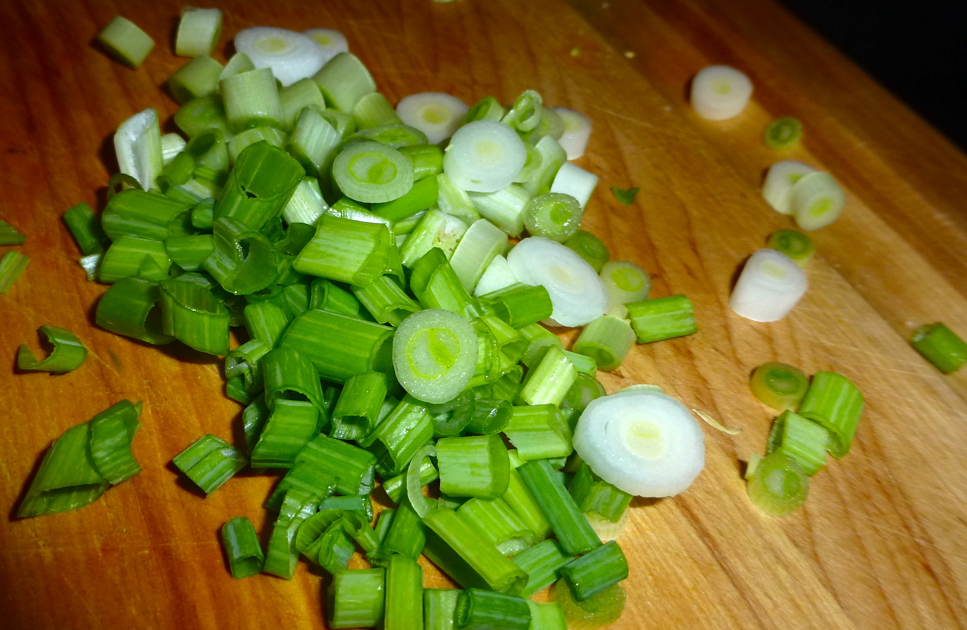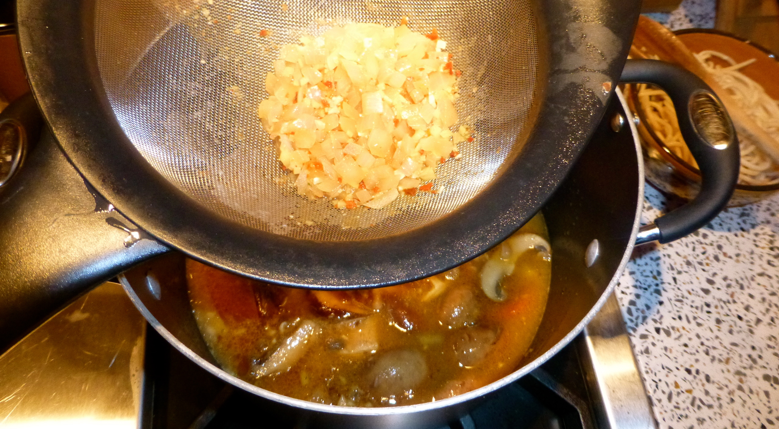 I chopped up some green onion and set it aside. It was time to add the liquids to the veggies, so I placed a strainer over the soup pot and poured it right in.