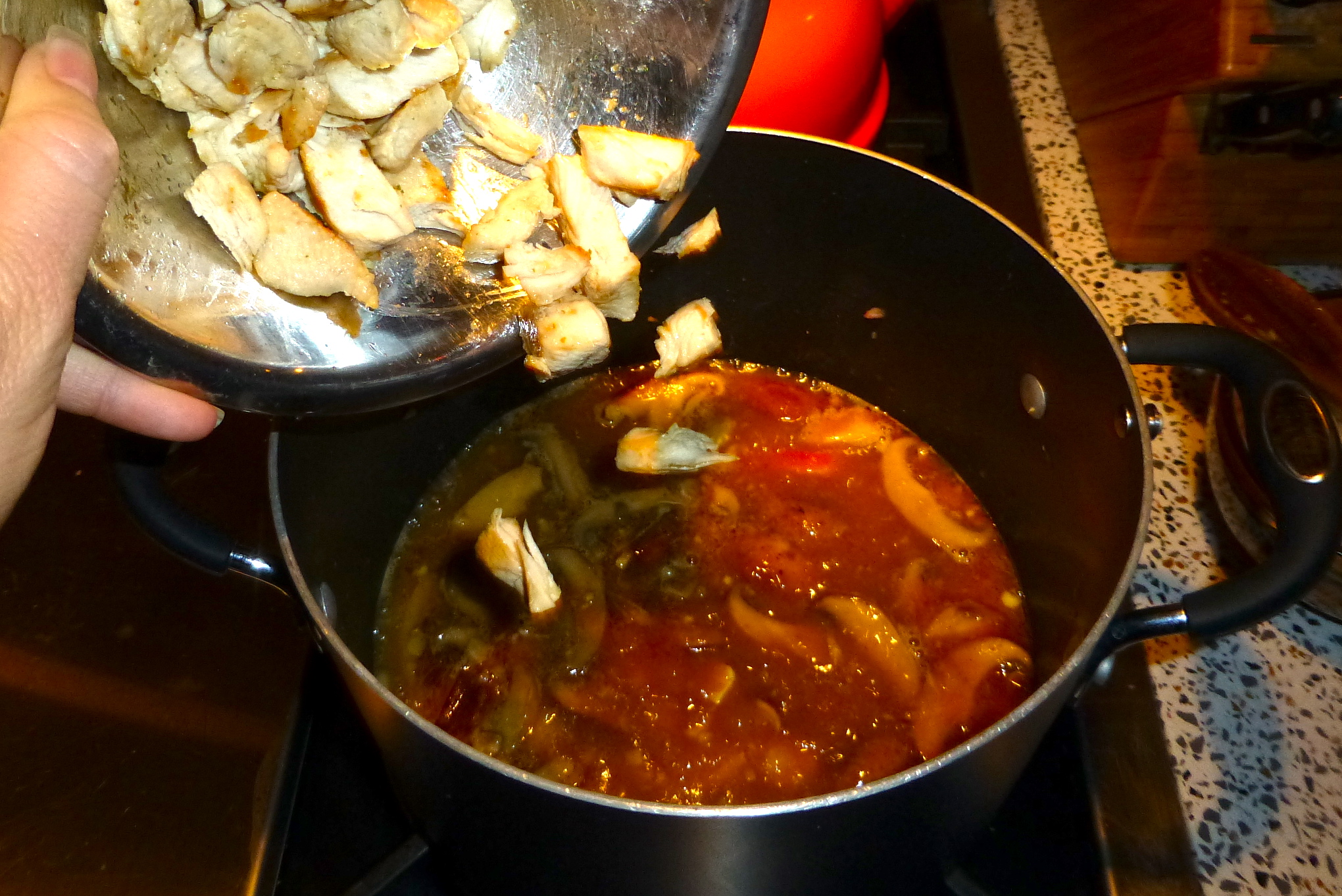 It was time to add some liquids and make this a soup! First came some chicken stock, then some water. On a whim, I poured in the rest of my glass of wine. I scraped the browned bits of yummy off of the bottom of the pan, put a lid on it, and let it simmer away for 15 minutes or so.