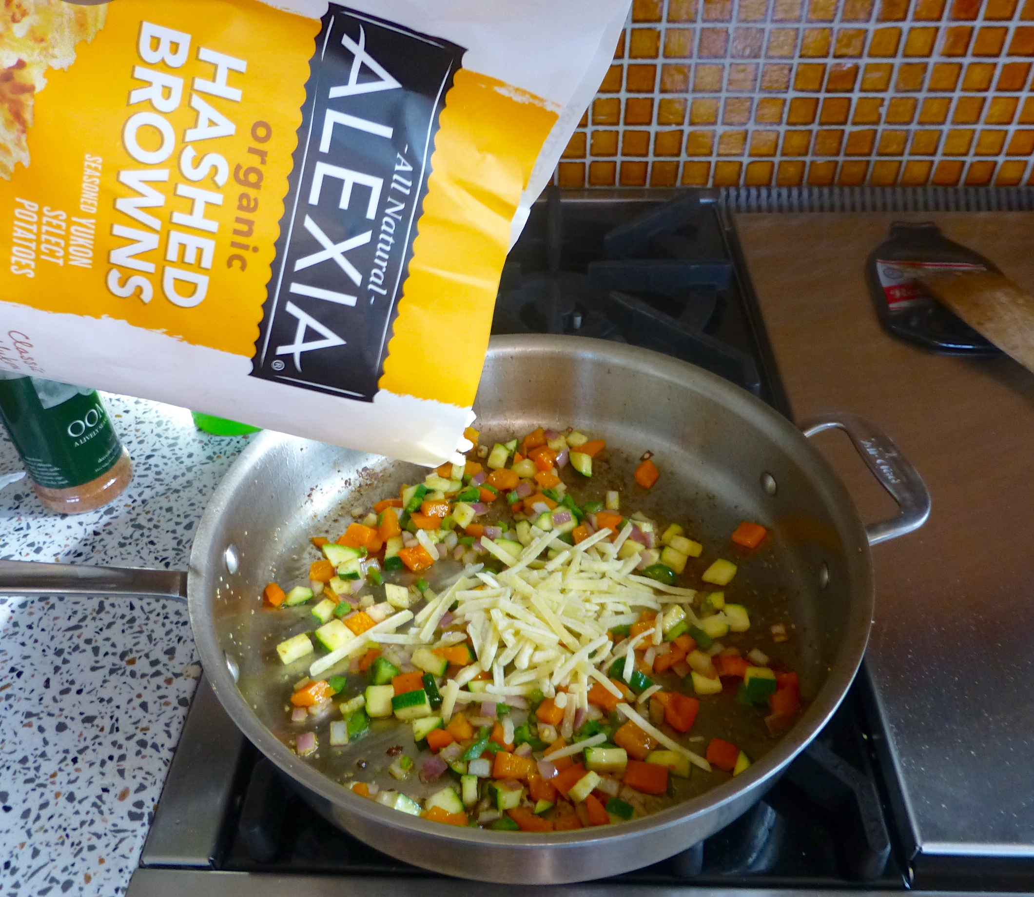 I removed the sausage from the pan and tossed in the veggies. I seasoned them up with the usual suspects (garlic salt, Mexican seasonings, crushed red pepper) and sautéed them for just a bit before adding shredded potatoes.