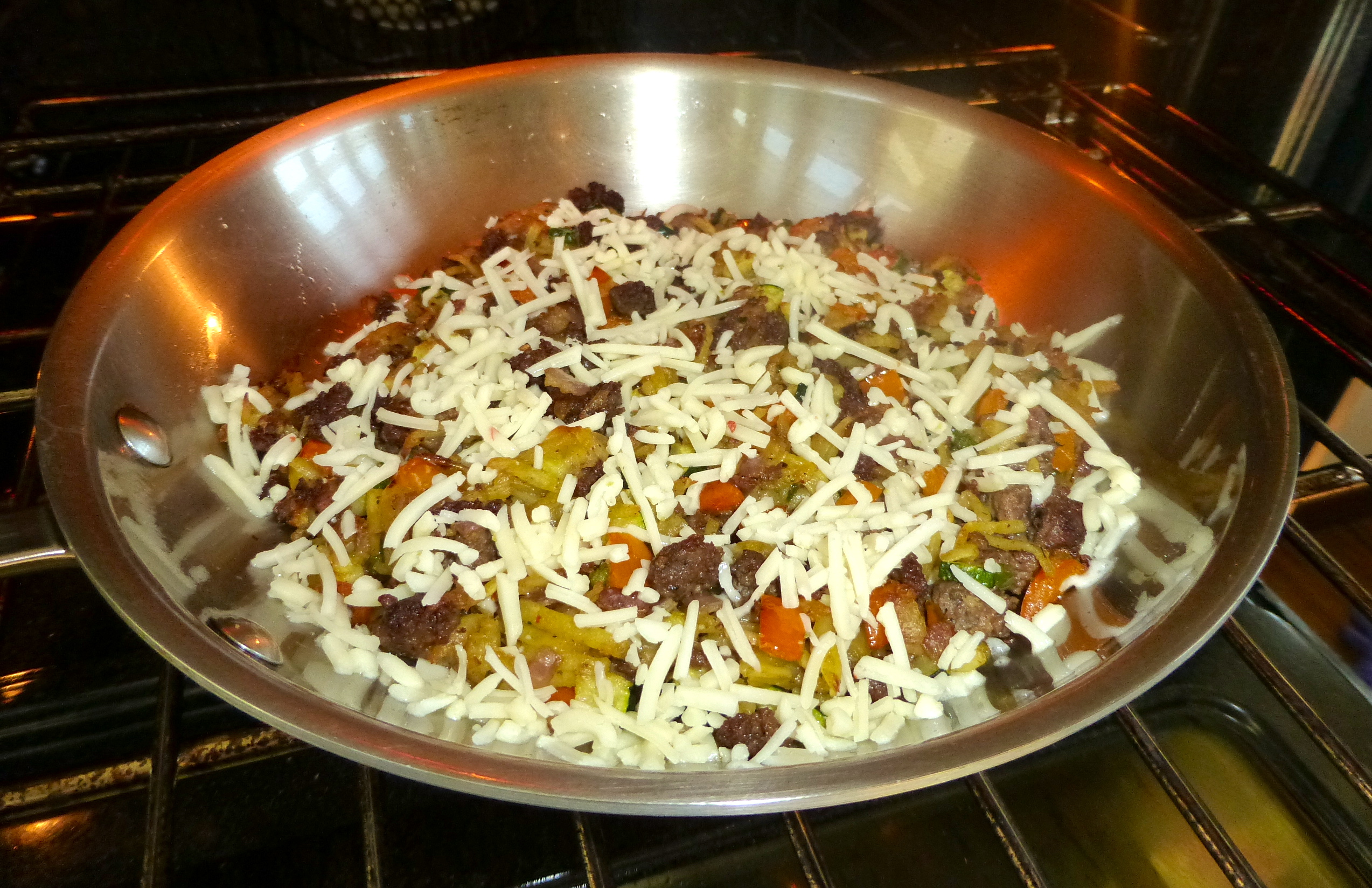 The last touch to the sausage-potato hash was a generous sprinkling of cheese. Once the cheese had melted, it was time to eat!