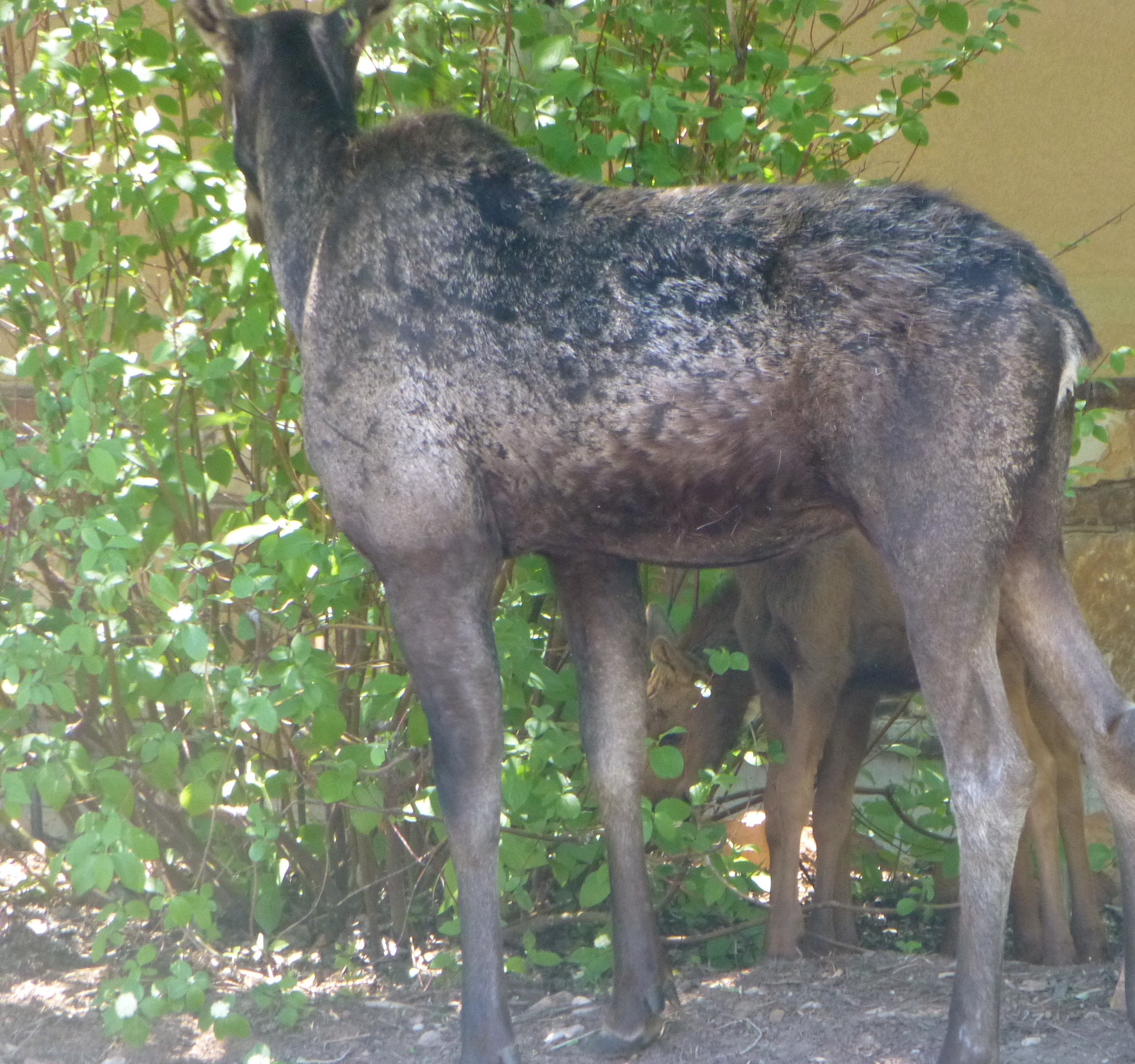 A skinny mama moose and her TWO babies, in my neighbor’s yard.