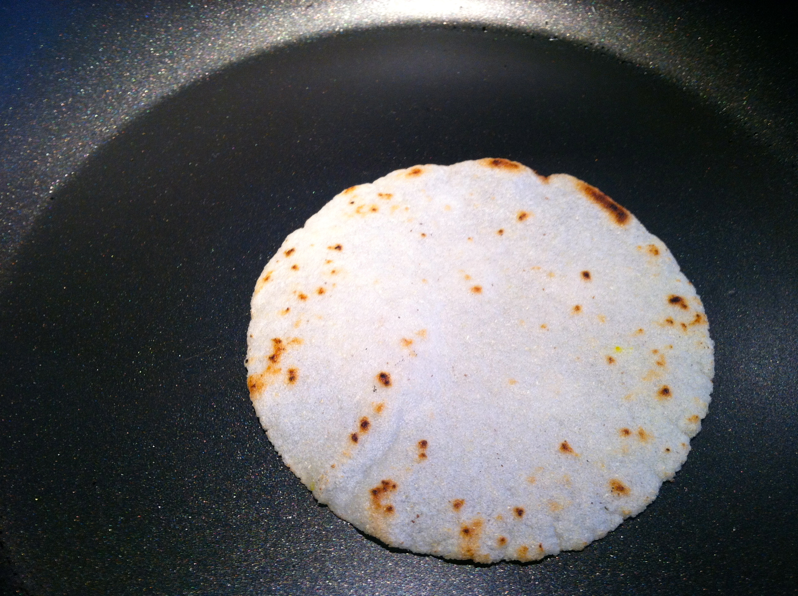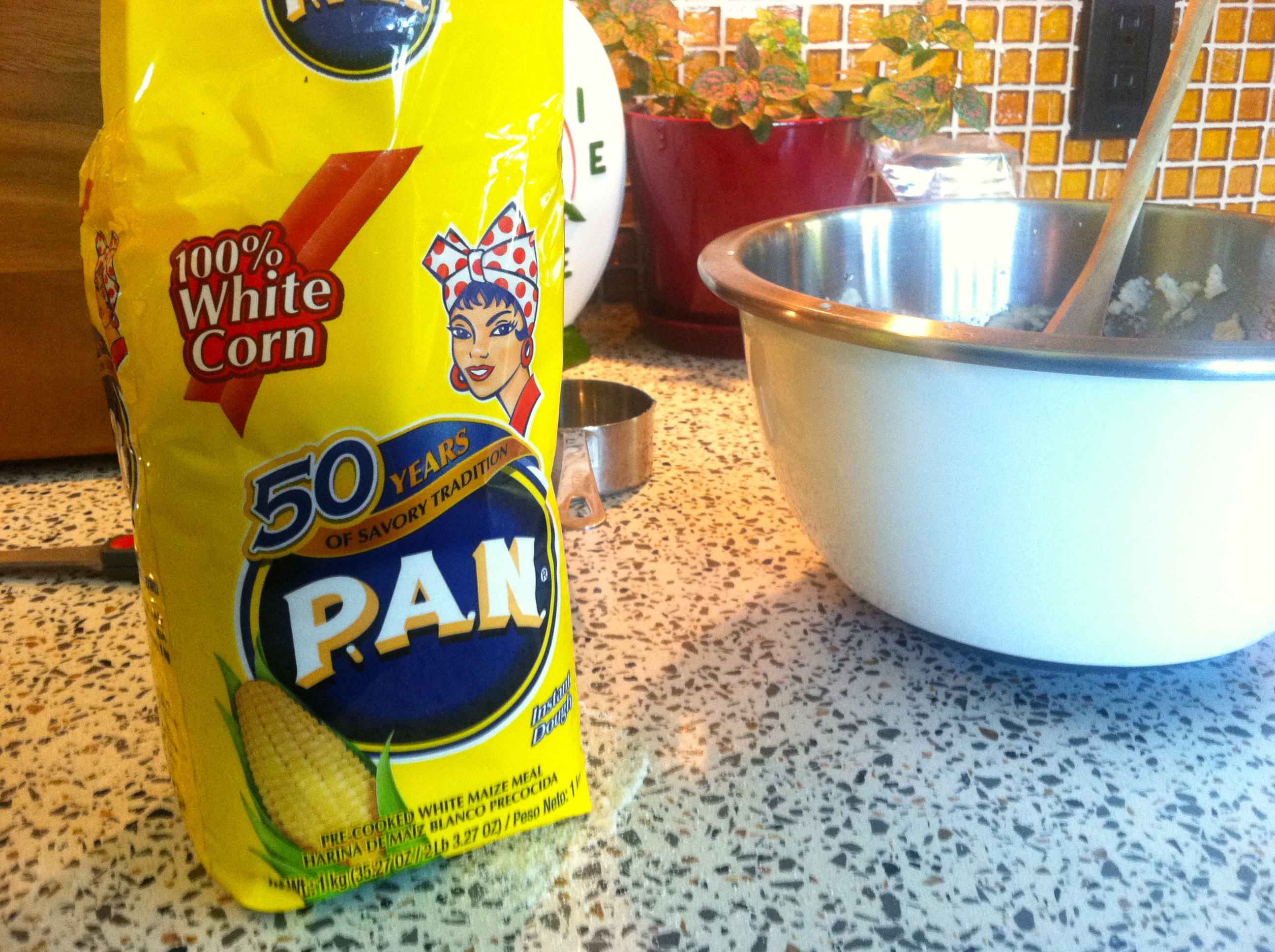 1. It was really easy. I bought some white corn flour mix called PAN in the aisle with Mexican food. You simply add water, roll the dough into little balls, smoosh them to be flat (we used a tortilla press), and cook them in a pan or griddle! They were yummy and you could flavor them somehow, I bet.