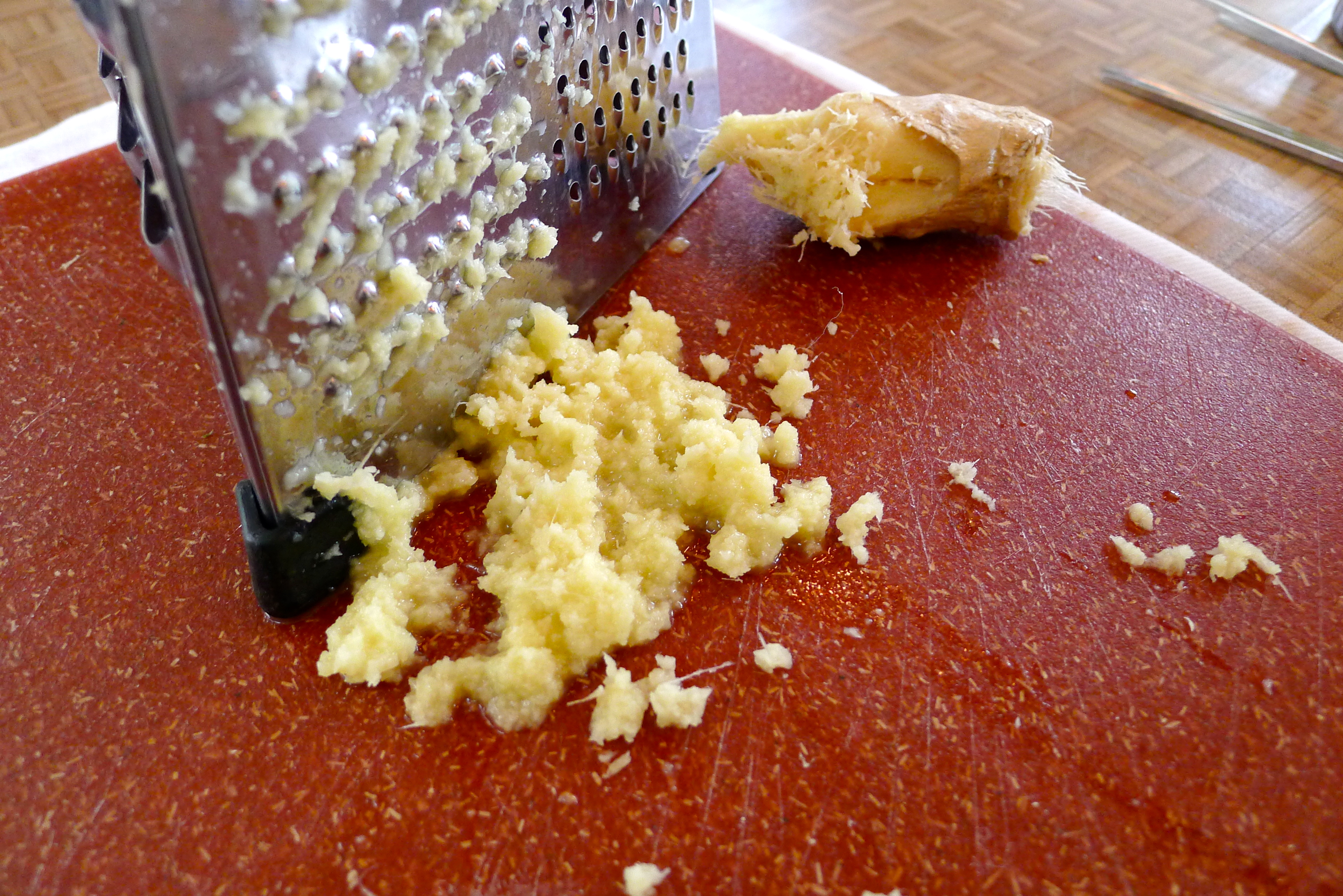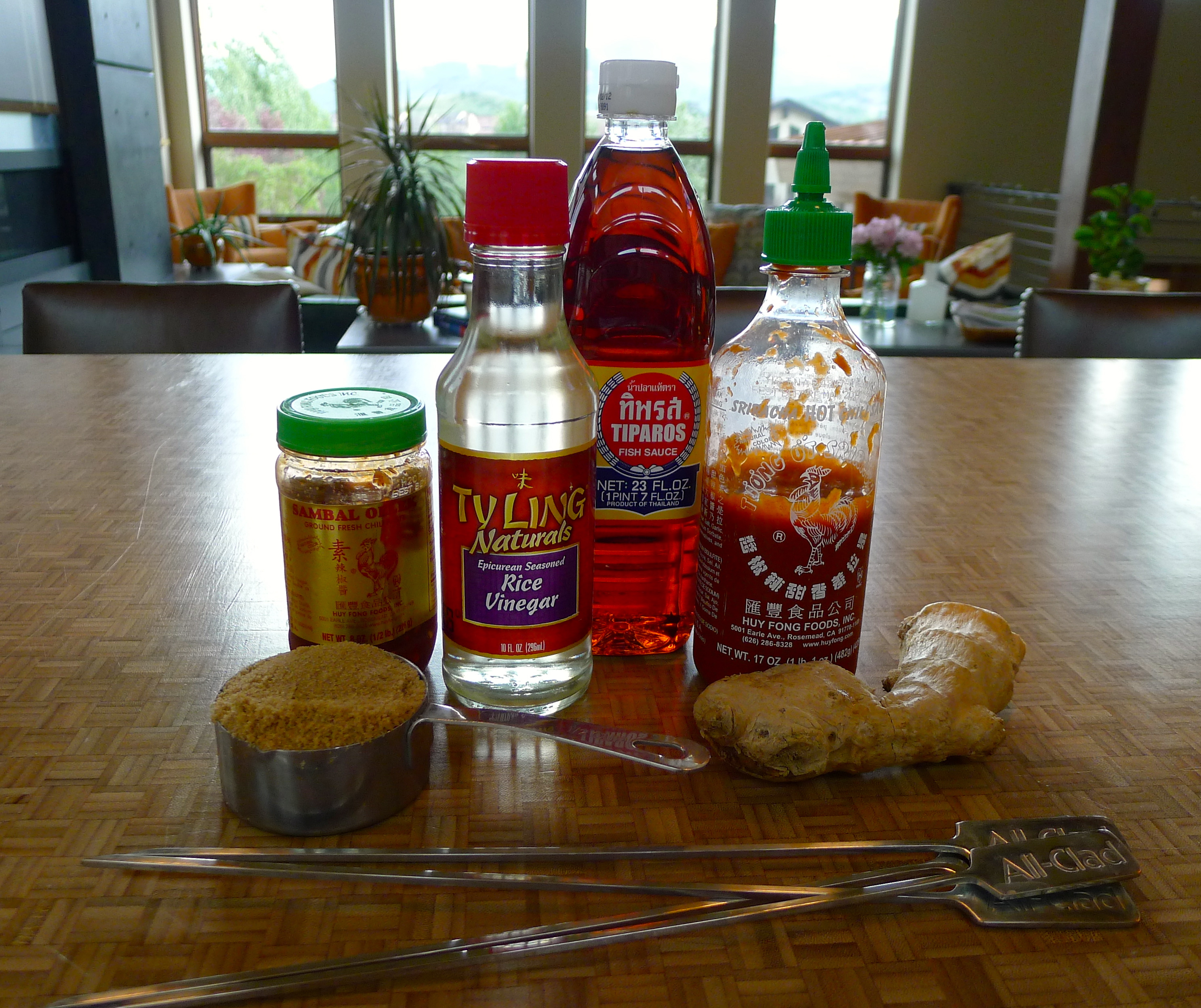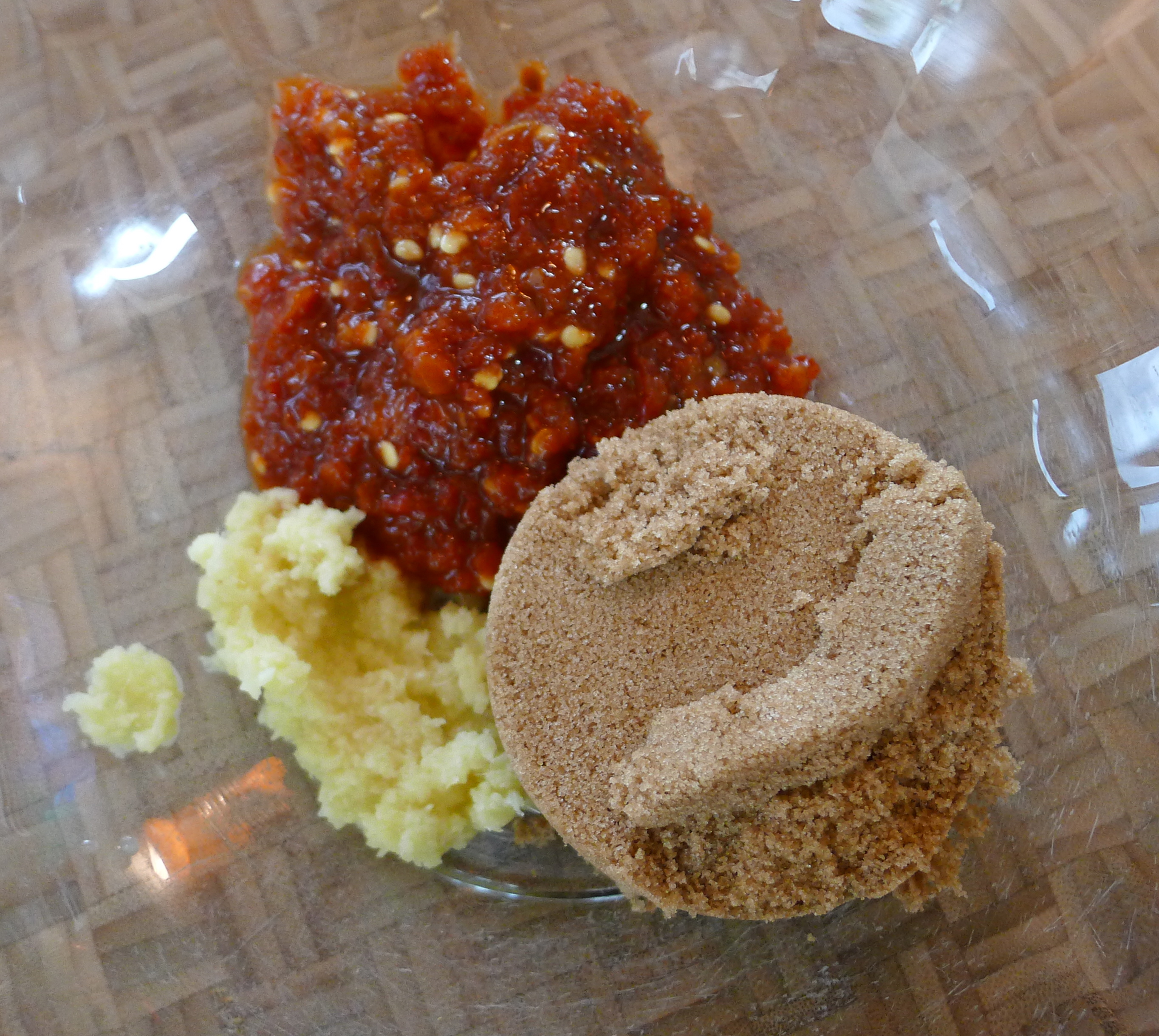 The sauce actually has more sambal (spicy chili paste) in it than Sriracha. I put it in a bowl with the grated ginger and some brown sugar. Spicy sweet? Yes, please!