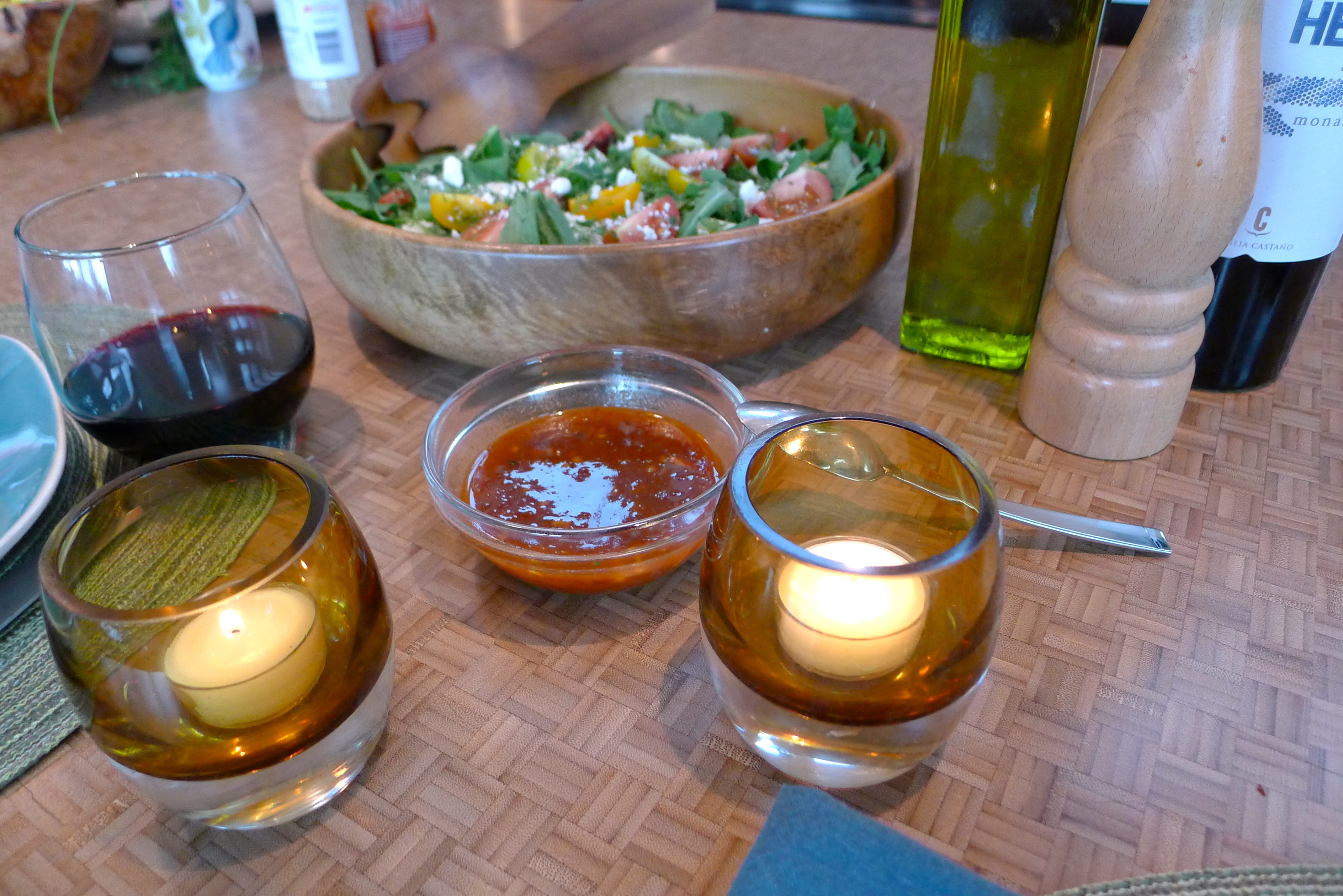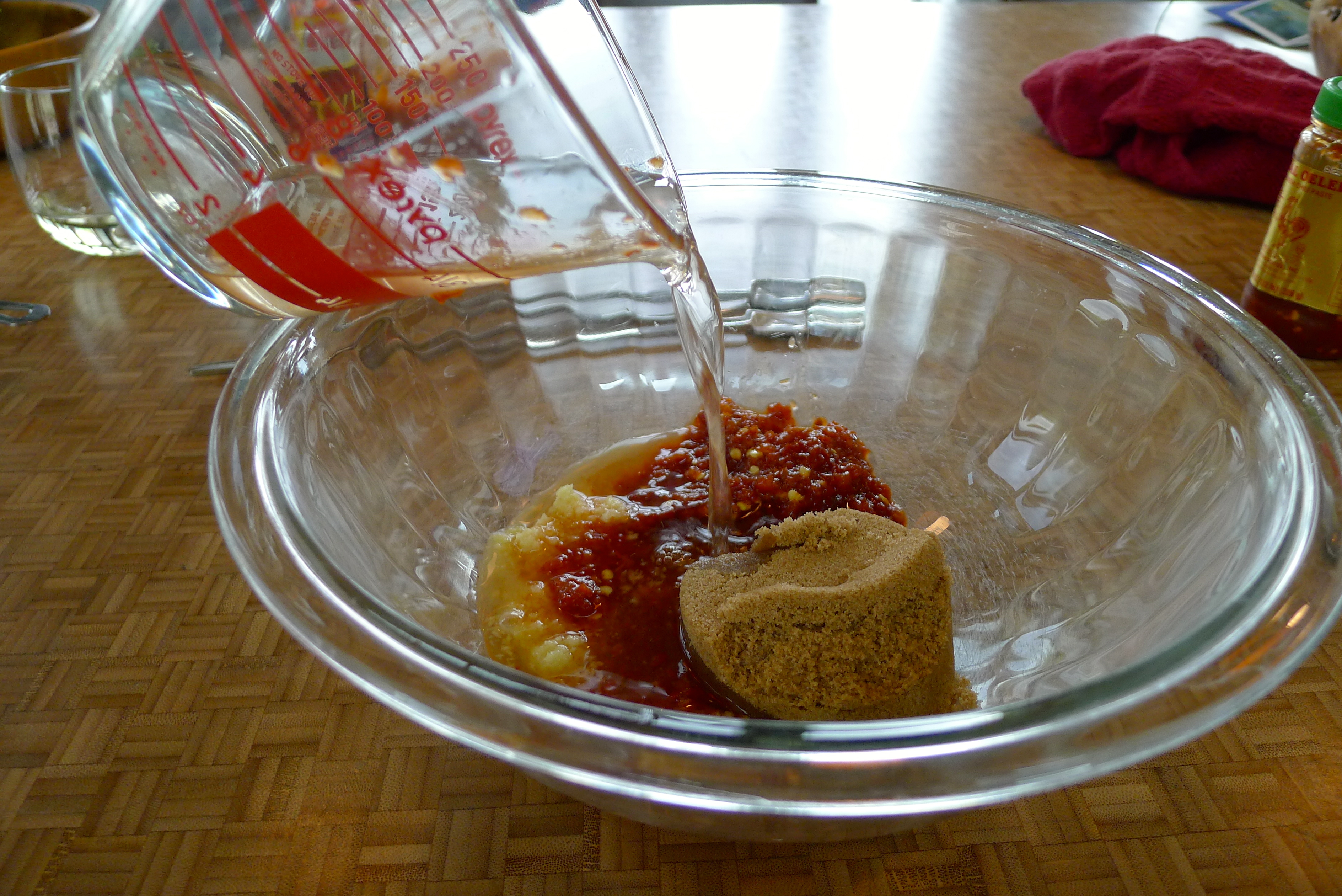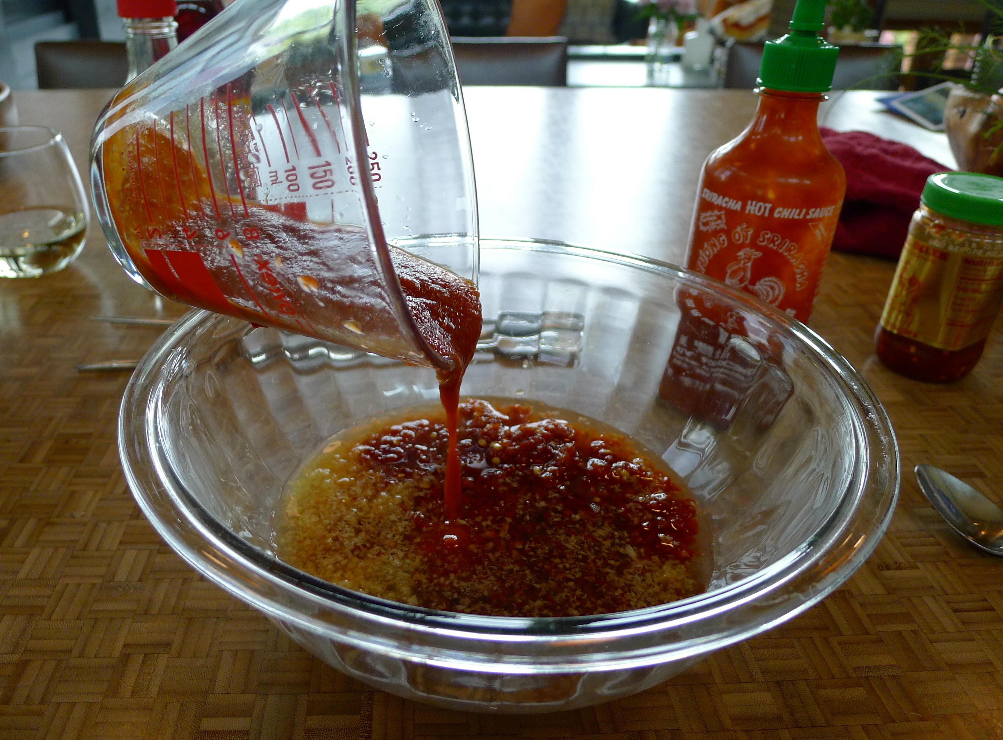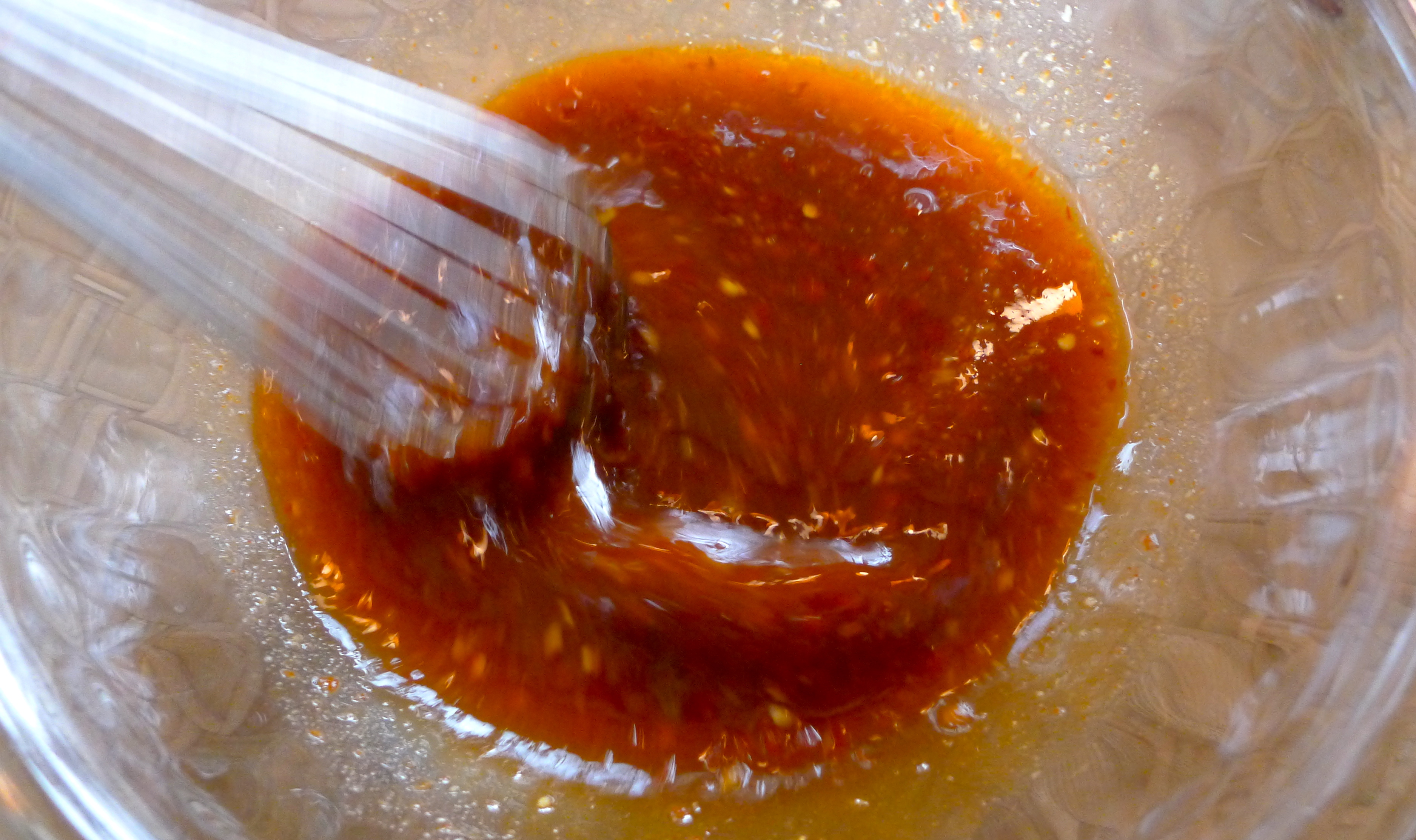 Next came some rice vinegar, the fish sauce, and our household’s favorite Asian condiment– the Sriracha. A quick whisk, and we’re DONE!