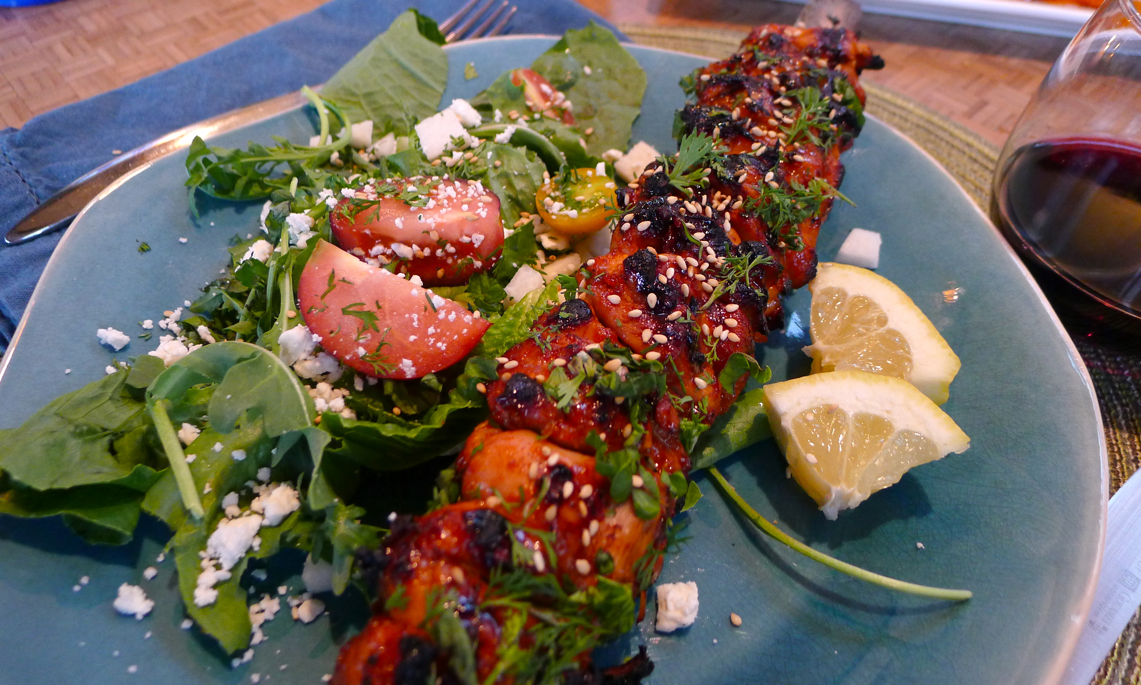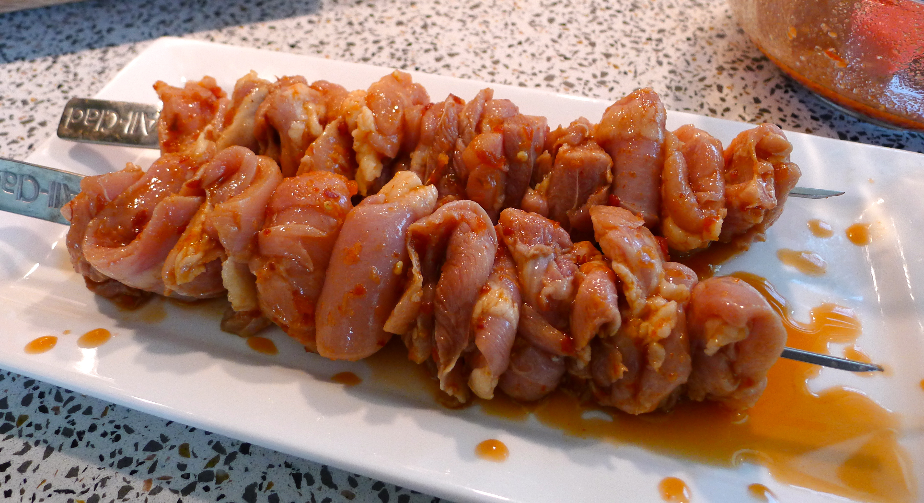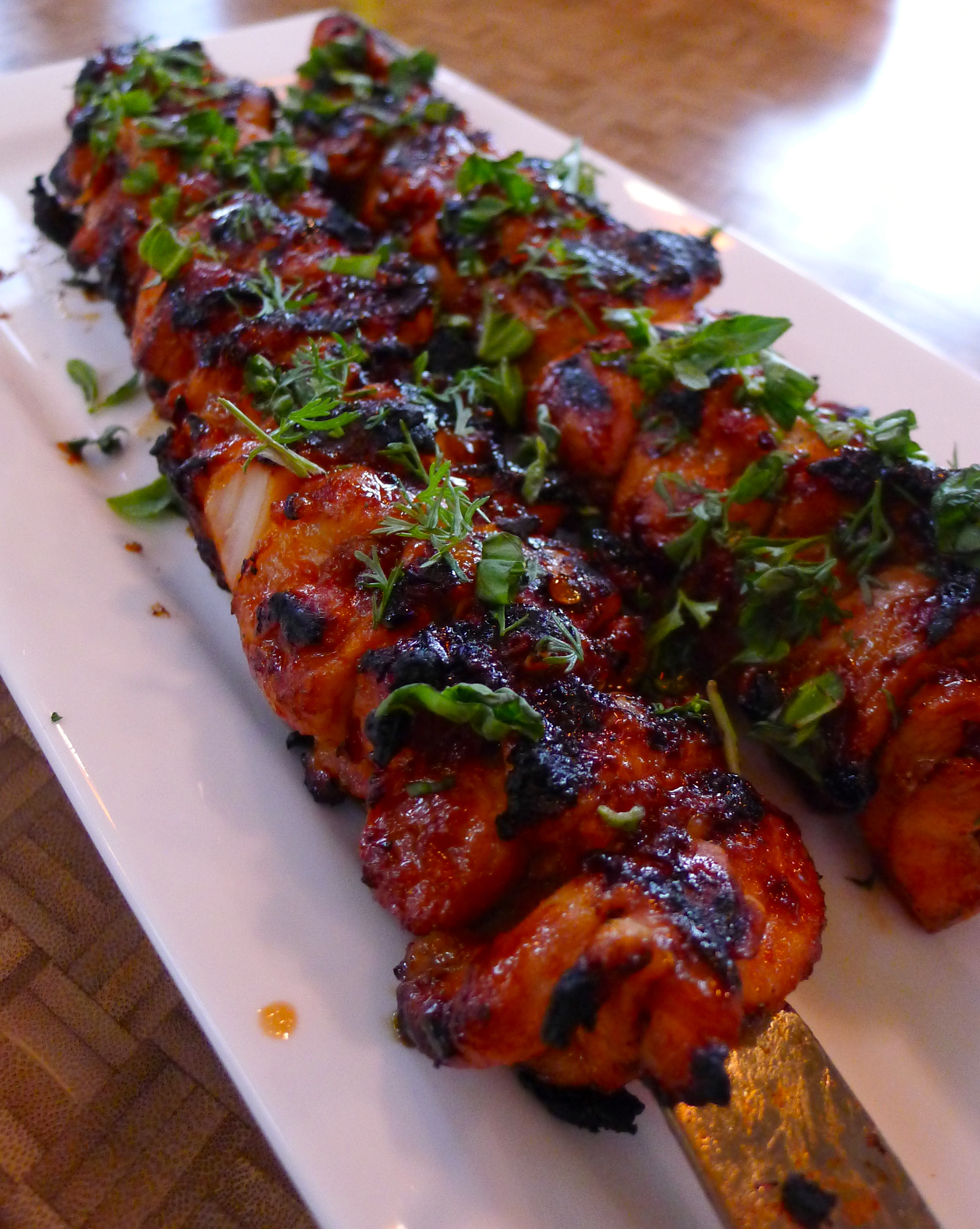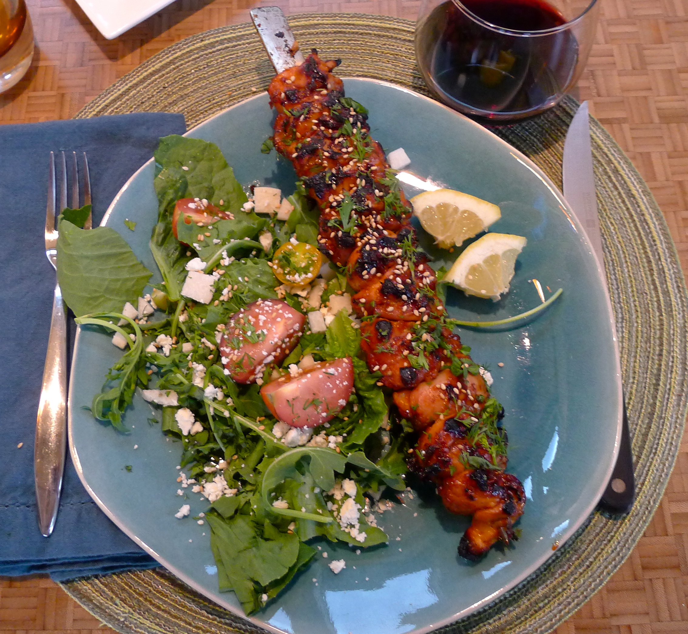 It’s not a marinade, so the chicken doesn’t need to spend time swimming in the sauce, but I had laundry to fold so I left it for a half hour or so. I skewered the chunks onto metal skewers for John to grill, and simmered the remaining sauce on the stove.