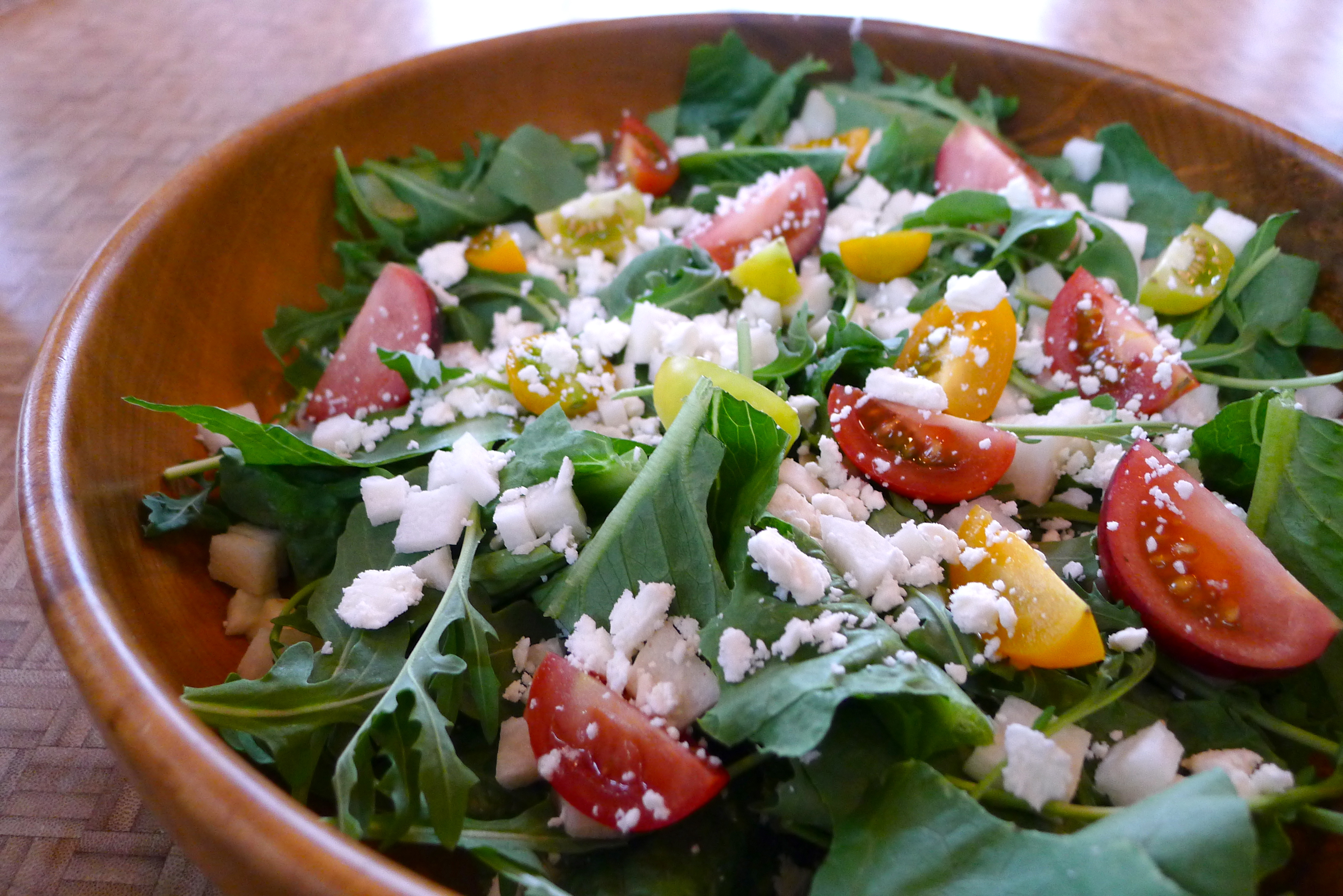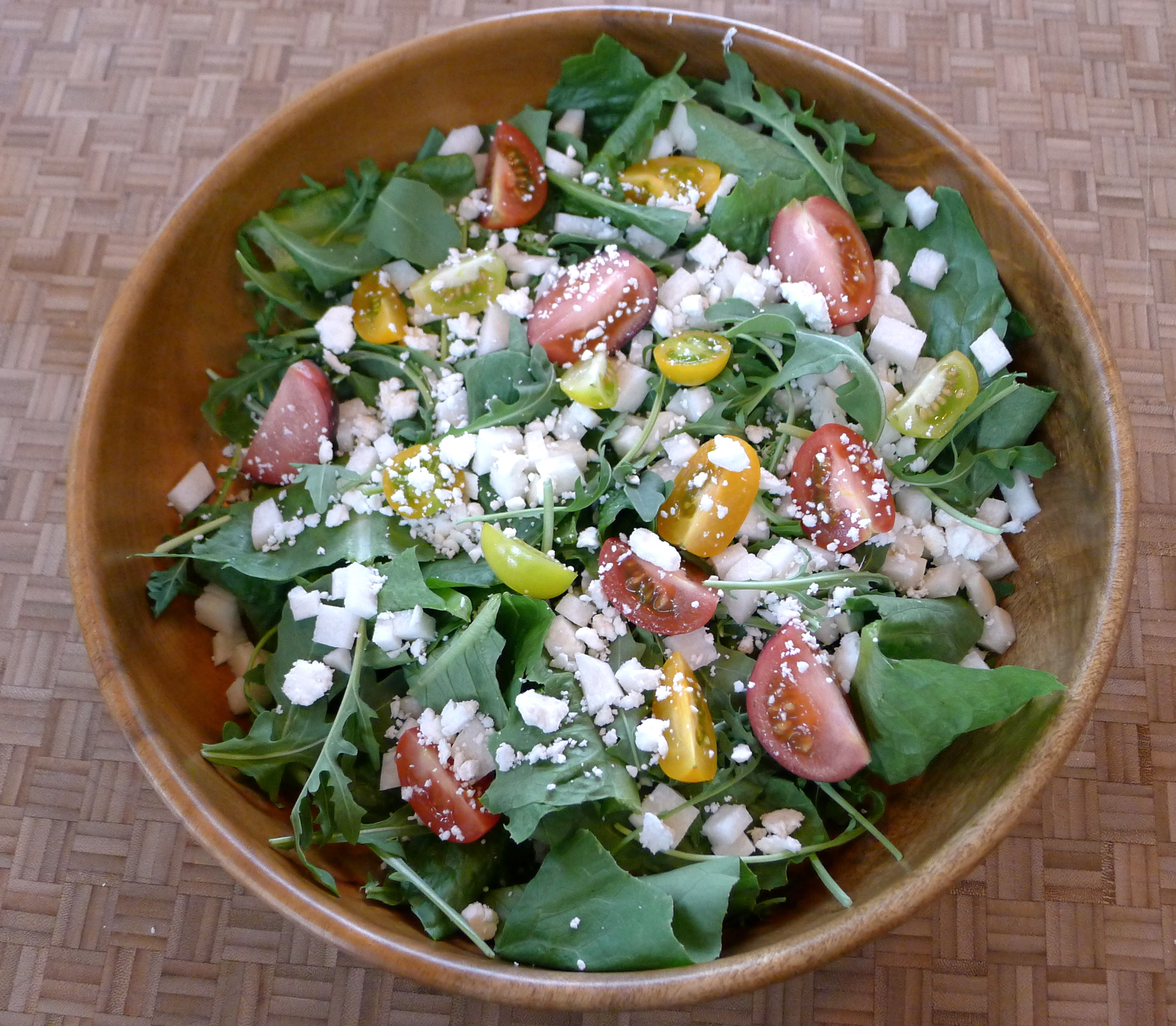 While John finished up the chicken, I made a salad: homegrown romaine, some arugula, diced jicama, baby heirloom tomatoes, feta cheese, and some homegrown chives, basil, and cilantro. I love eating out of our backyard!