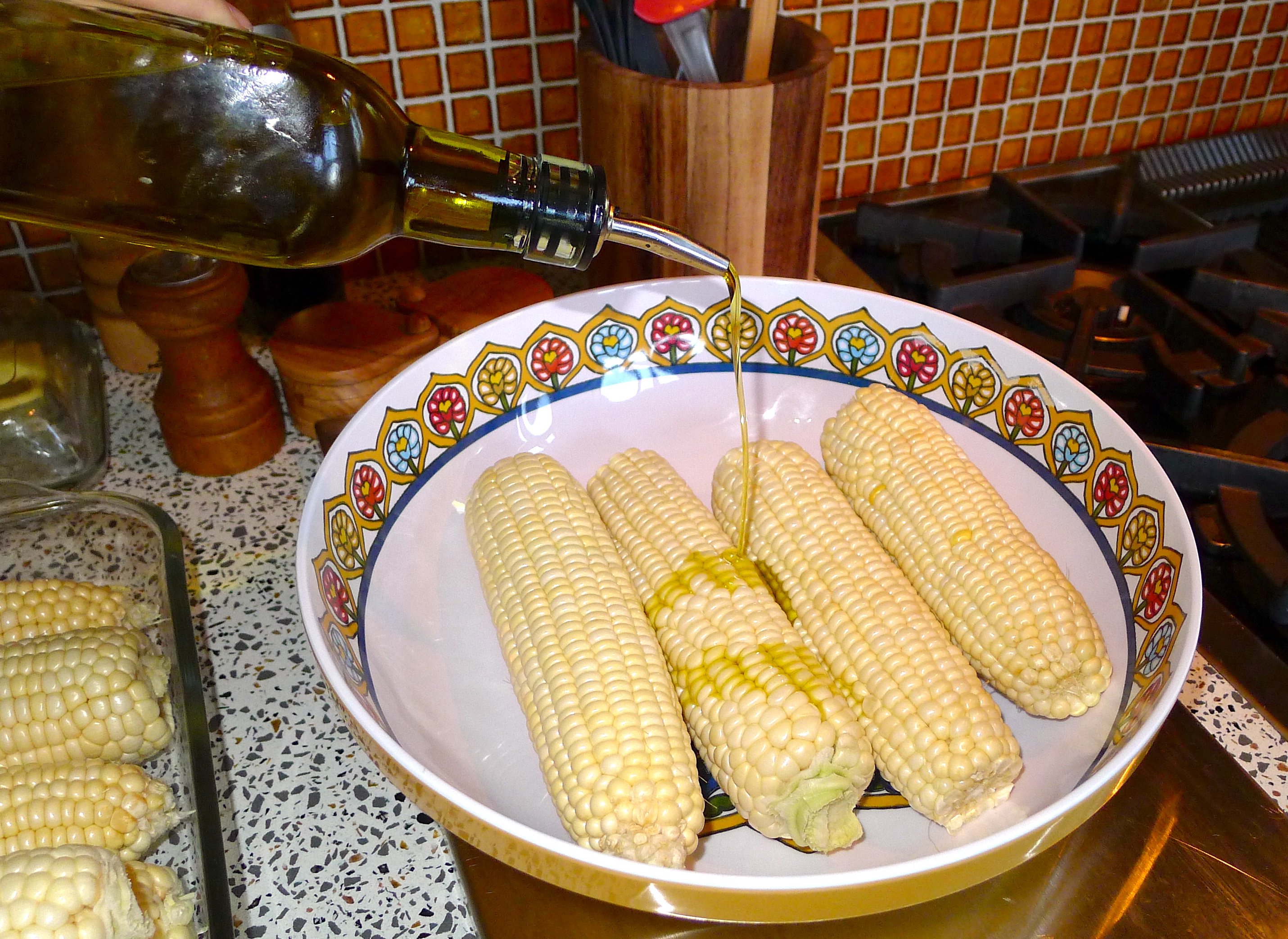 Preheat grill to medium high. Shuck corn and brush with olive oil. Place on grill, turning regularly, until all sides are charred (15 minutes). Remove from heat and set aside to cool.