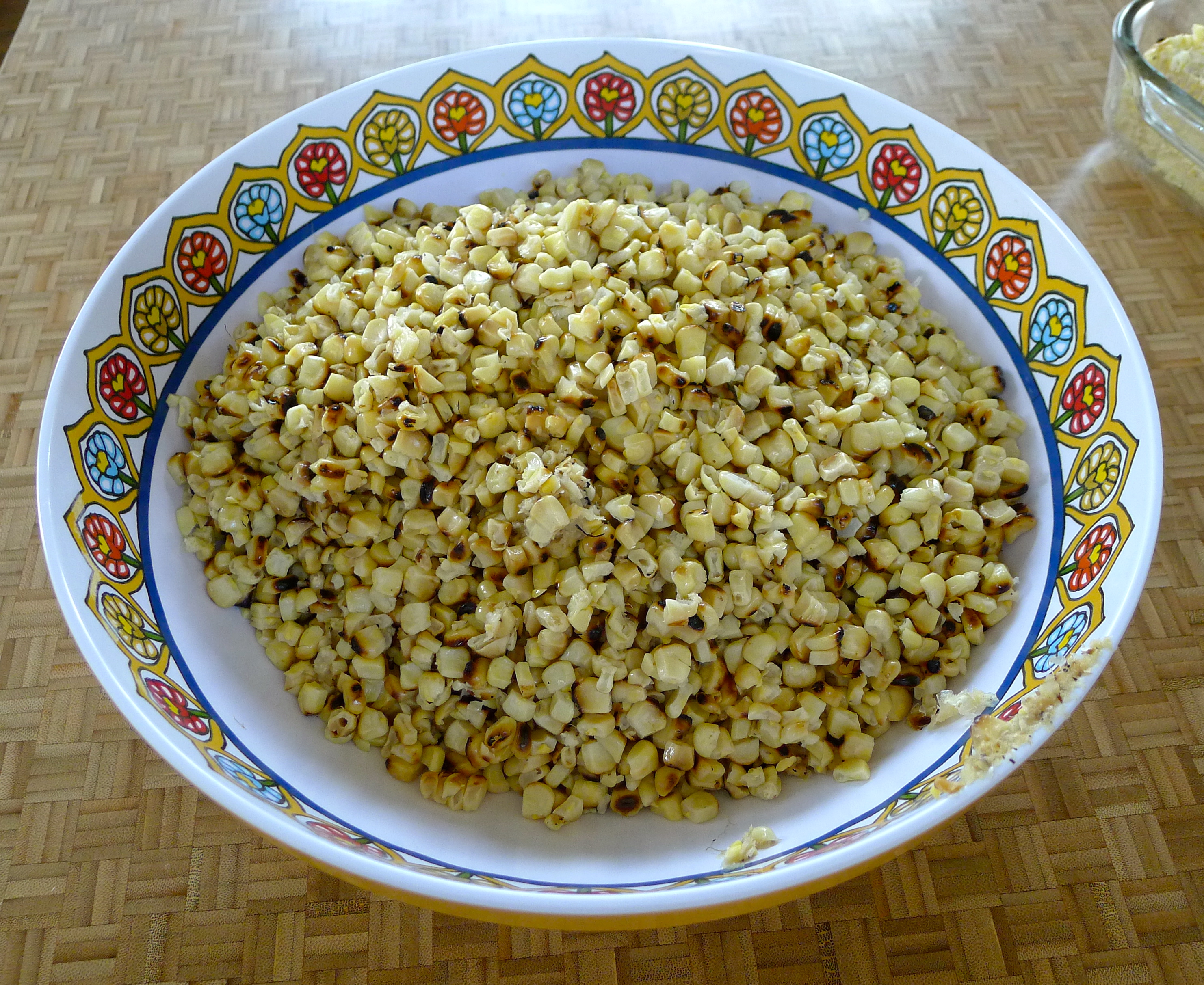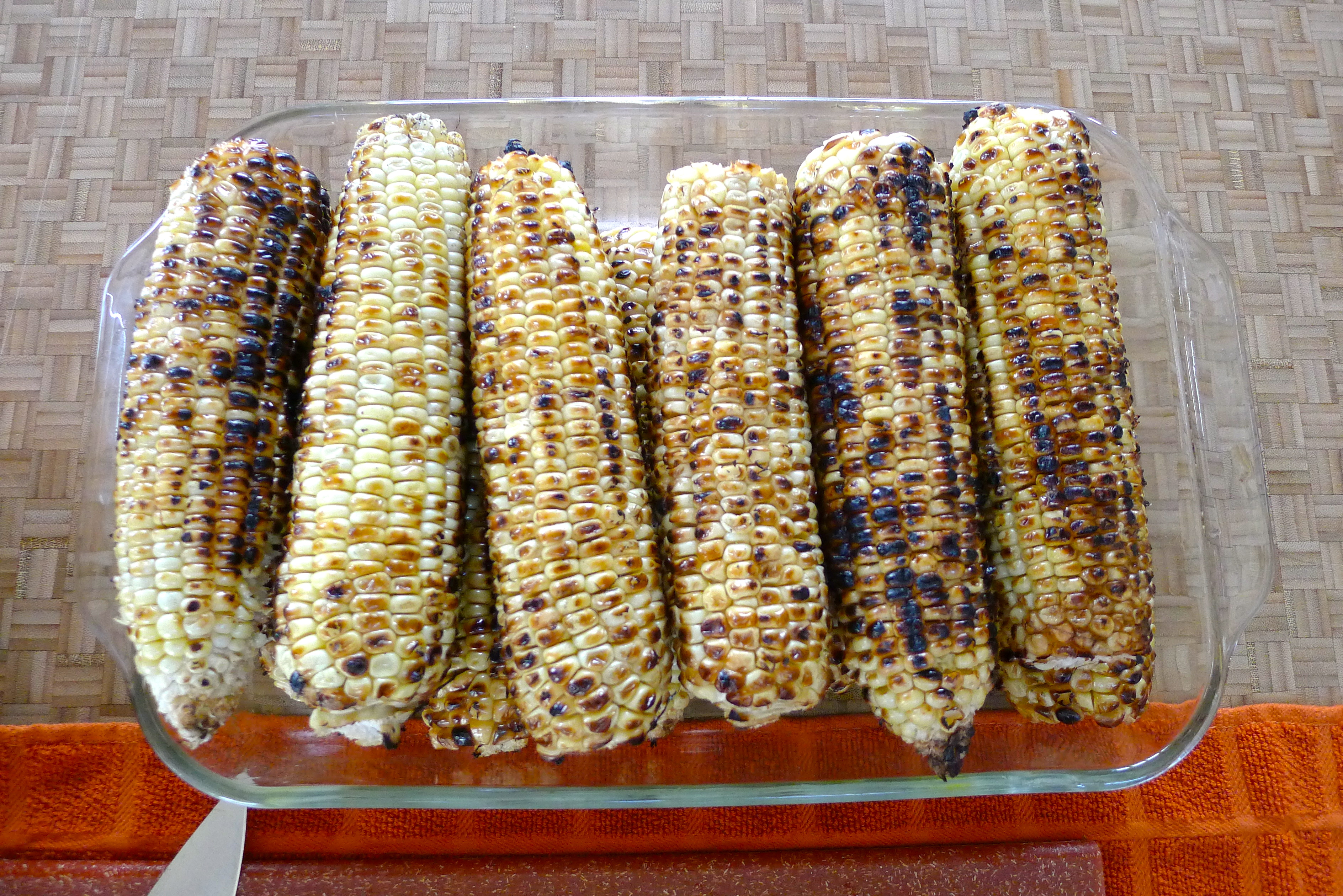 I rubbed the cobs with olive oil before I started charring it. Too many cobs on the grill seemed to slow down the process, so I gave them some space. The kitchen smells like freshly-popped popcorn when I char corn. (Maybe that’s why Cholula stayed within two feet of me.) Look at those browned beauties!