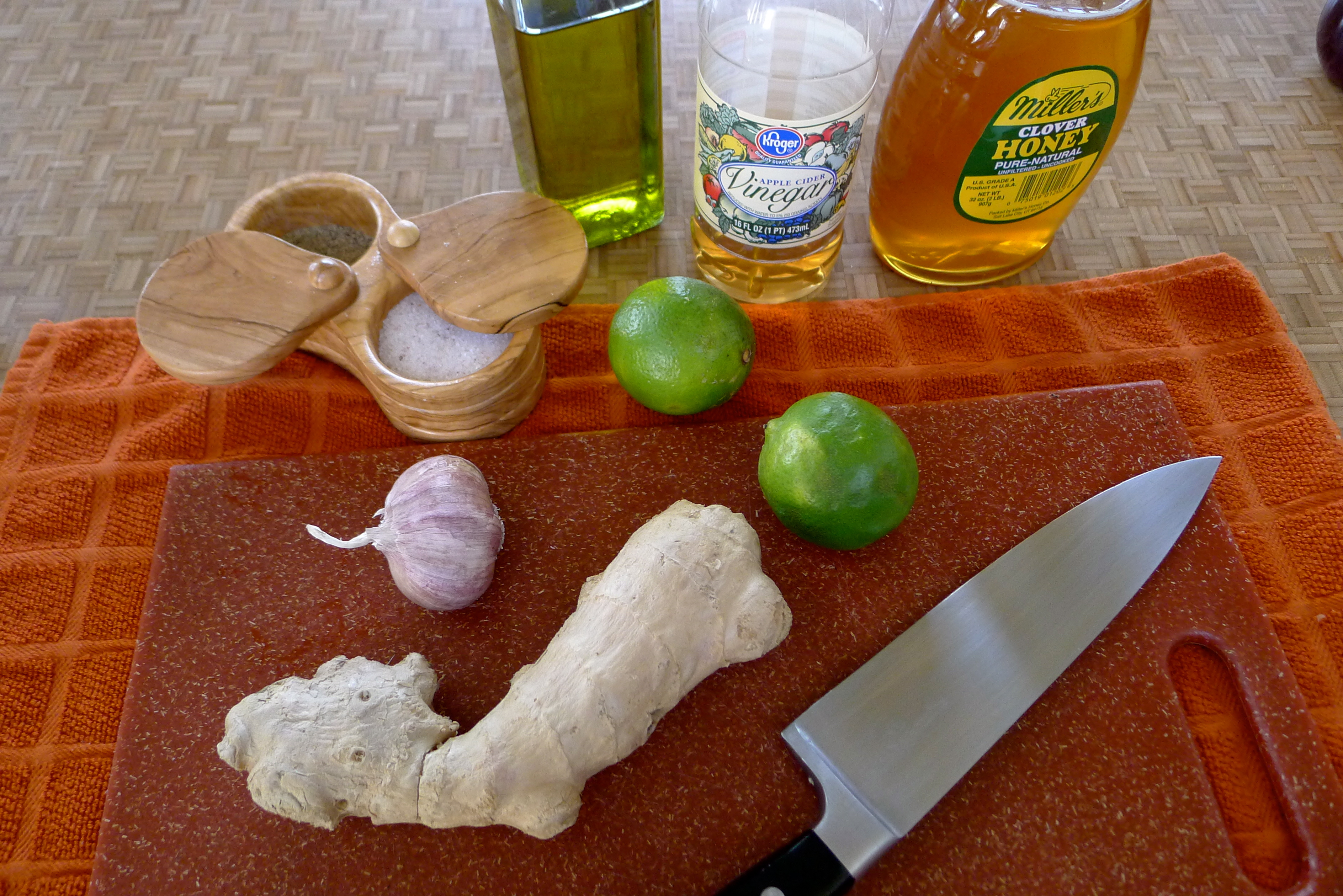 Combine garlic, ginger, lime juice, vinegar, and honey in a jar with a lid. Add the olive oil, seal the jar, and shake away. Season with salt and pepper; set aside.
