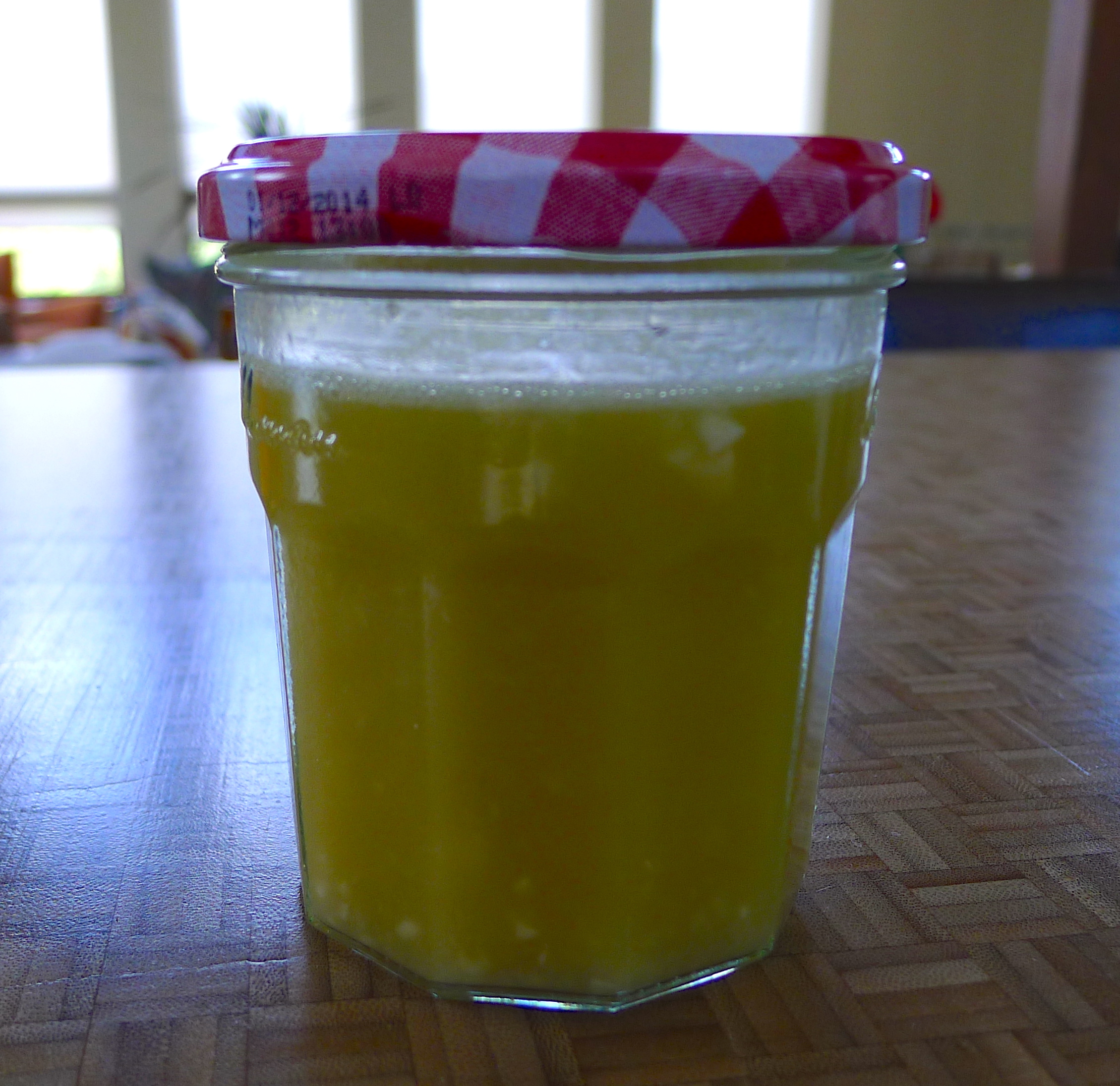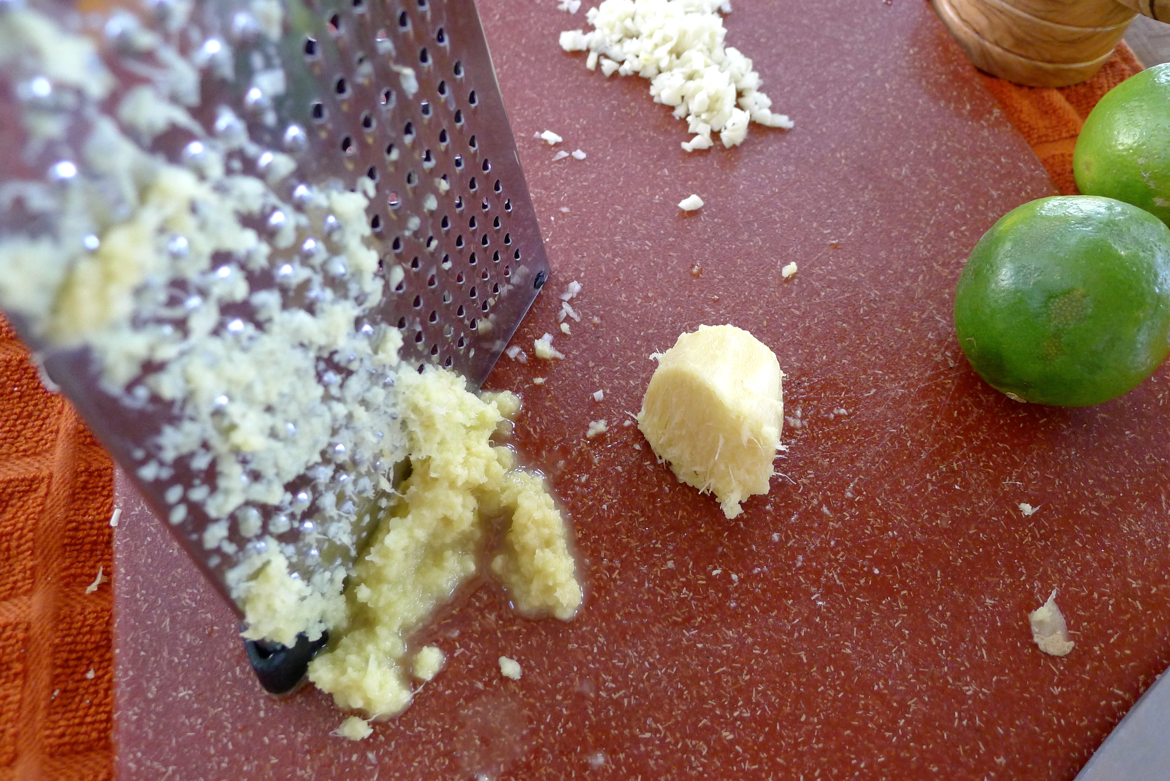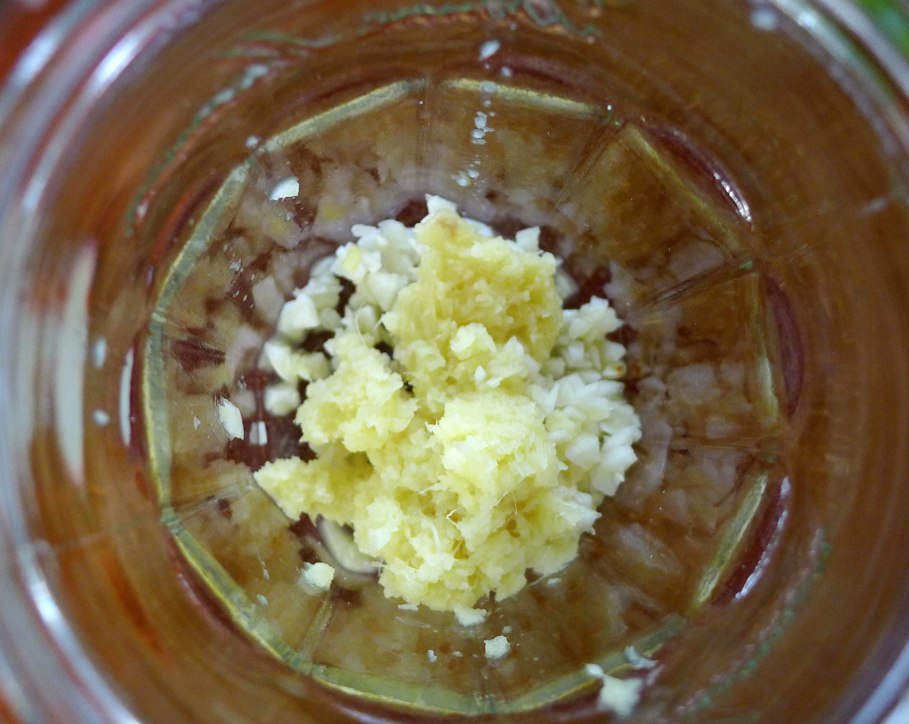 Since I tripled the recipe, it seemed like I was making a lot of dressing- like maybe too much. I’m not a fan of over-dressed salads. Trust me- the amount is ideal! I started by peeling and grating fresh ginger and chopping up garlic. I tossed them right into a cute little leftover jam jar- we have a ton of them!