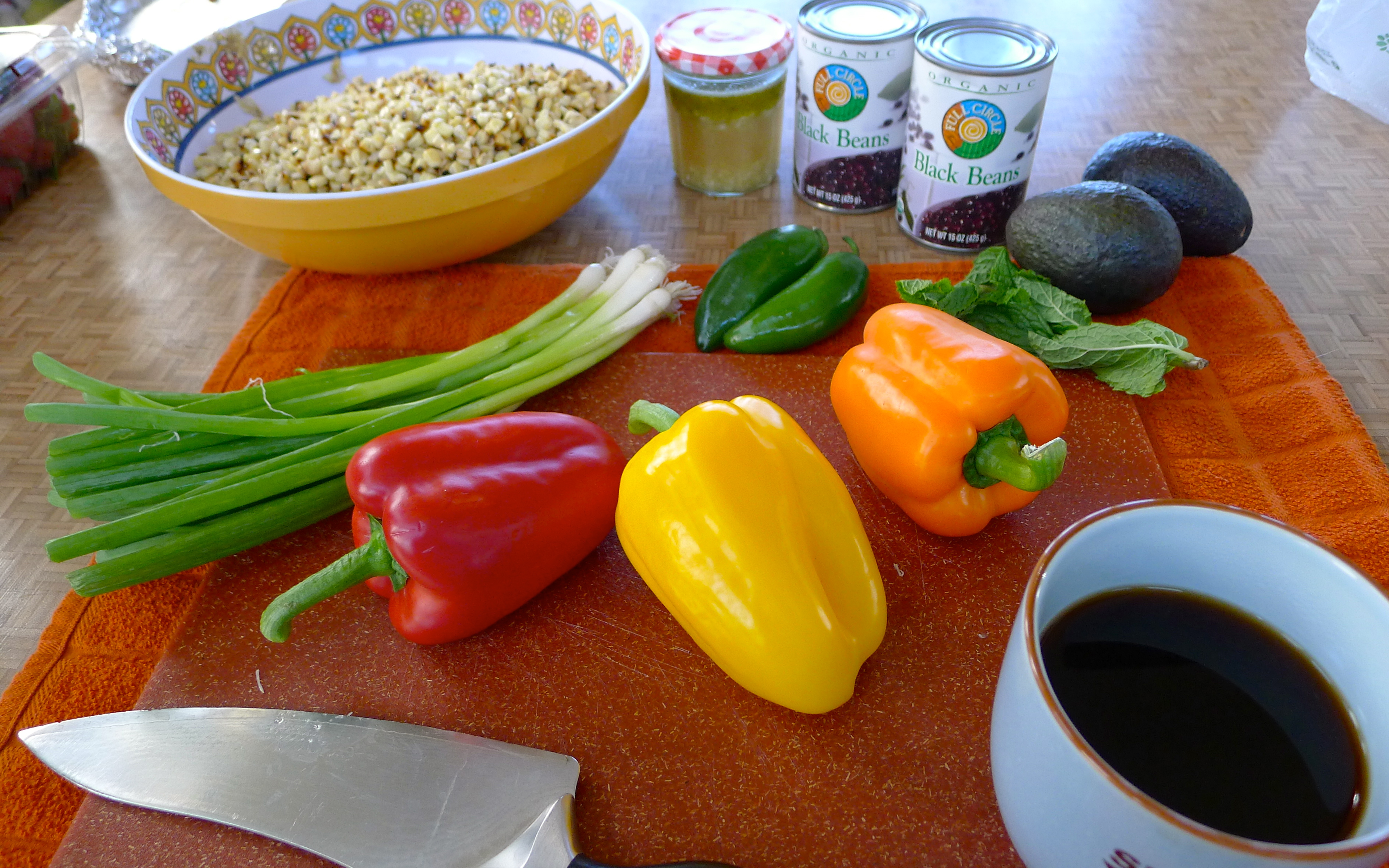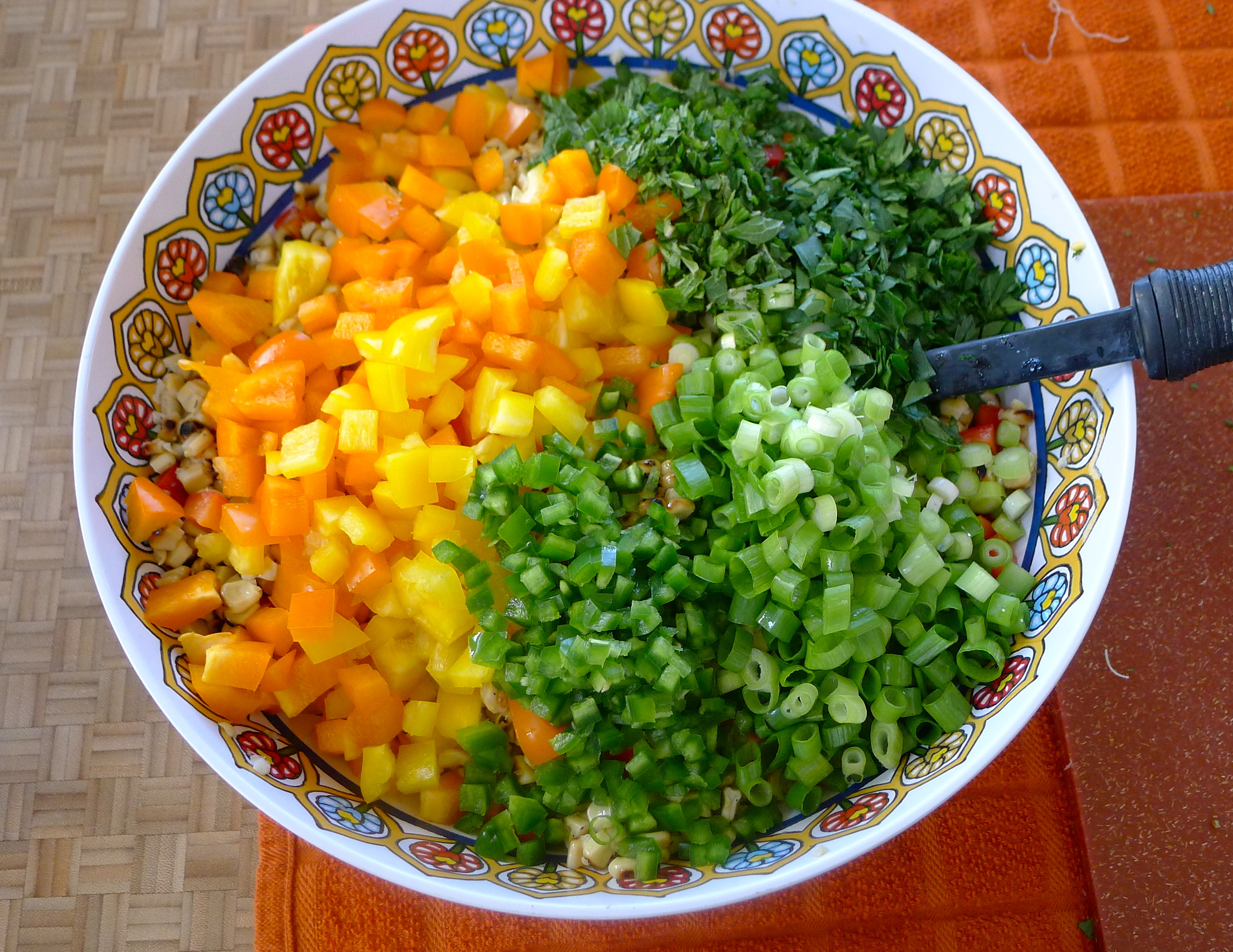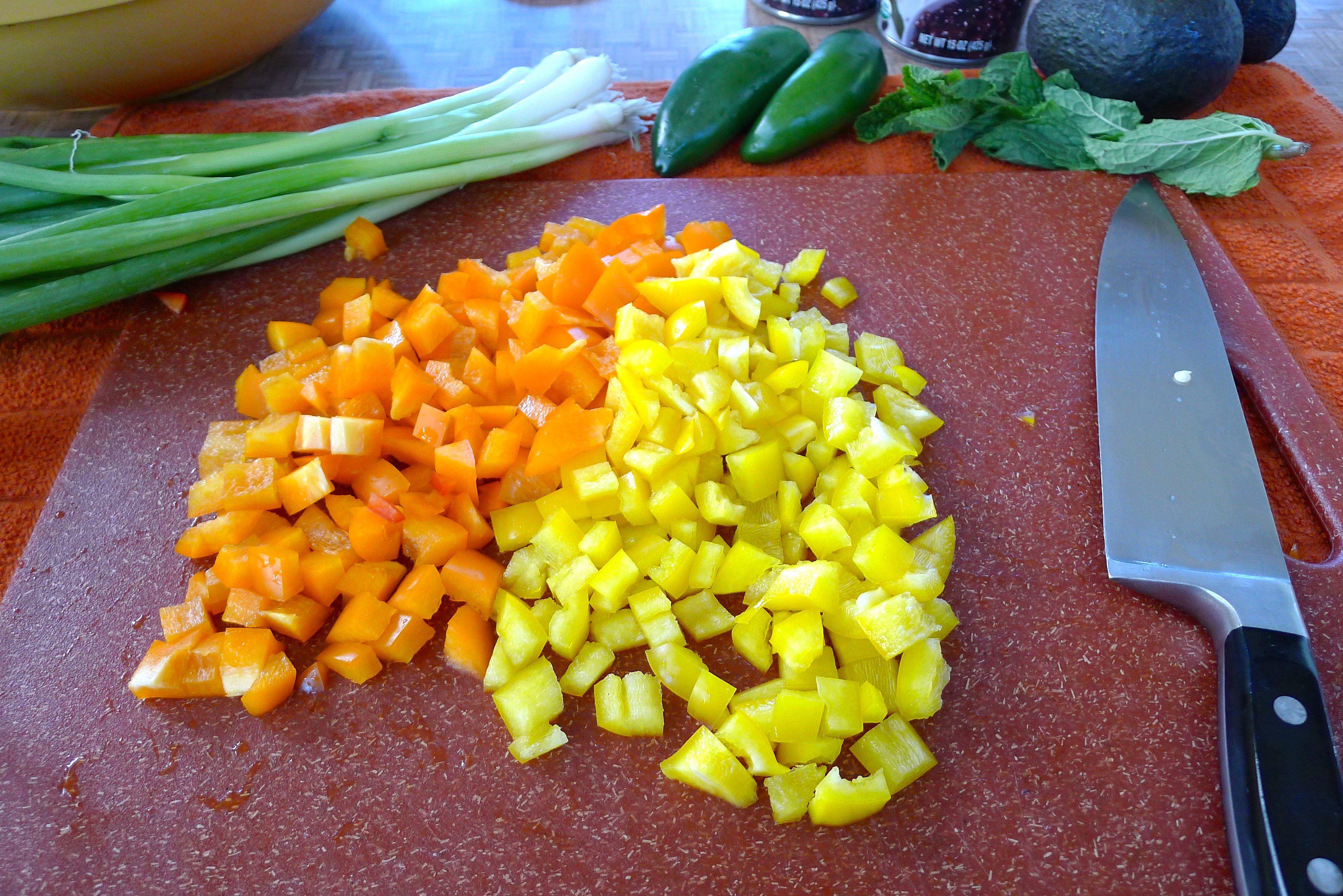 The corn was lonely, so I chopped up a rainbow of bell peppers, a few green onions, and a couple of jalapenos and tossed them right into the bowl.