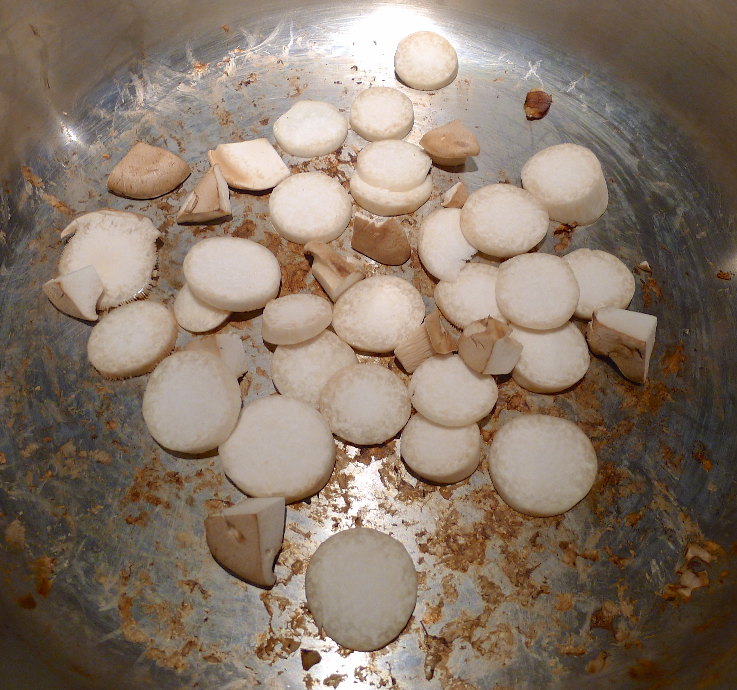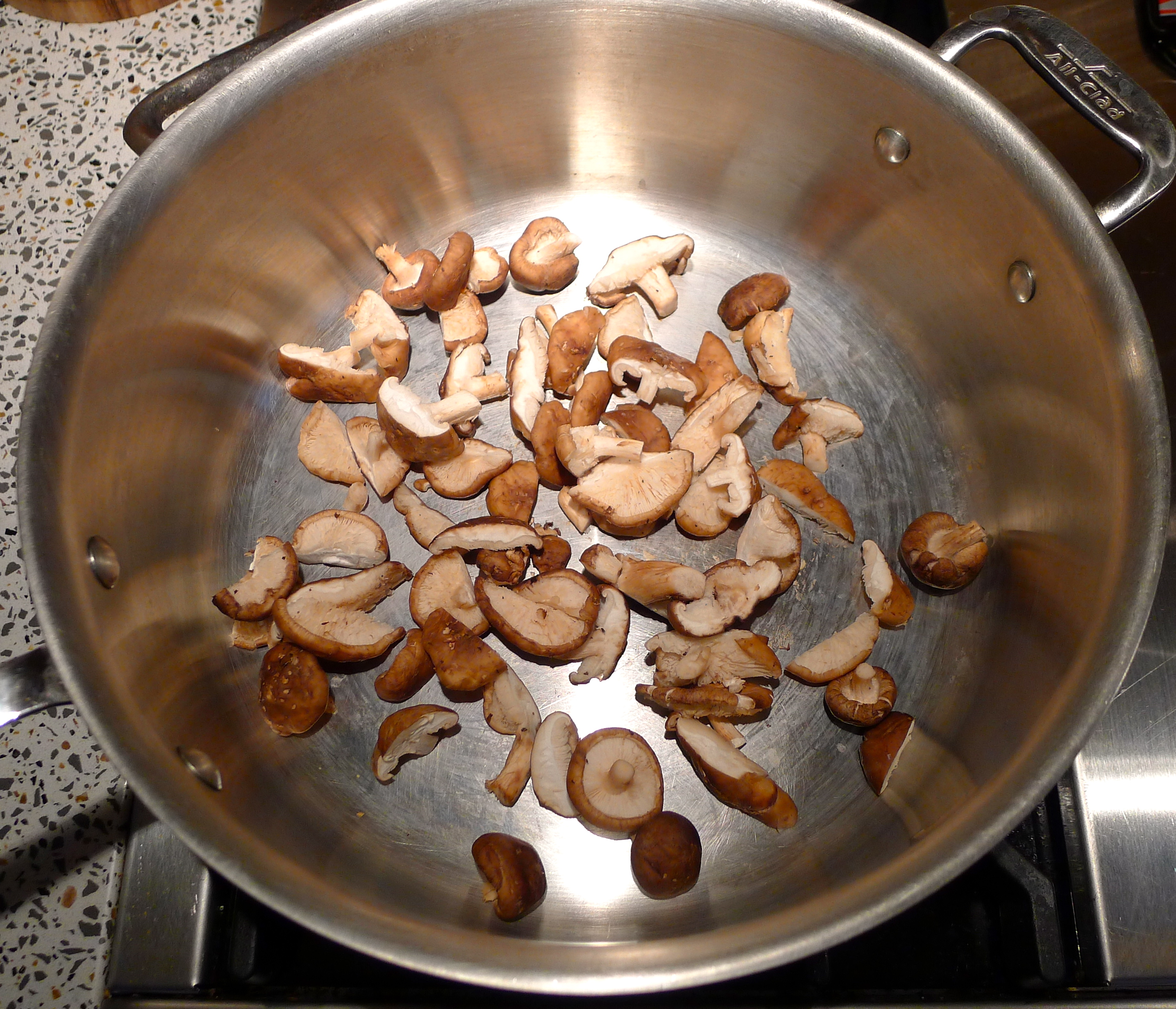 In batches, brown the mushrooms in a dry pan. You don’t want them to soften, just gain flavor. Brown bits will form on the bottom of the pan. This is good. Set the mushrooms aside.