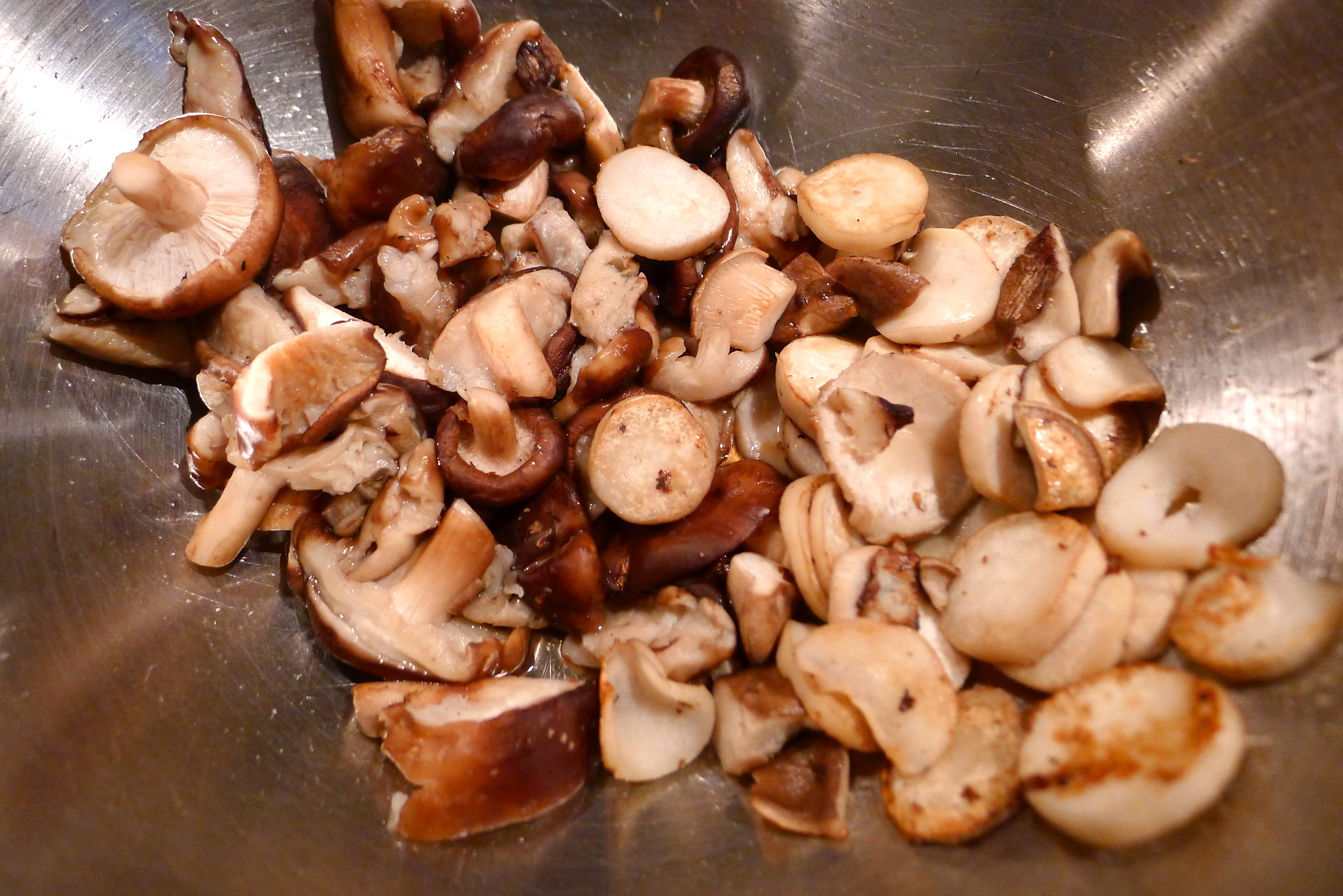 I’m familiar with shiitake and portabella, but honestly had no clue what the rest of them were. I simply cut up the bigger ones and set them aside. I also prepped a pile of sliced shallot and chopped garlic. Mmmmmmm.