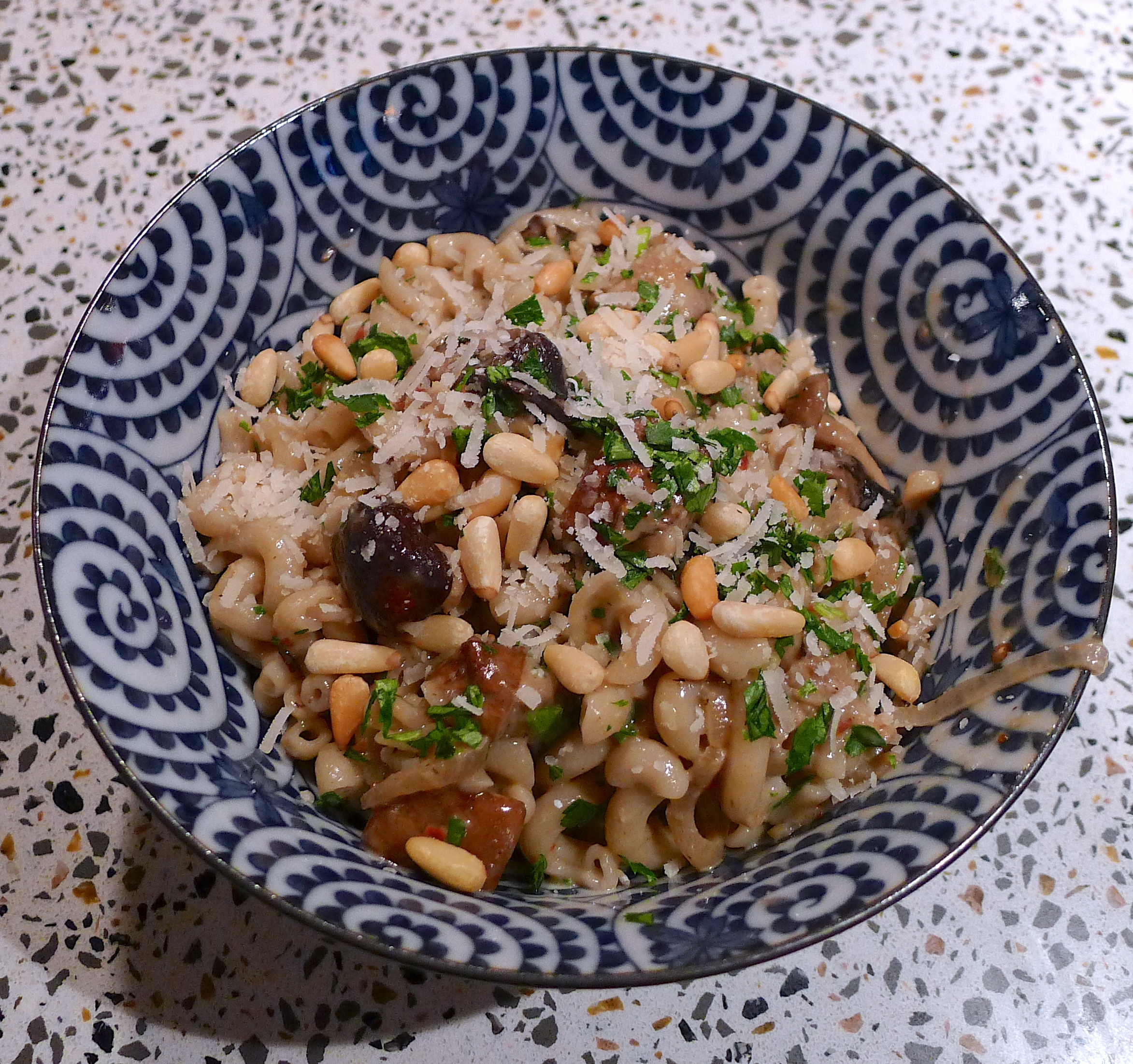 Pour the mushroom sauce over the drained pasta. Add the Parmesan and parsley, and mix well. Serve topped with more parm, parsley, and pine nuts. Enjoy during a summer storm but don’t turn on the fireplace. YUM!