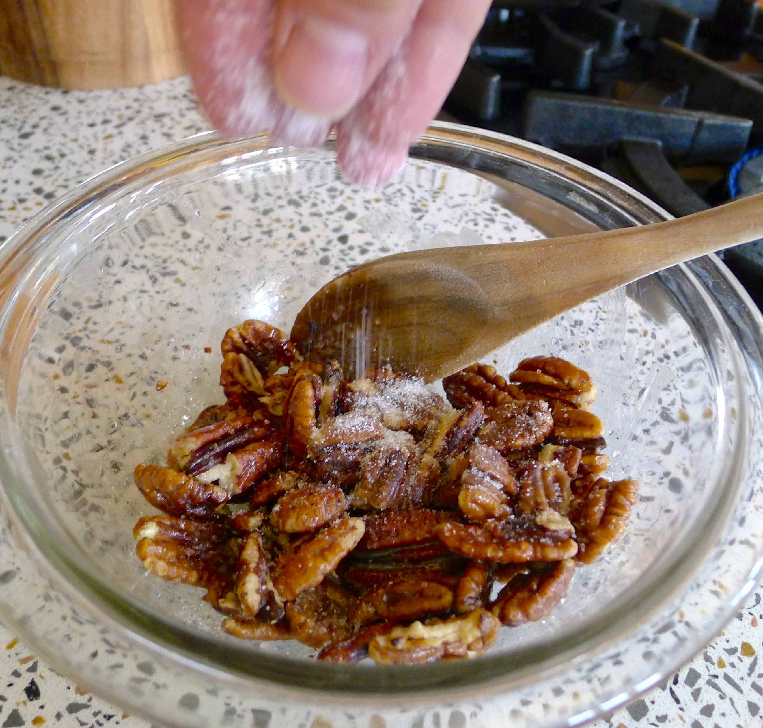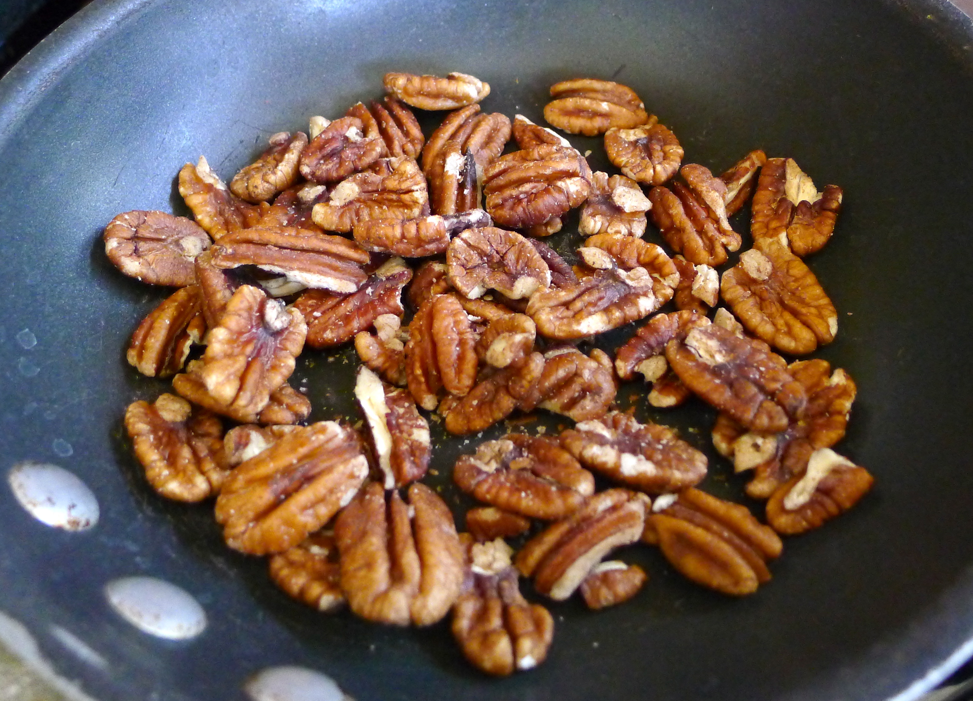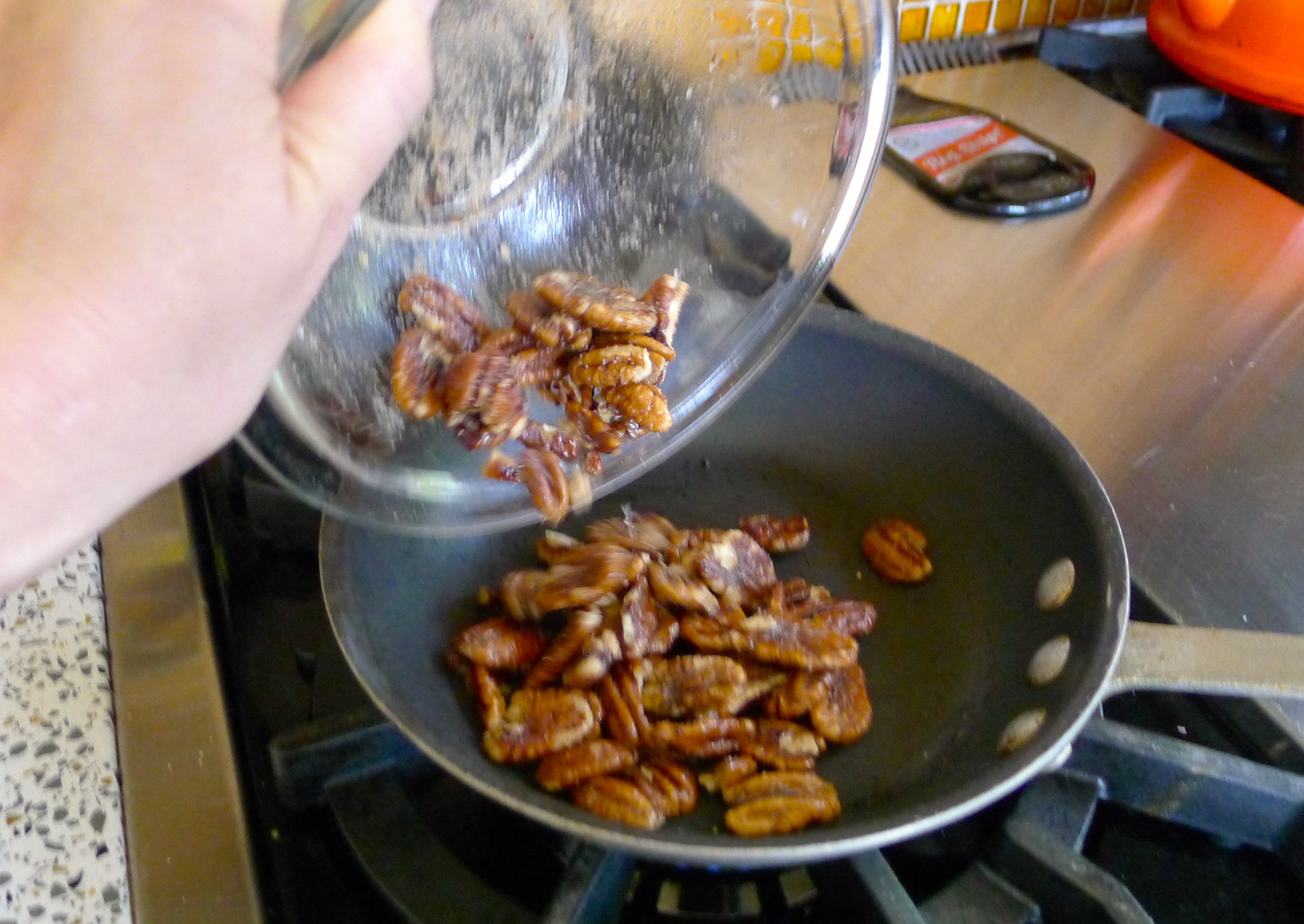 My favourite trick for caramelizing pecans is maple syrup. A little butter in the pan, toss in some pecans and drizzle in just enough syrup to coat, cooking it until the syrup thickens up. Mmmmm…