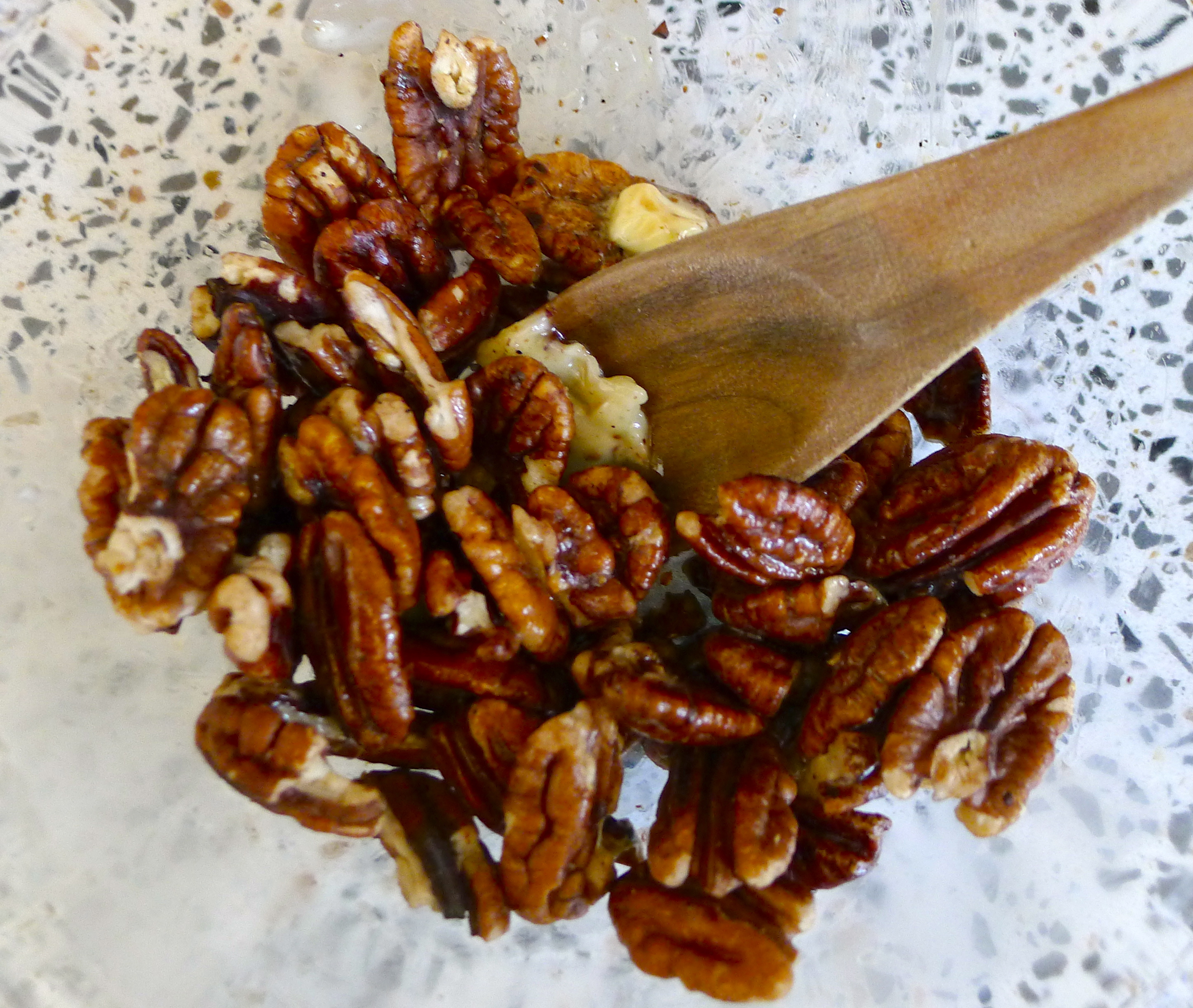 I started with the nuts. Caramelized nuts are so delicious in salads. I dig through the greens to eat them first. Every last one. But have never been able to get them right at home. I followed Callie’s instructions, starting by toasting the pecans over the stove. When they’d browned slightly, I poured them into a little bowl with some butter, stirring to be sure the nuts were coated.