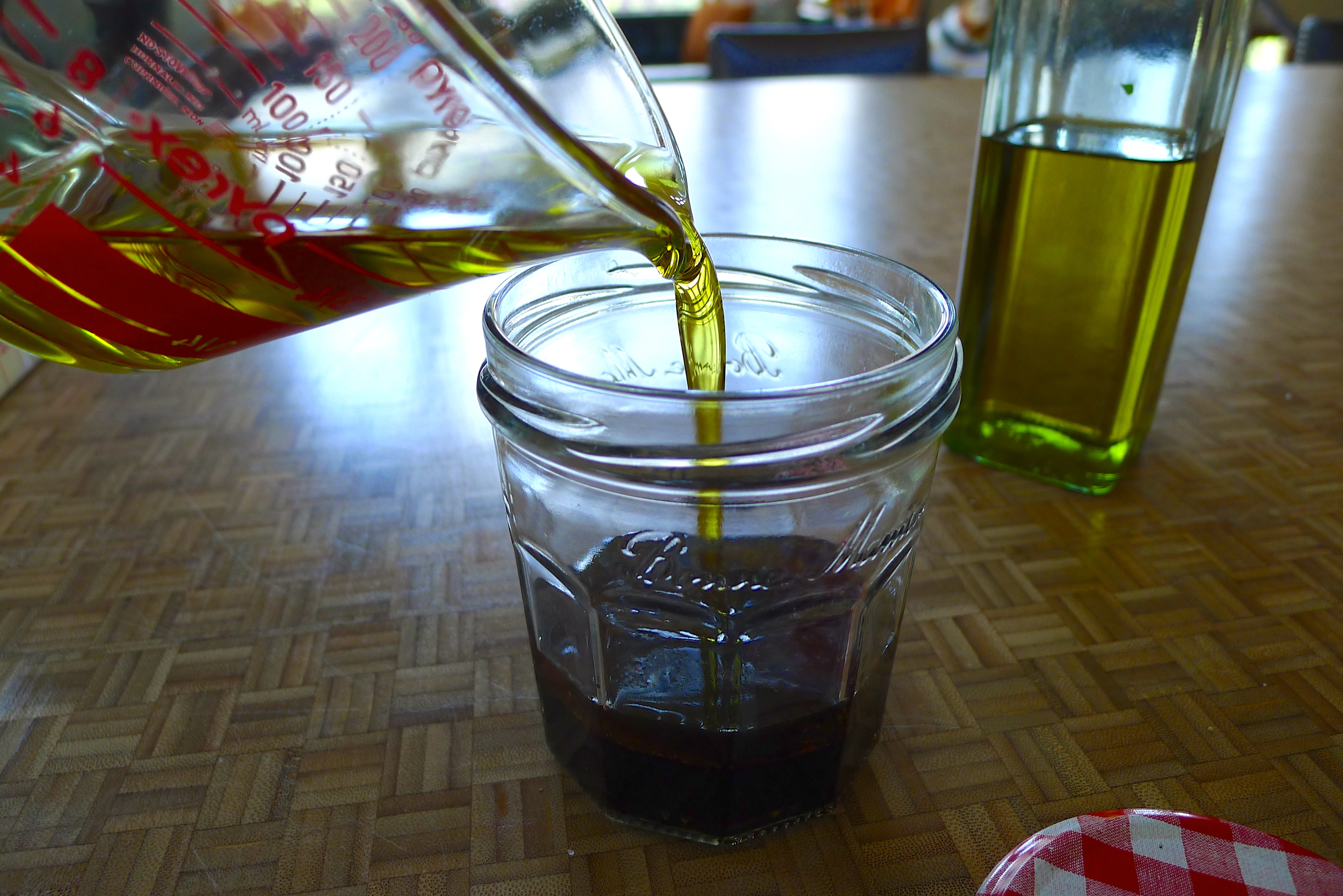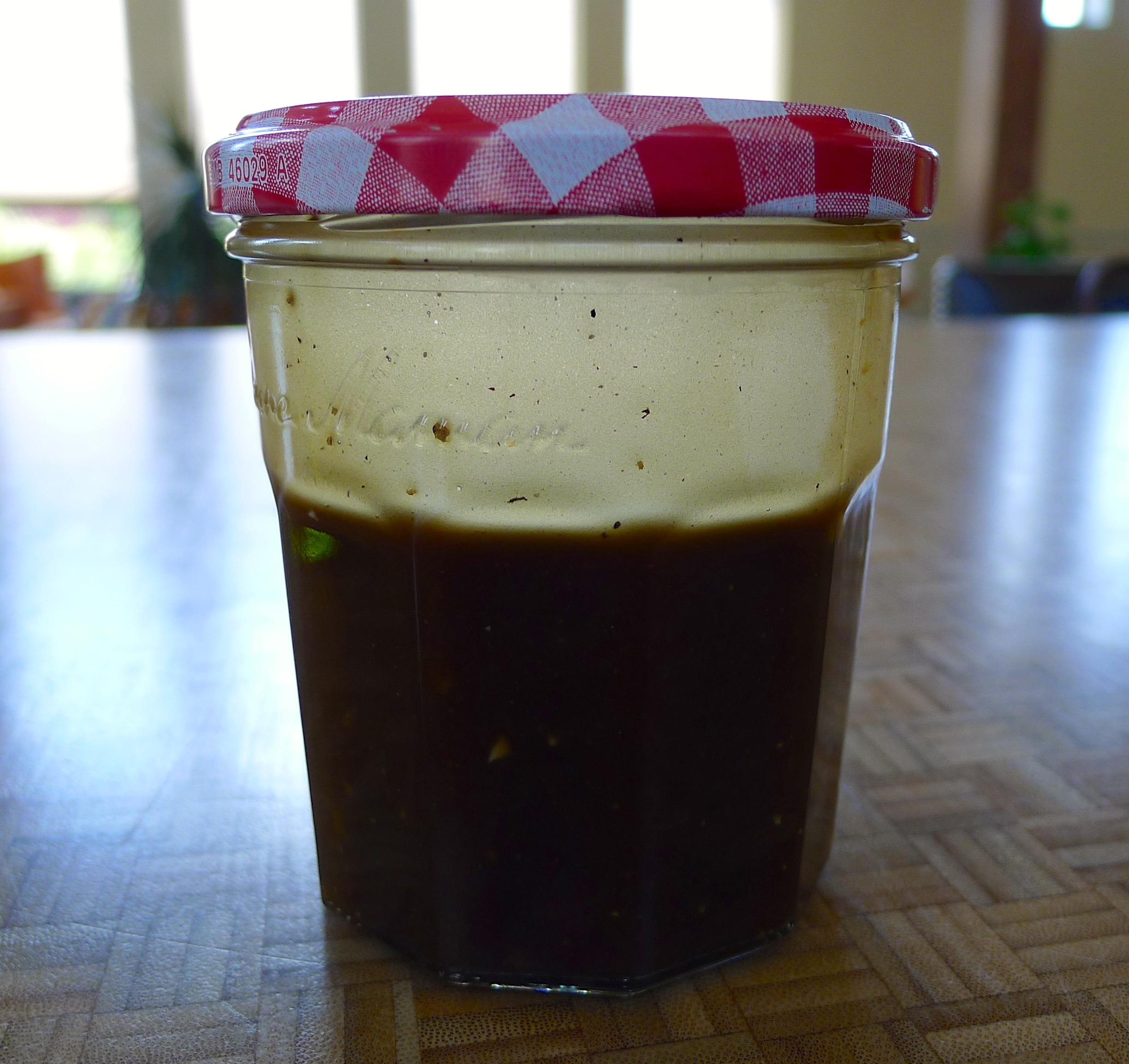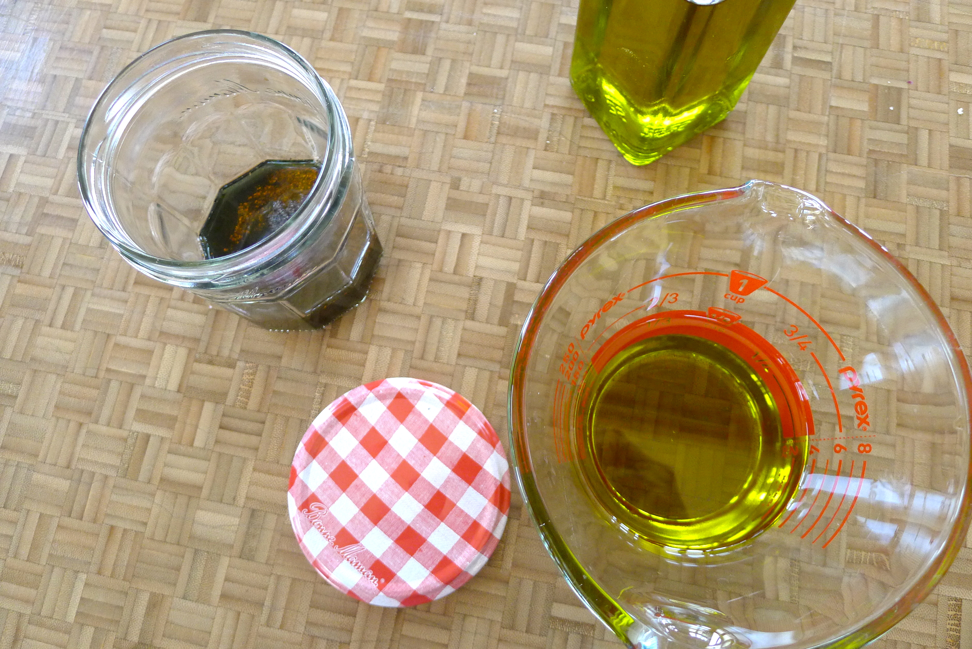 My little leftover jam jar is the perfect size for the amount of dressing this recipe makes. The last addition was fresh minced garlic. I gave the jar a good shake. Done!