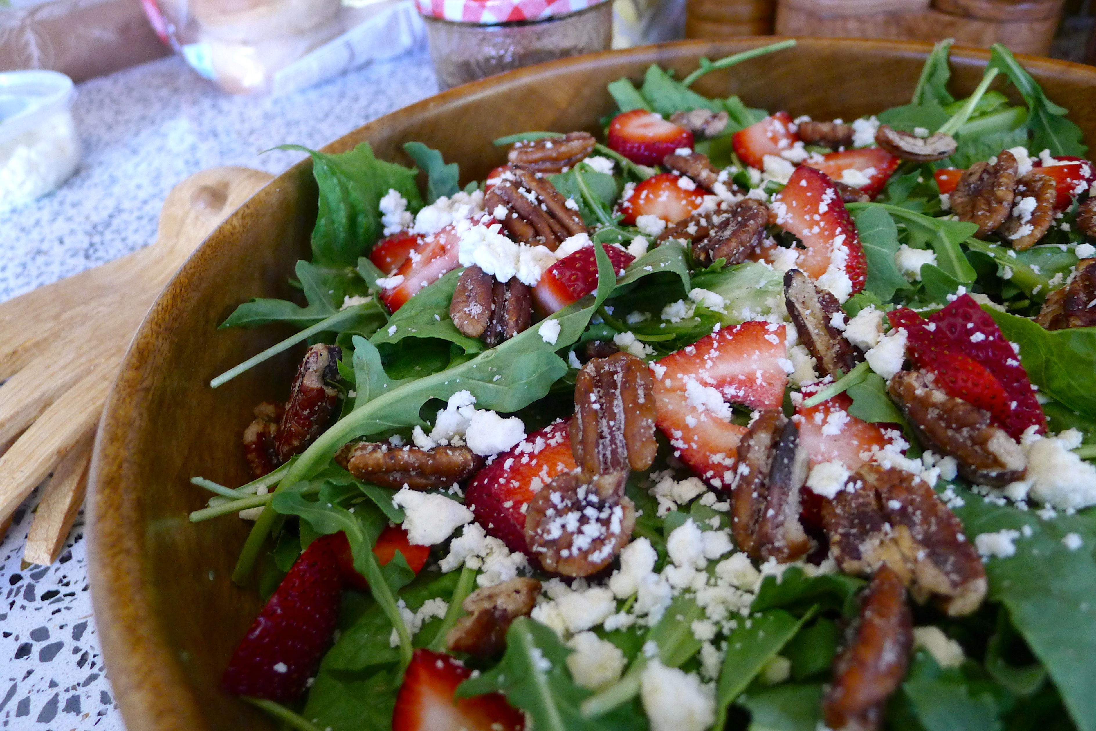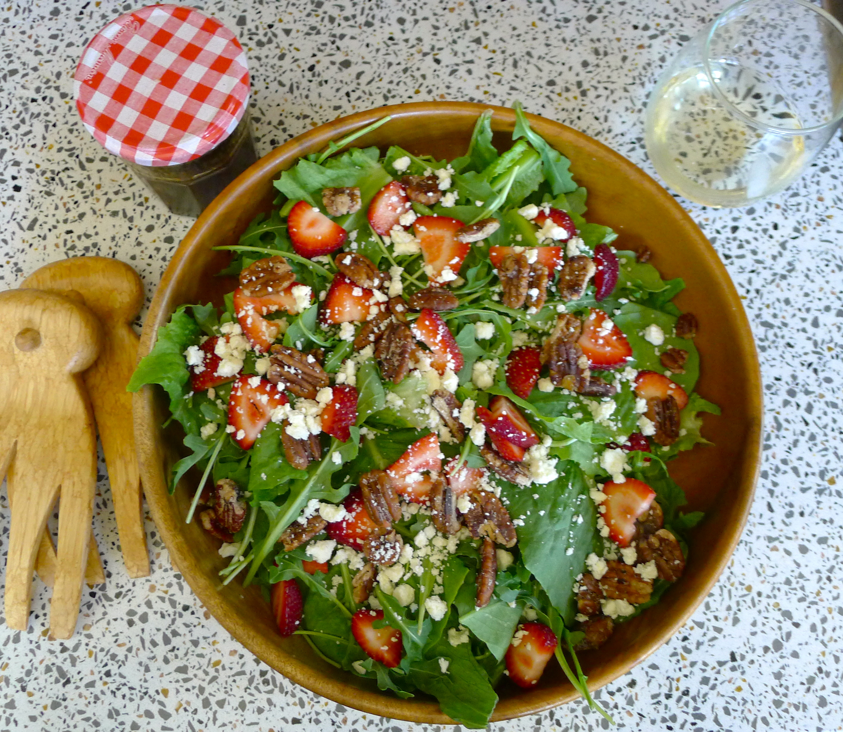 For the salad itself, I used quite a bit of homegrown romaine lettuce but added in some peppery arugula, too. I topped it with sliced strawberries, a generous sprinkling of feta cheese, and those candied pecan miracles. This is a GORGEOUS salad!