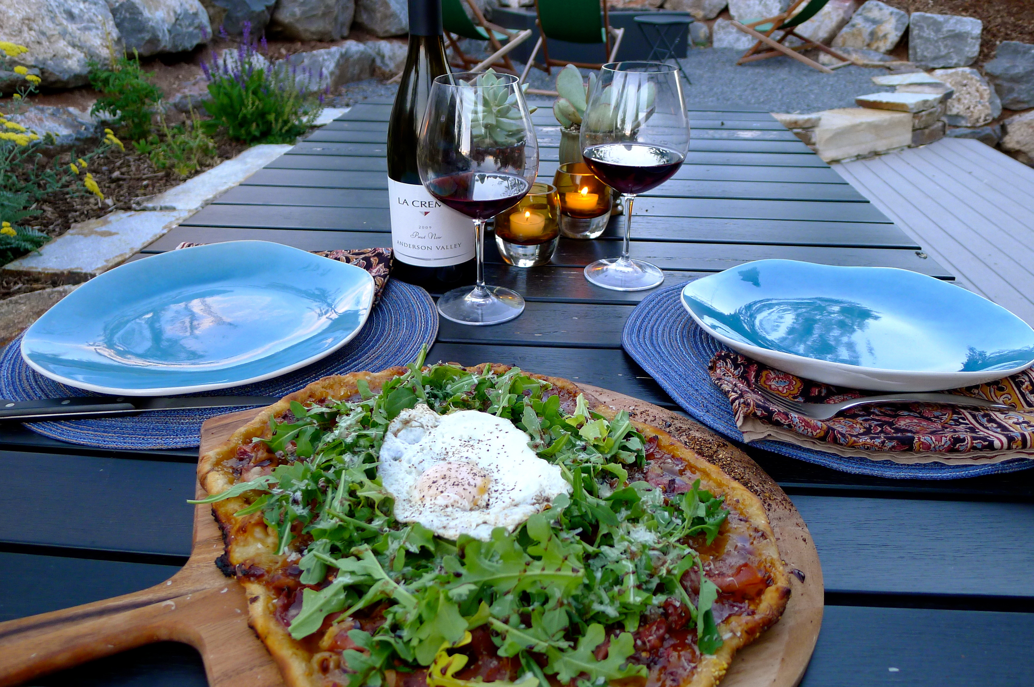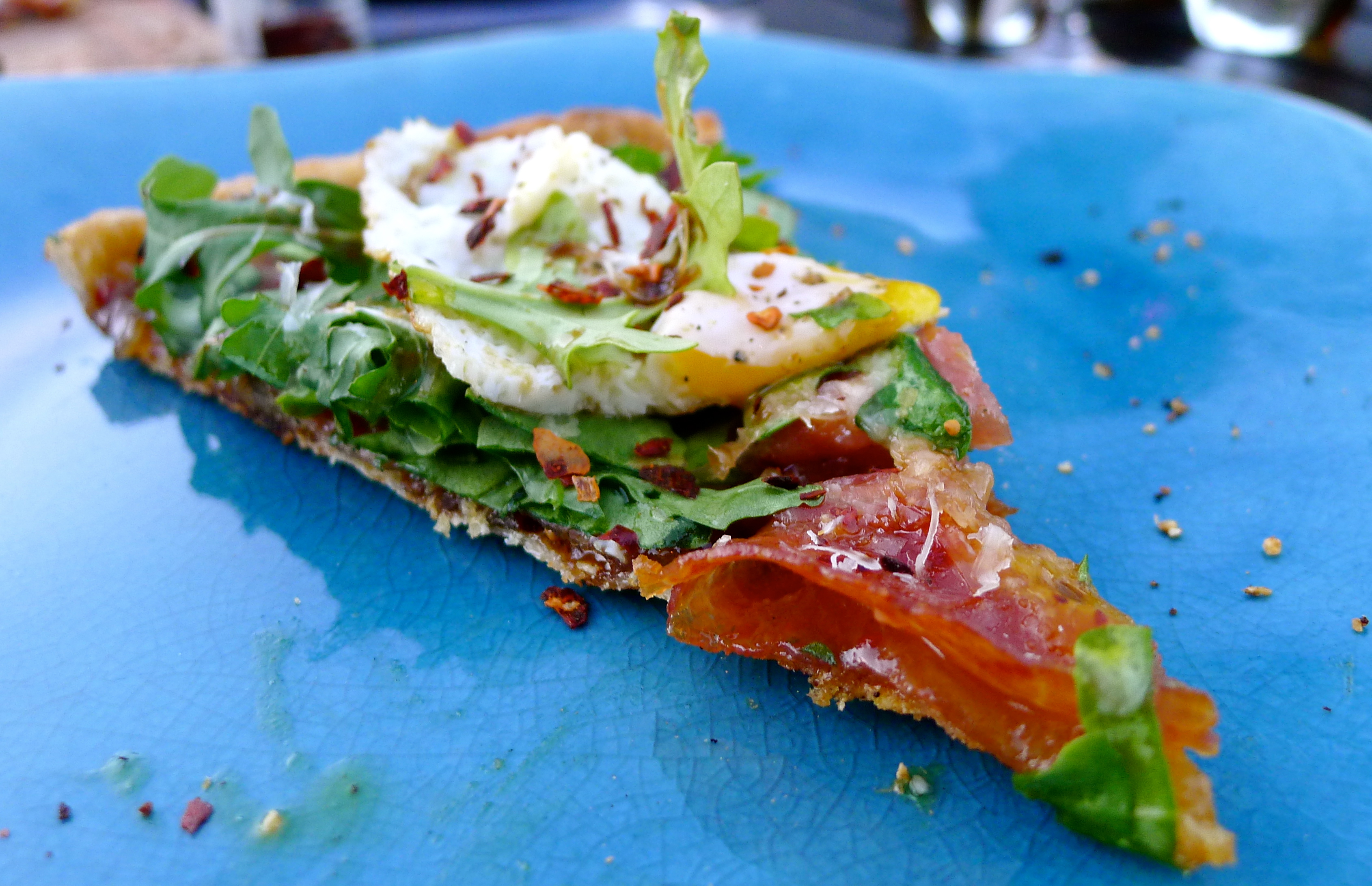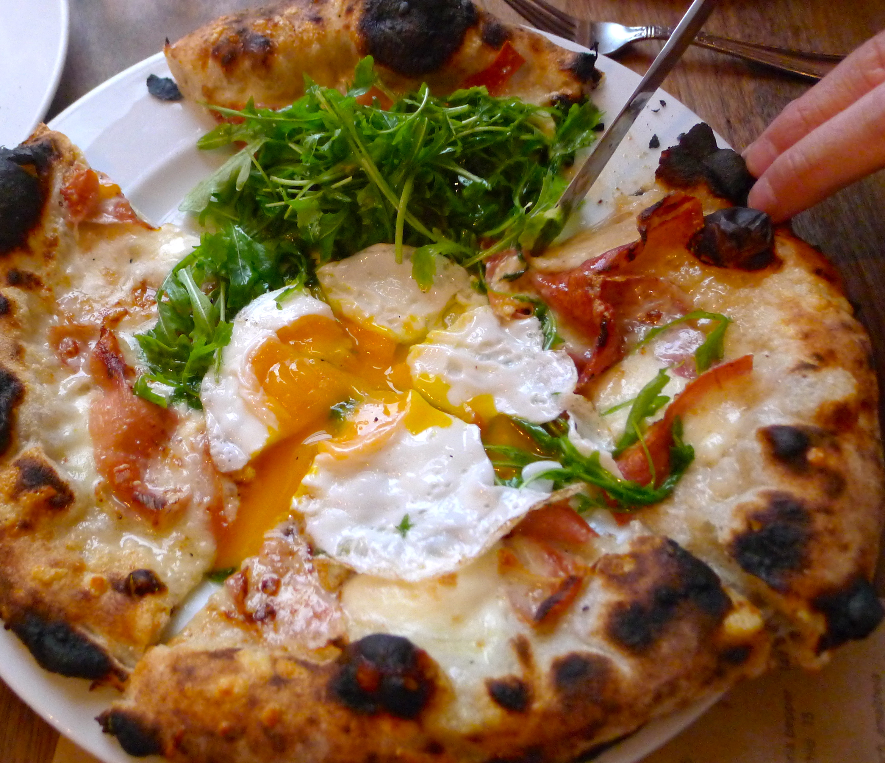The final touch: the egg. Sure, this pizza would be delicious as-is (DAD). But we know from our experiences at Blackbird that the EGG takes it to another level! John cooked the egg to an over-easy doneness and placed it gently, right on top of the greens.