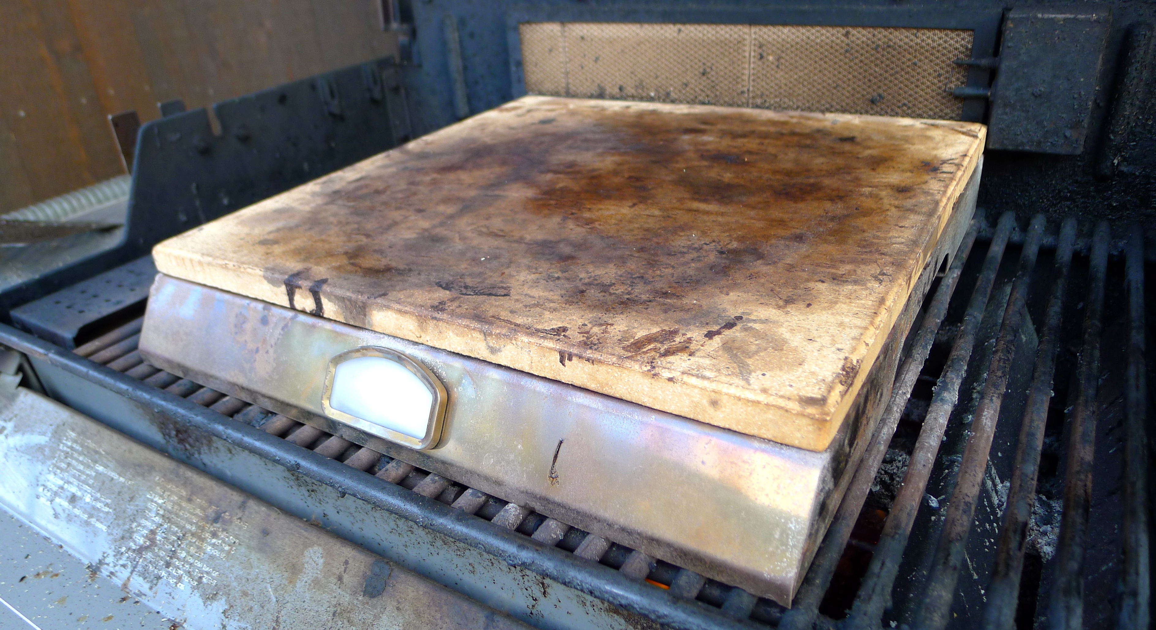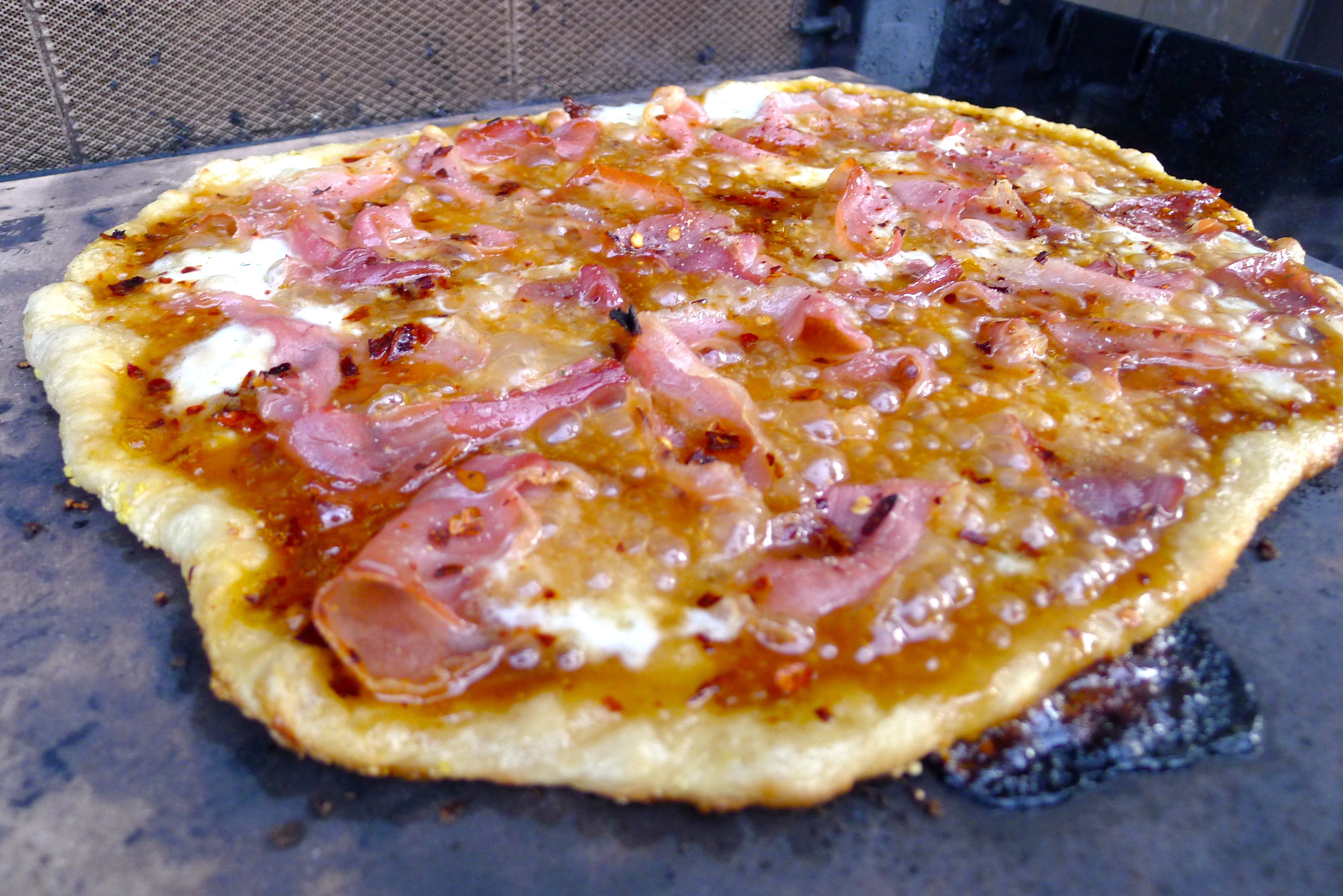 We’ve learned that cornmeal in addition to the flour is imperative for homemade pizzas. It helps the crust easily slide off of the platter to the pizza stone. We usually bake our pizzas in the oven, but in order to better replicate the wood-fired pizza flavor of Blackbird’s pie, we brought the pizza stone outside and heated it up on the grill.