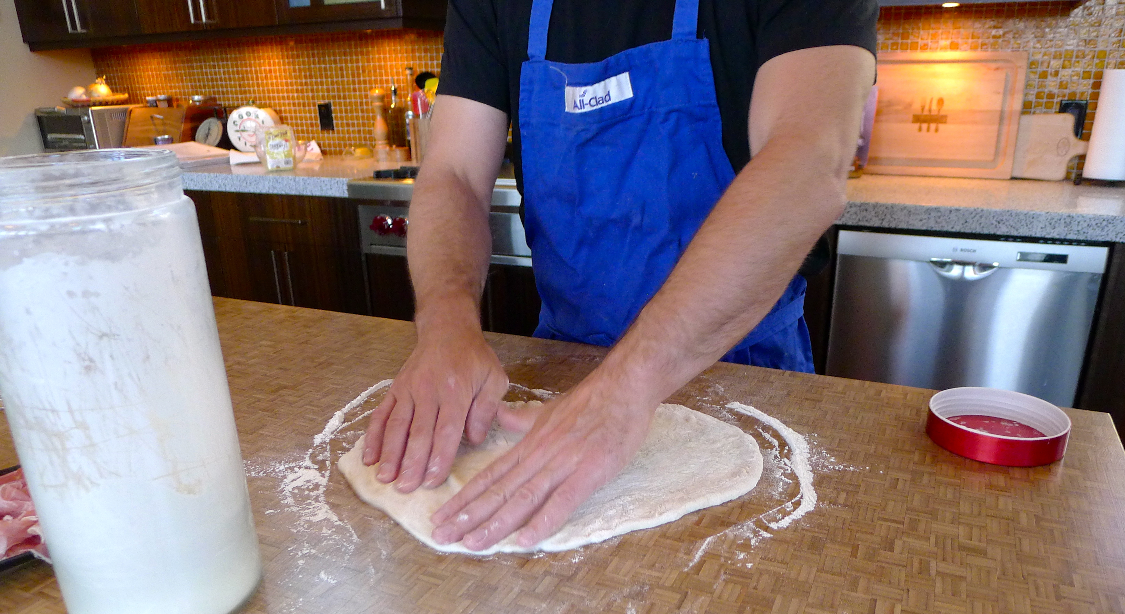 I didn’t have any homemade pizza dough on hand, but I did have some from Whole Foods in the freezer. While I gathered the rest of the ingredients, John got to work on the crust. I love sharing the kitchen with my hot hubby.