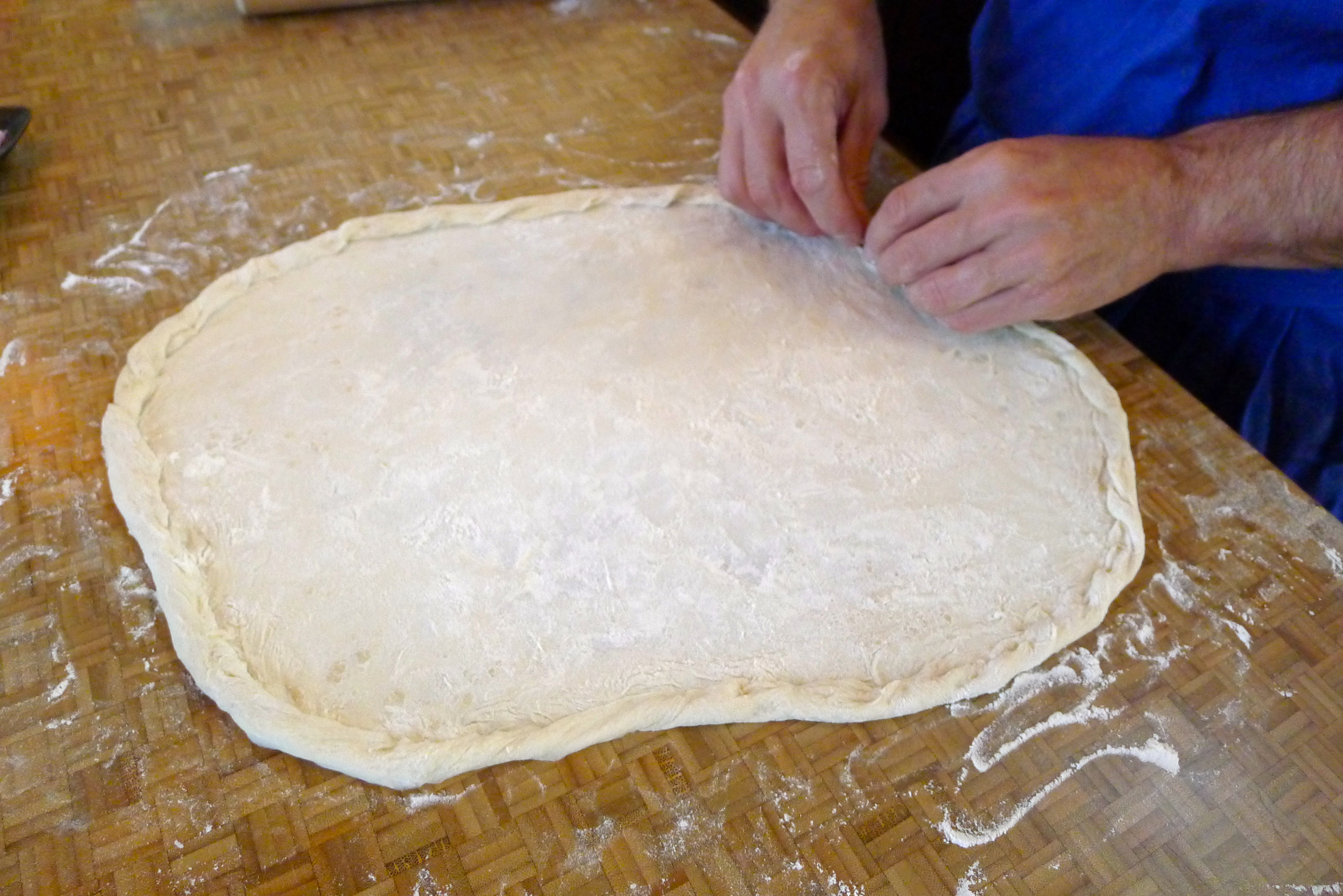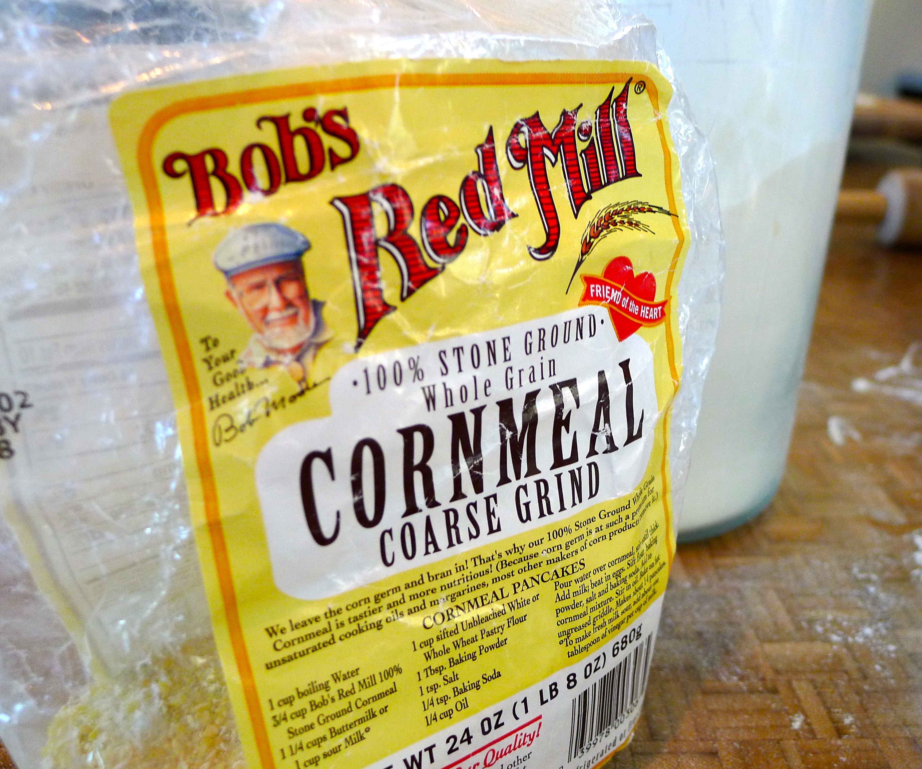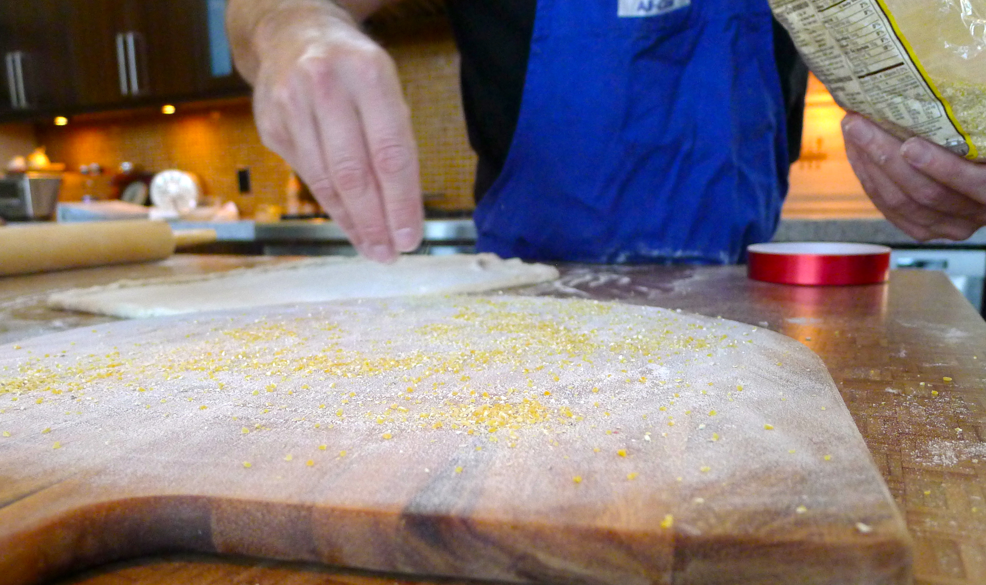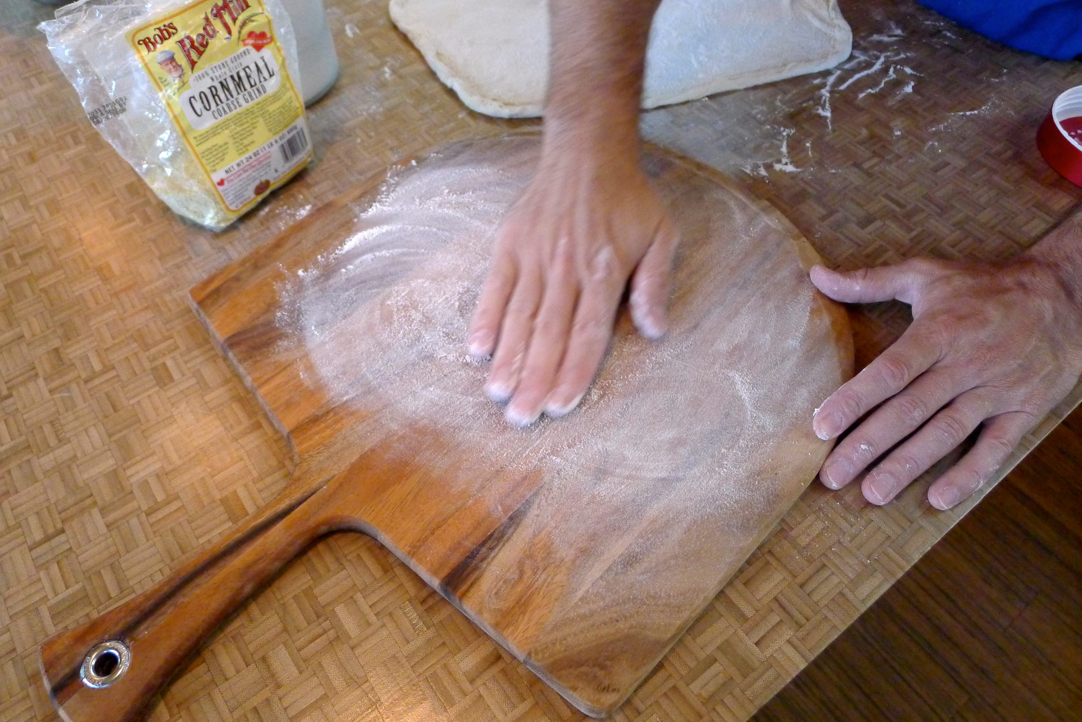 Generously sprinkle the flour onto the counter. Roll out your pizza dough to your desired thickness and size. Transfer to a baking sheet or pizza paddle covered in more flour and plenty of cornmeal.