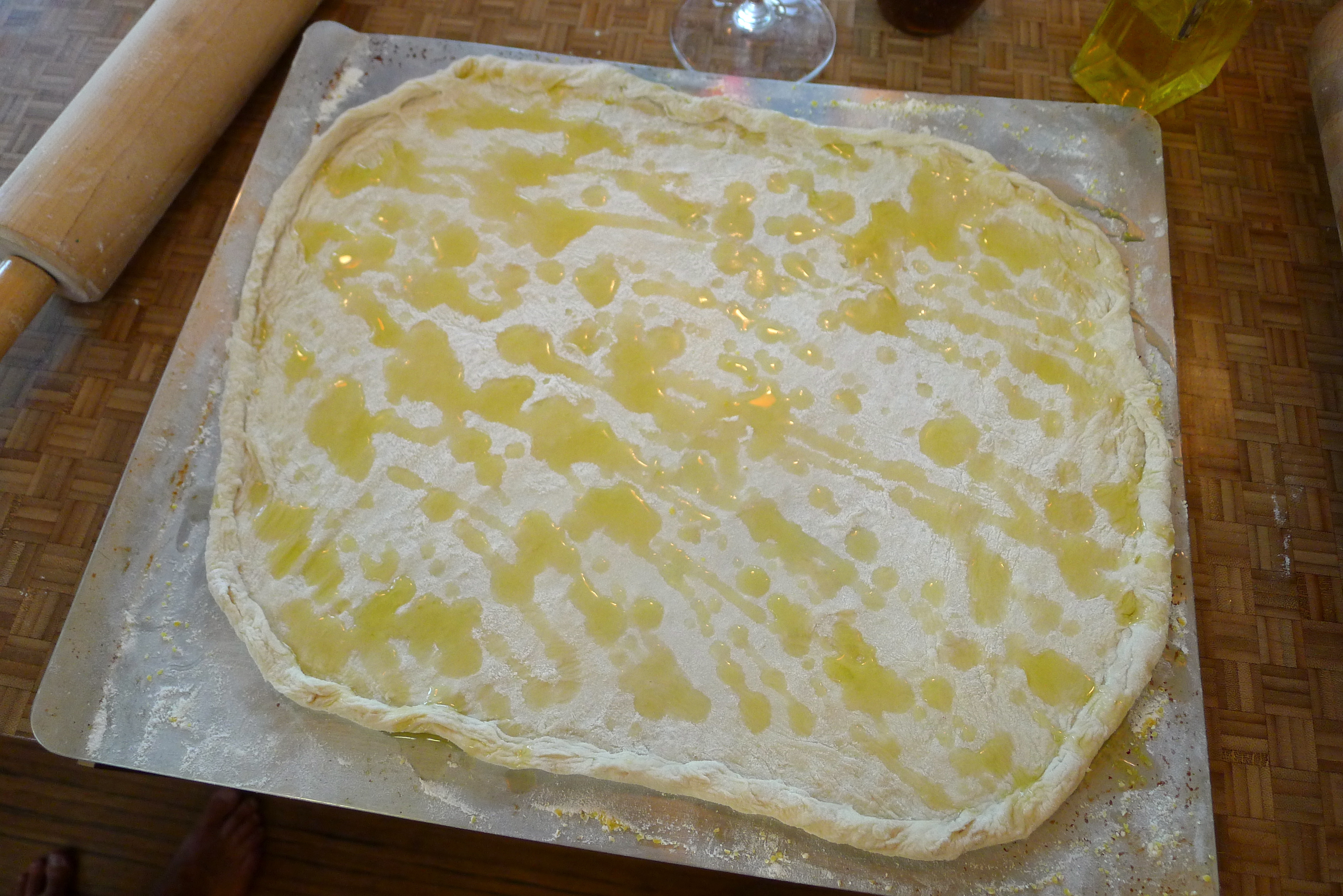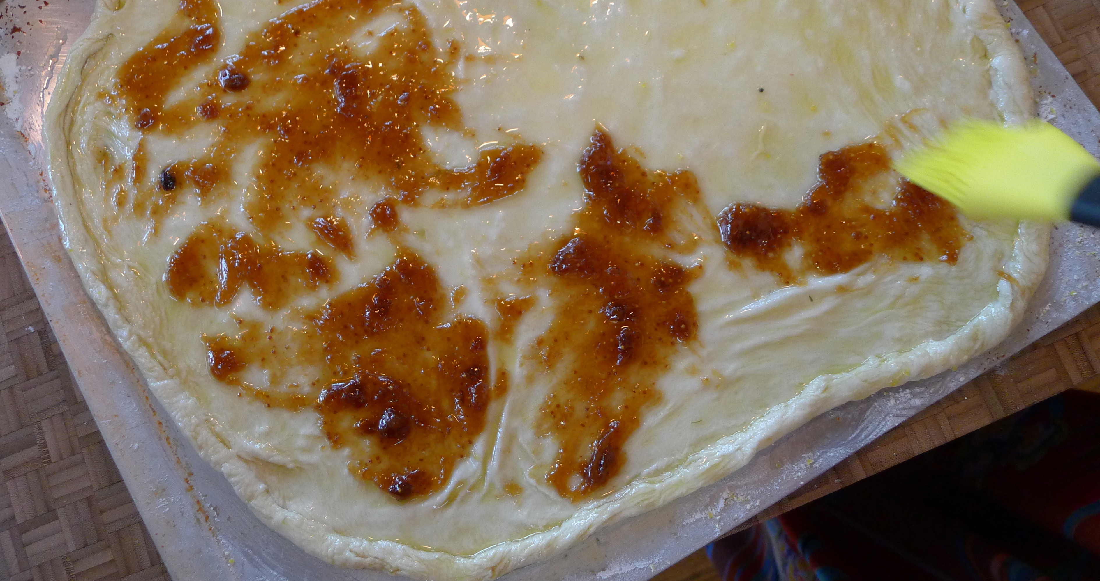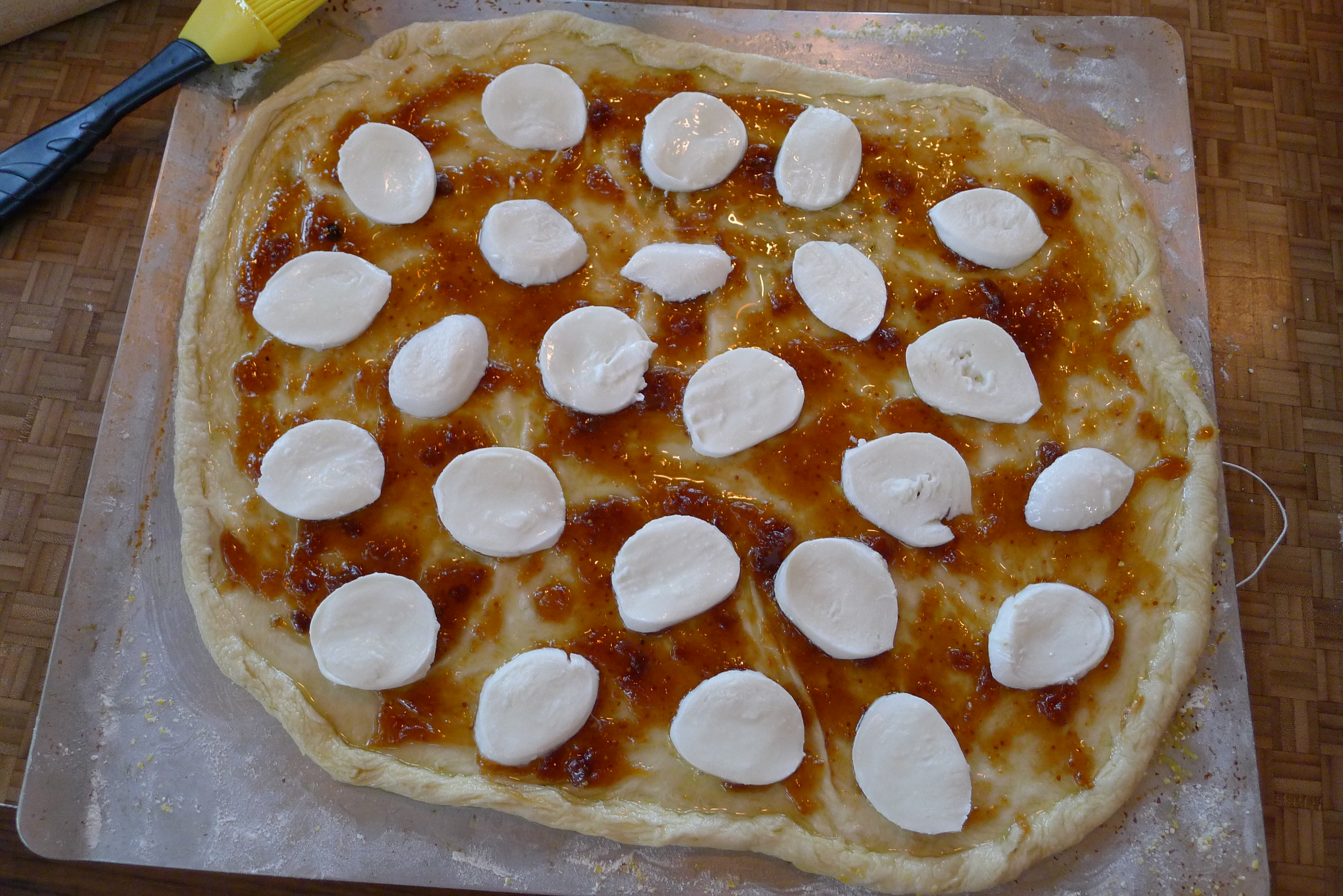 With the crust ready (love John’s crimping technique on the edges!), it was time for toppings. I started by brushing the whole crust with garlic-infused olive oil. Next, we brushed on fig jam. We added more jam than we should have- a little goes a long way!