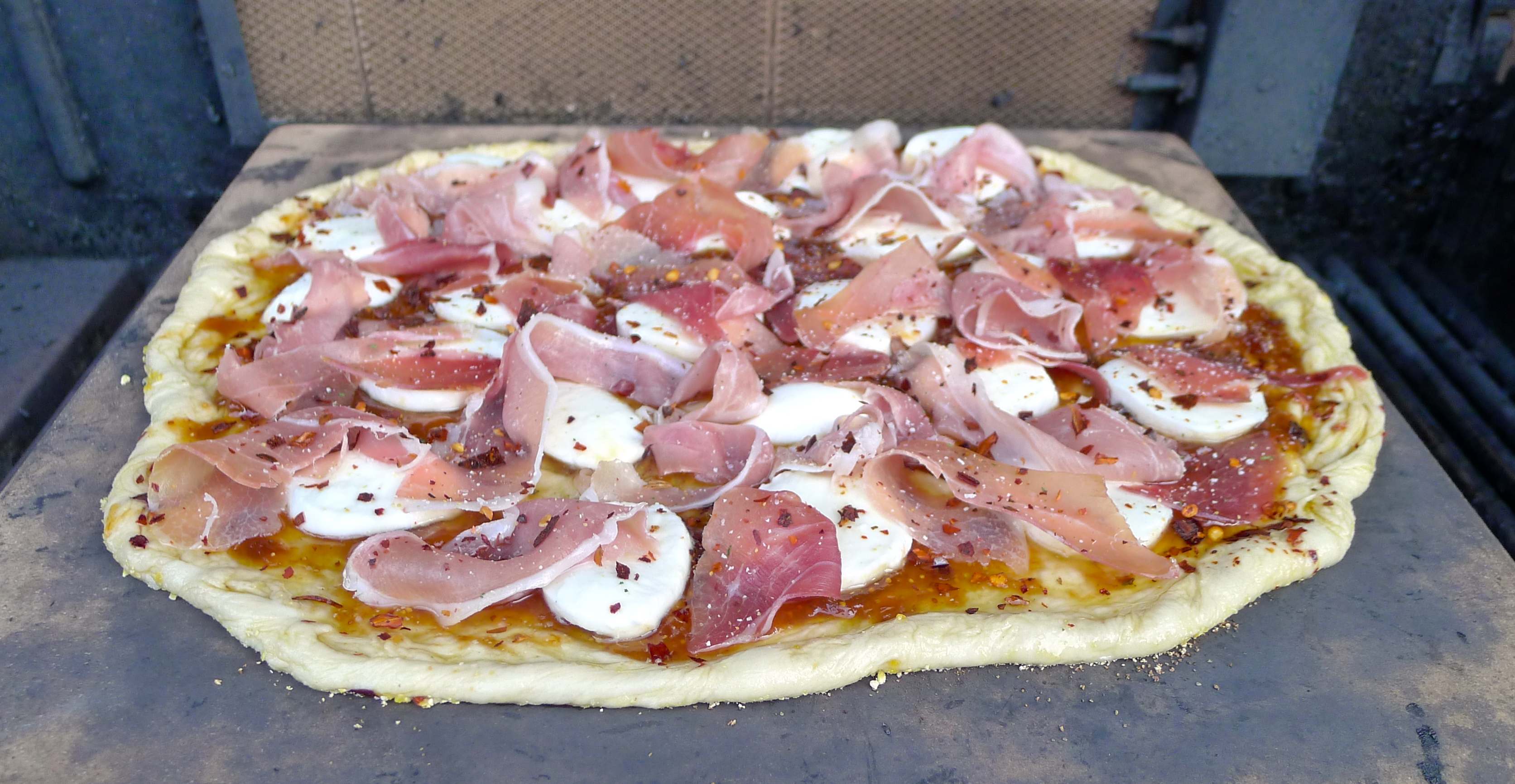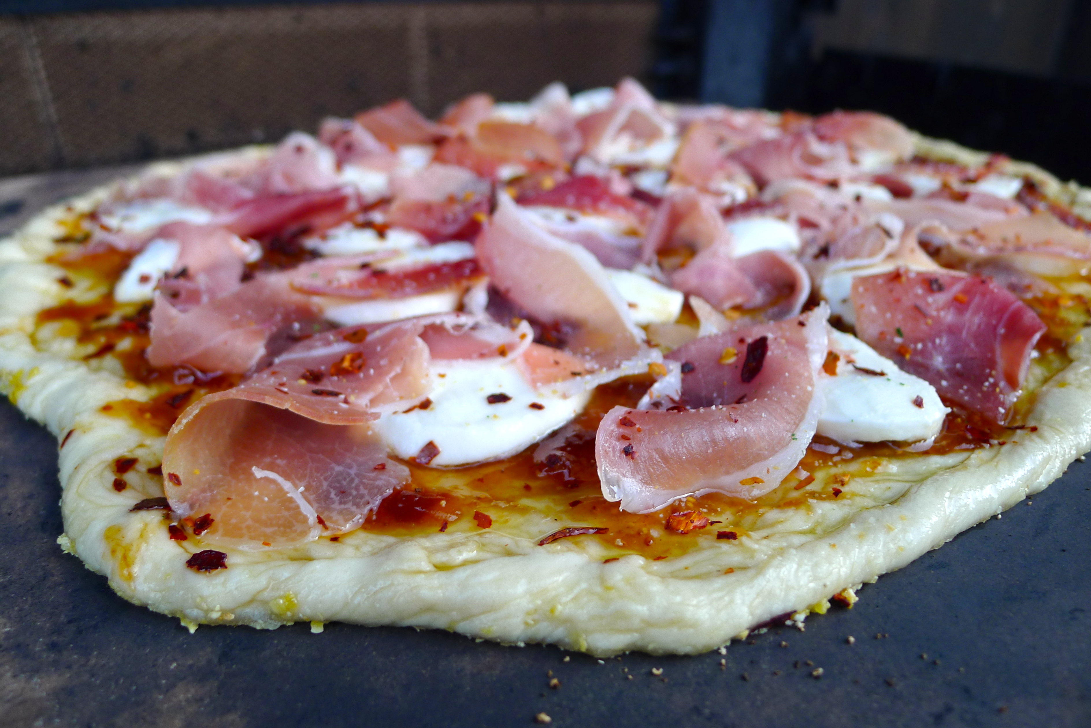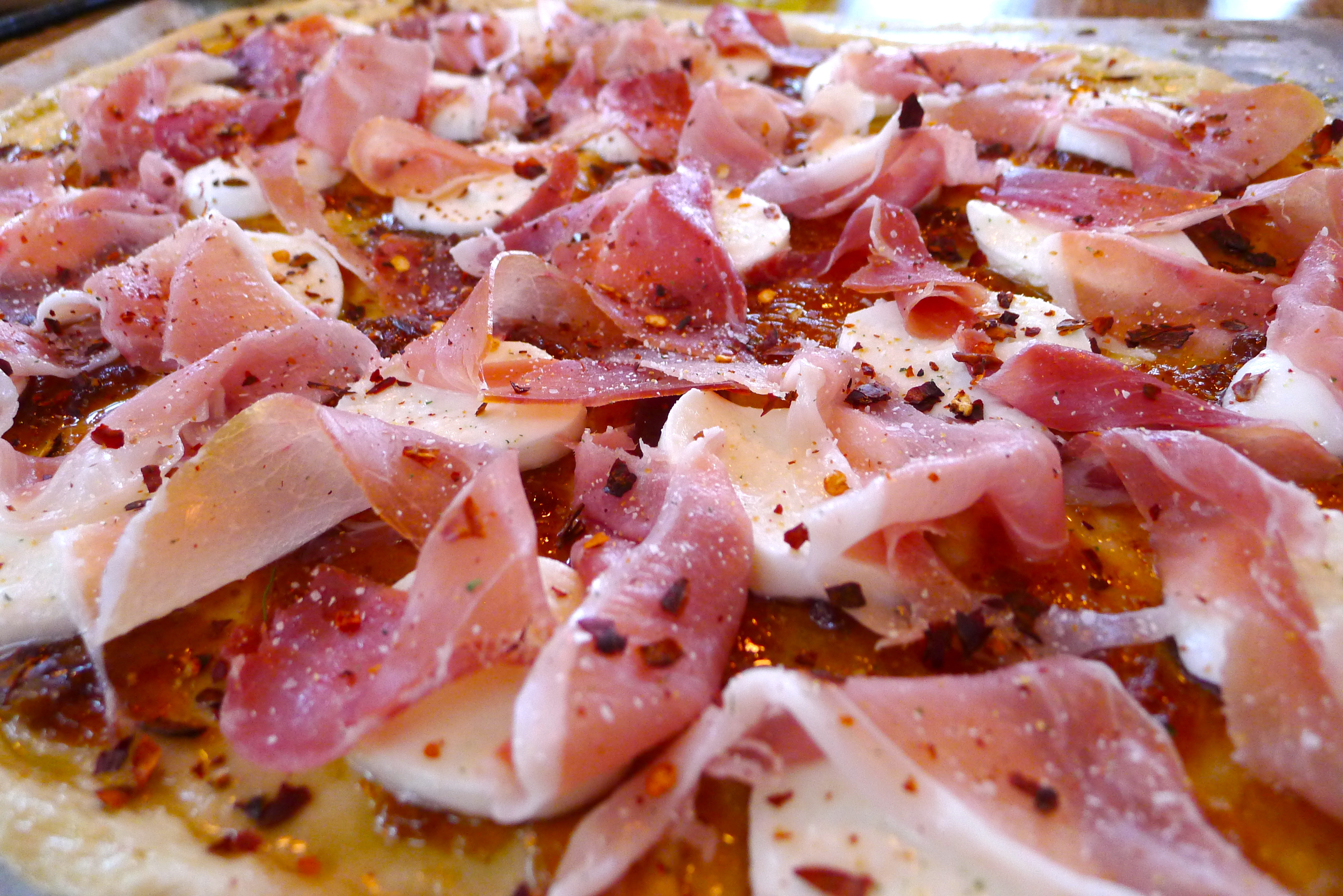 Brush the crust with olive oil, all the way to the edges. Brush the fig jam over the oil, more sparingly than you think you should. Add the slices of mozzarella, enough to cover the pizza. Add the prosciutto, then sprinkle with garlic salt and crushed red pepper.