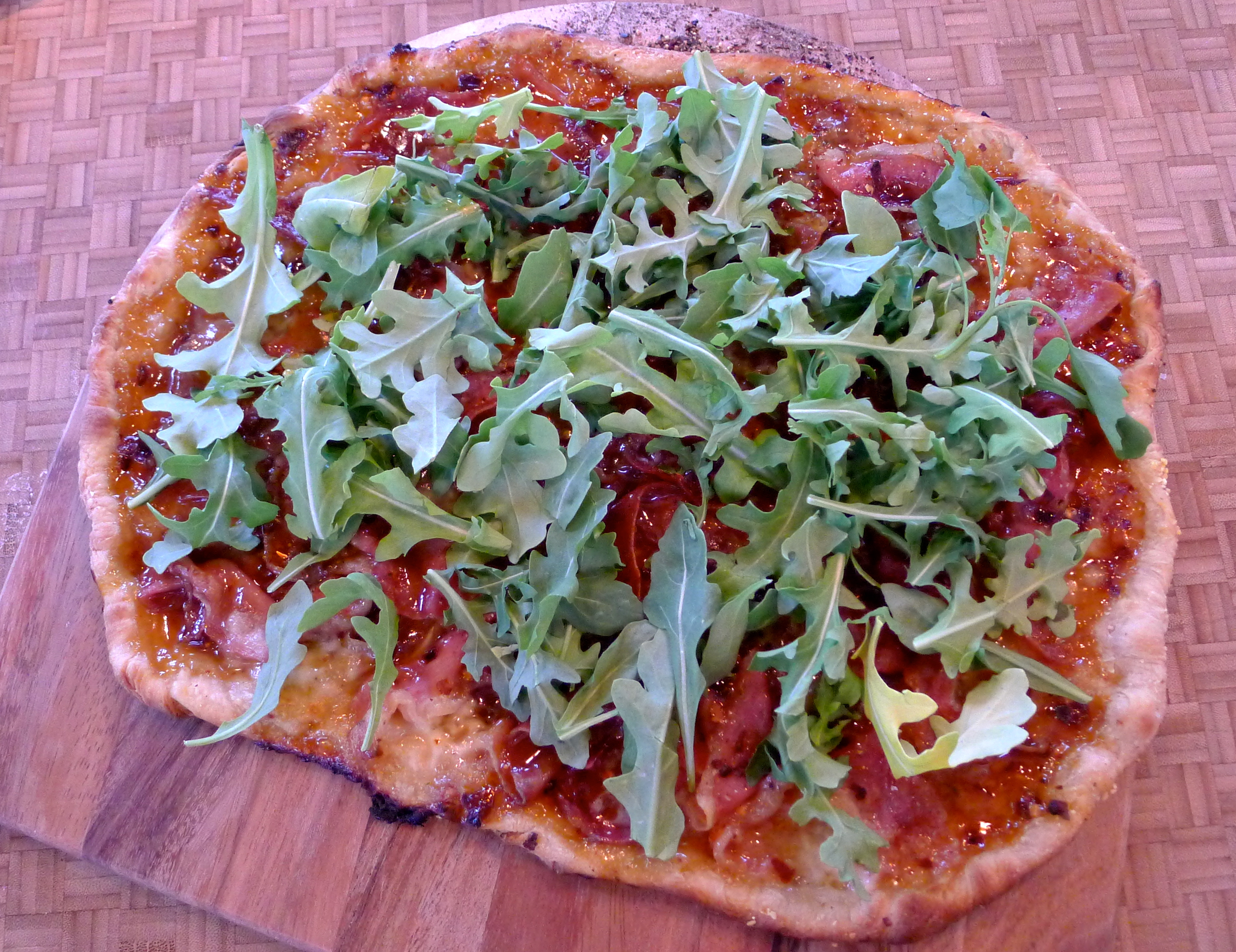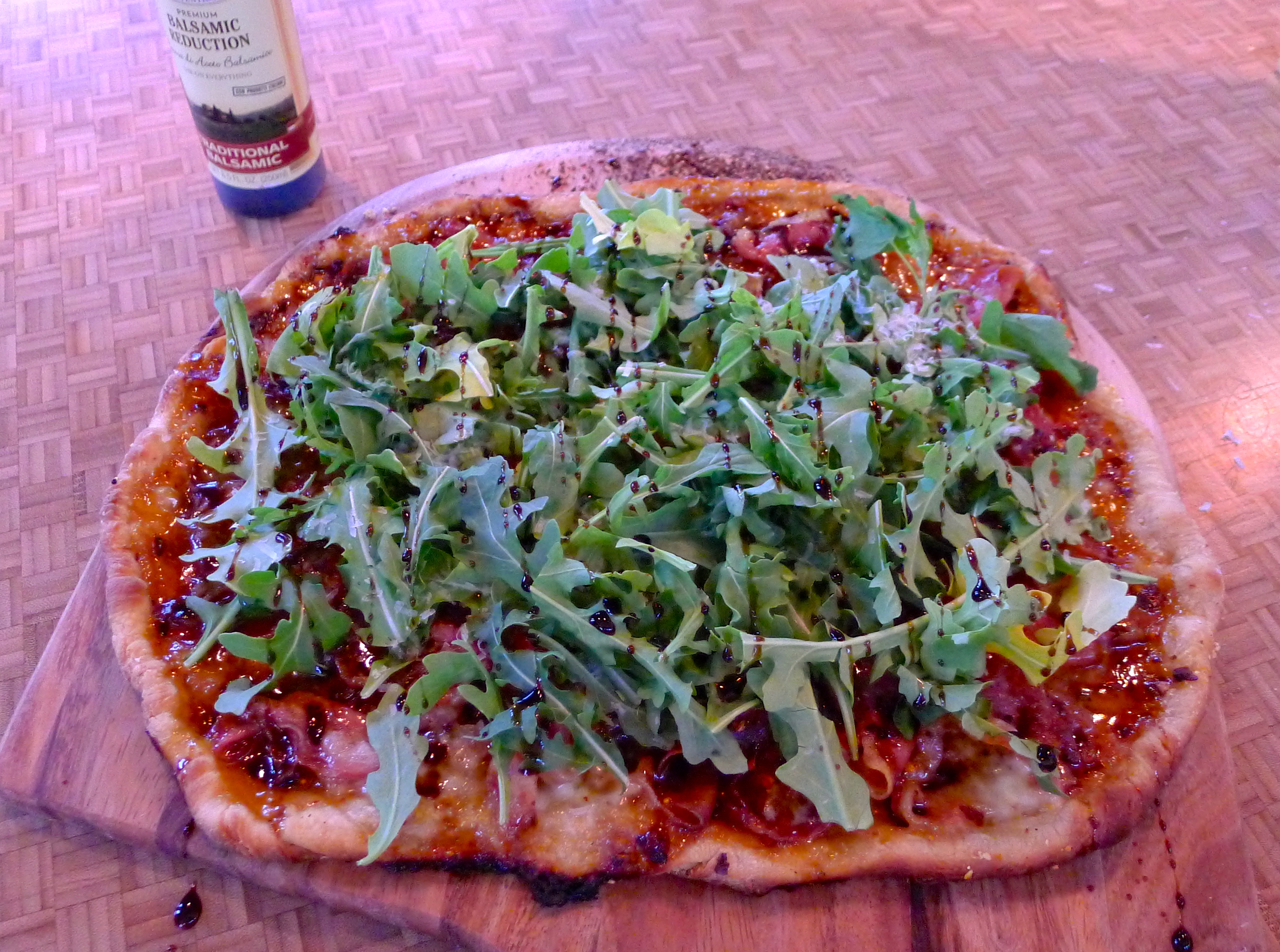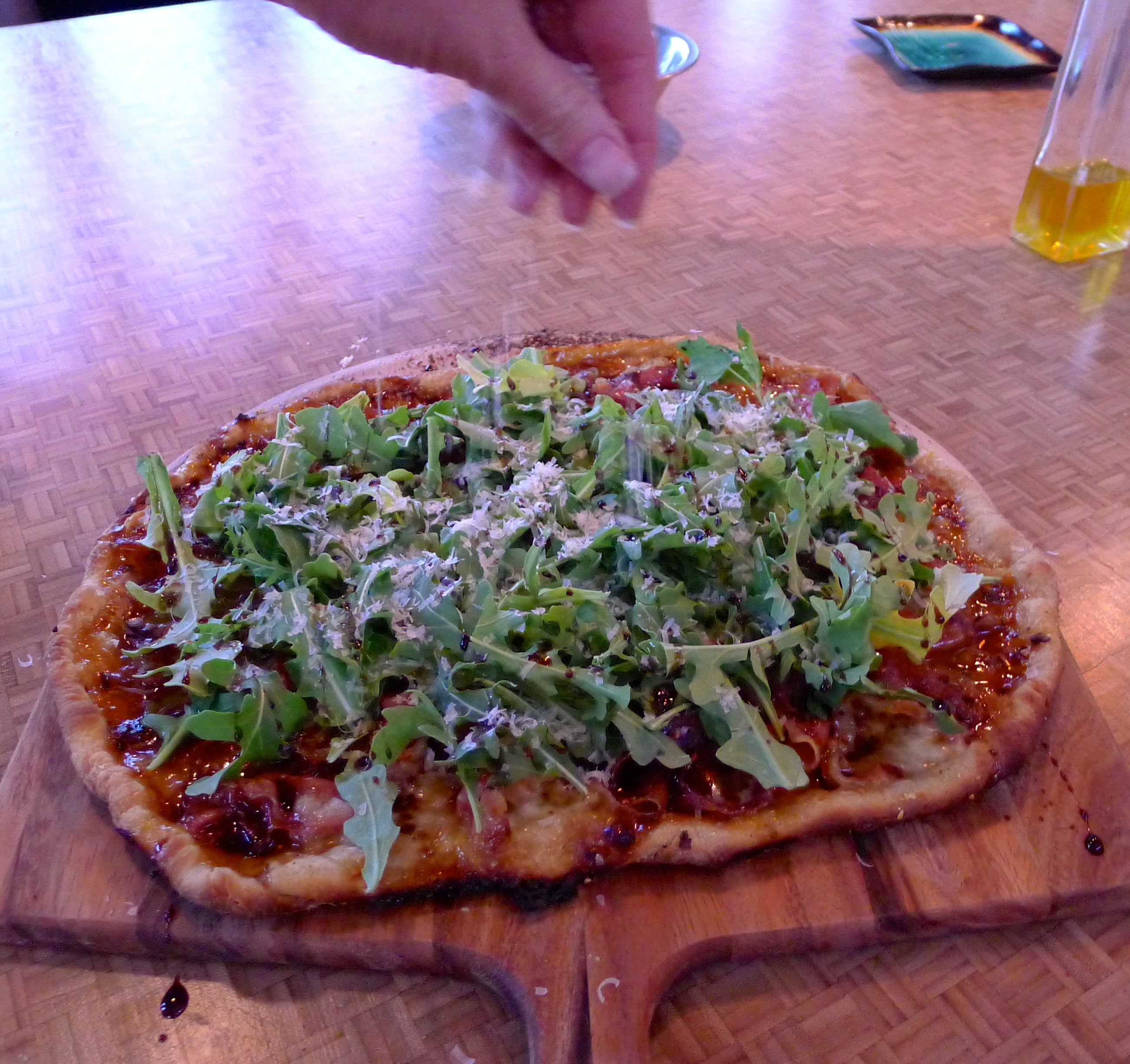 There were just a couple more things to add to our fig-pig masterpiece before we could taste it. I covered the pizza with arugula, then drizzled balsamic reduction over the greens. Next came a handful of freshly grated Parmesan cheese and cracked black pepper.