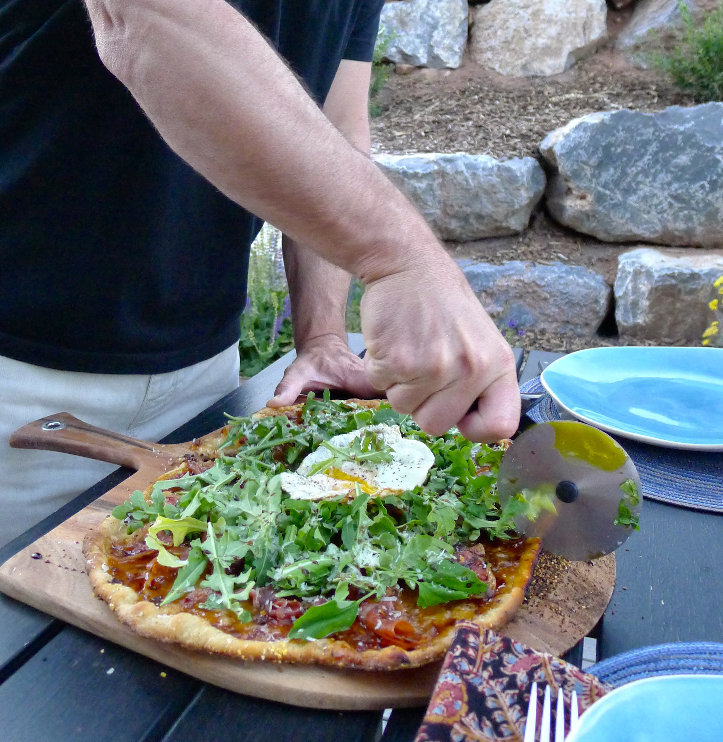 As John sliced the pie, my mouth was watering. The crust was perfect- the olive oil made it crunchy and delicious. The sweetness from the fig is balanced by the salty prosciutto and the peppery arugula. And the egg adds a fabulous silky, buttery texture– it helped make up for the phantom mozzarella!