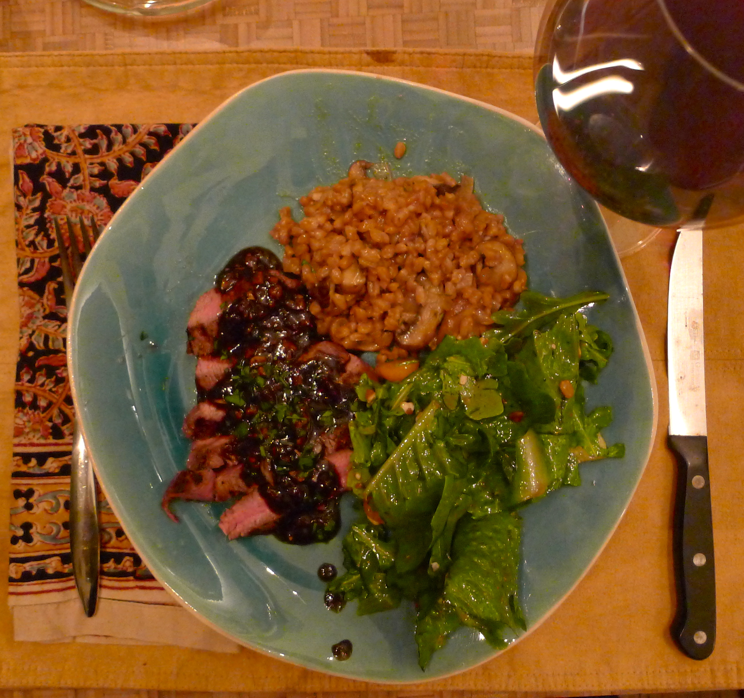 We spent Saturday afternoon in the kitchen, sipping wine and chopping mushrooms and laughing our way into a scrumptious meal- grilled tenderloin steaks with a garlic-balsamic glaze, mushroom-shallot farro risotto, and a fresh salad from our garden. HELLO.