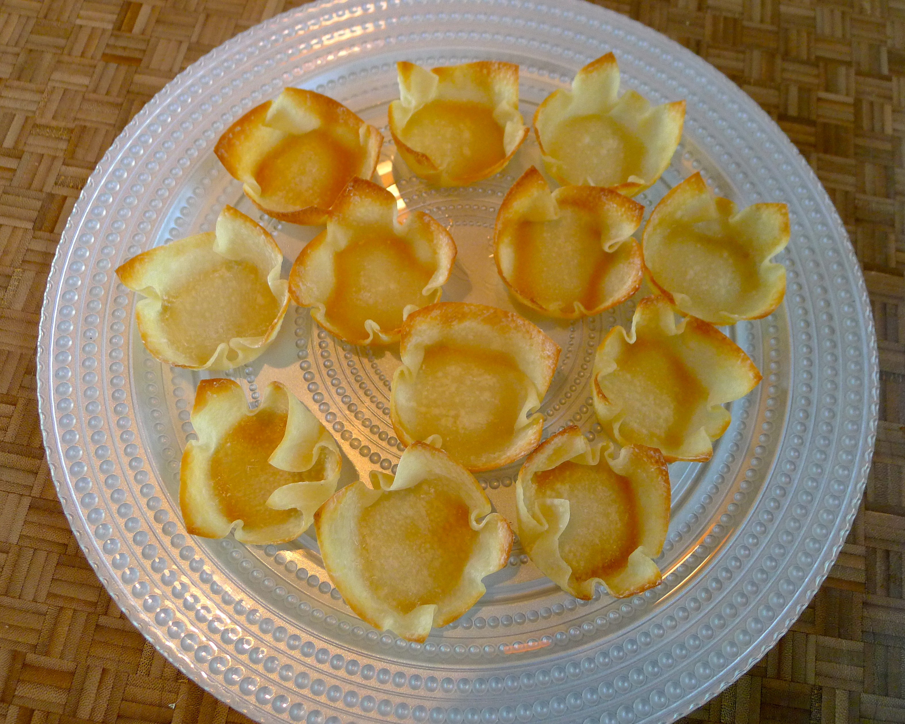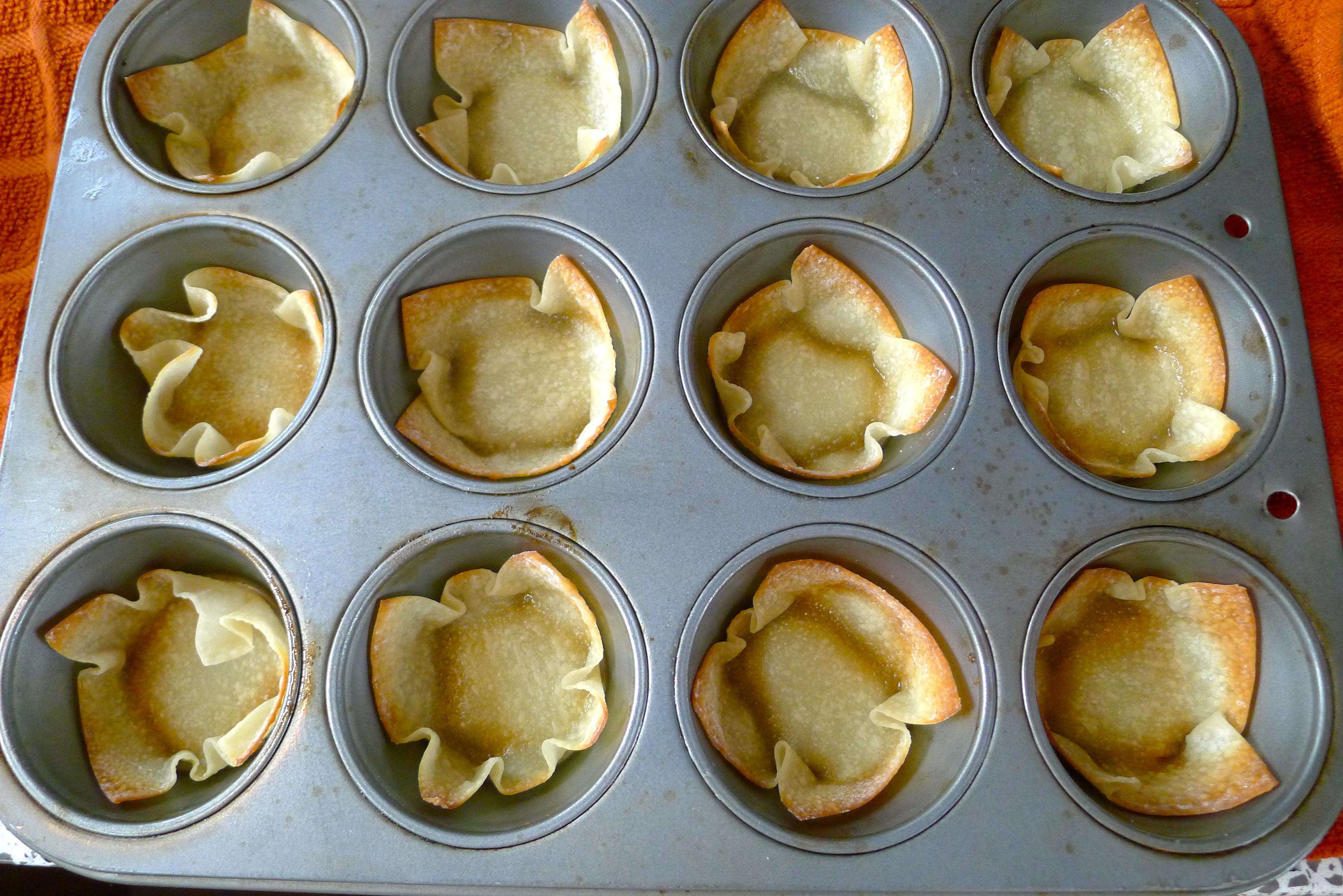 Heat the oven to 375 degrees. Brush each wonton wrapper on both sides with a little bit of oil. Press gently into the cups of a 12-cupcake pan. Bake for 5 minutes or until they get golden brown. Keep an eye on them because they burn quickly! Allow the shells to cool for a few minutes before removing them from the pan and adding the filling.