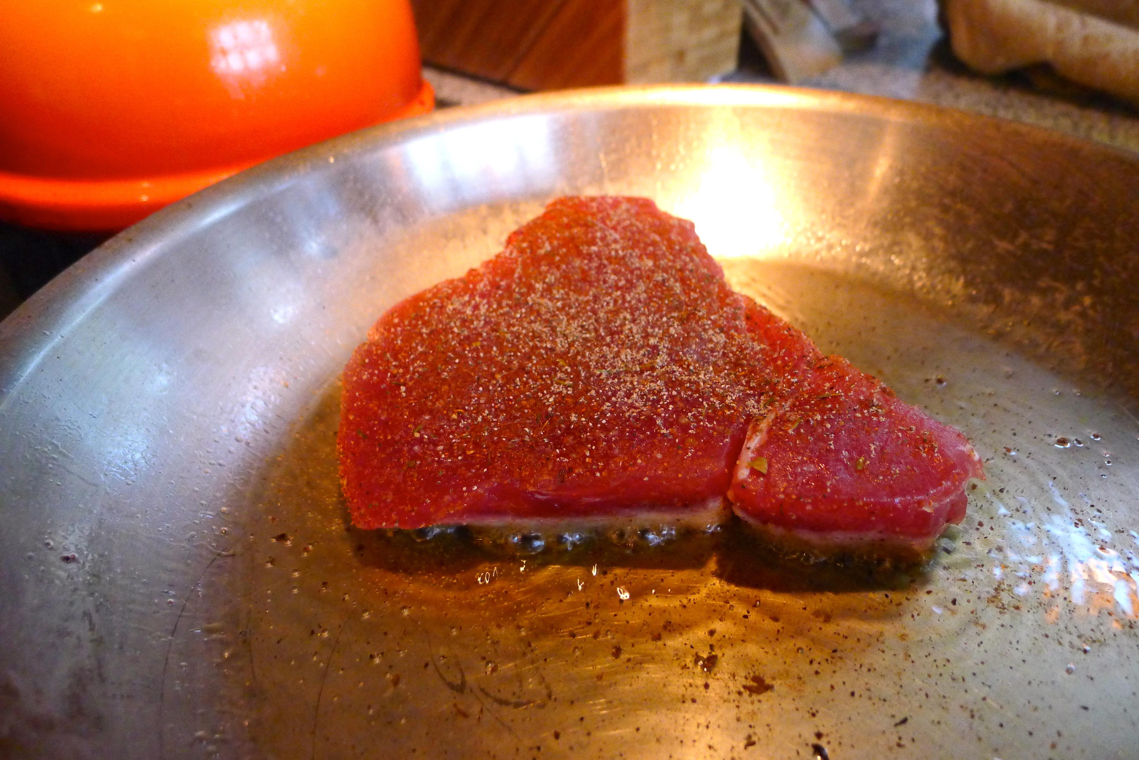 John and I have been eating lighter lately, so I’d picked up a thick ahi tuna steak. I seasoned it well with salt, pepper, some cumin, paprika, and chili powder. John seared it in a hot pan but left it rare. (Note to my mother and other sushi-haters: you could easily use steak, chicken, or shrimp instead!)