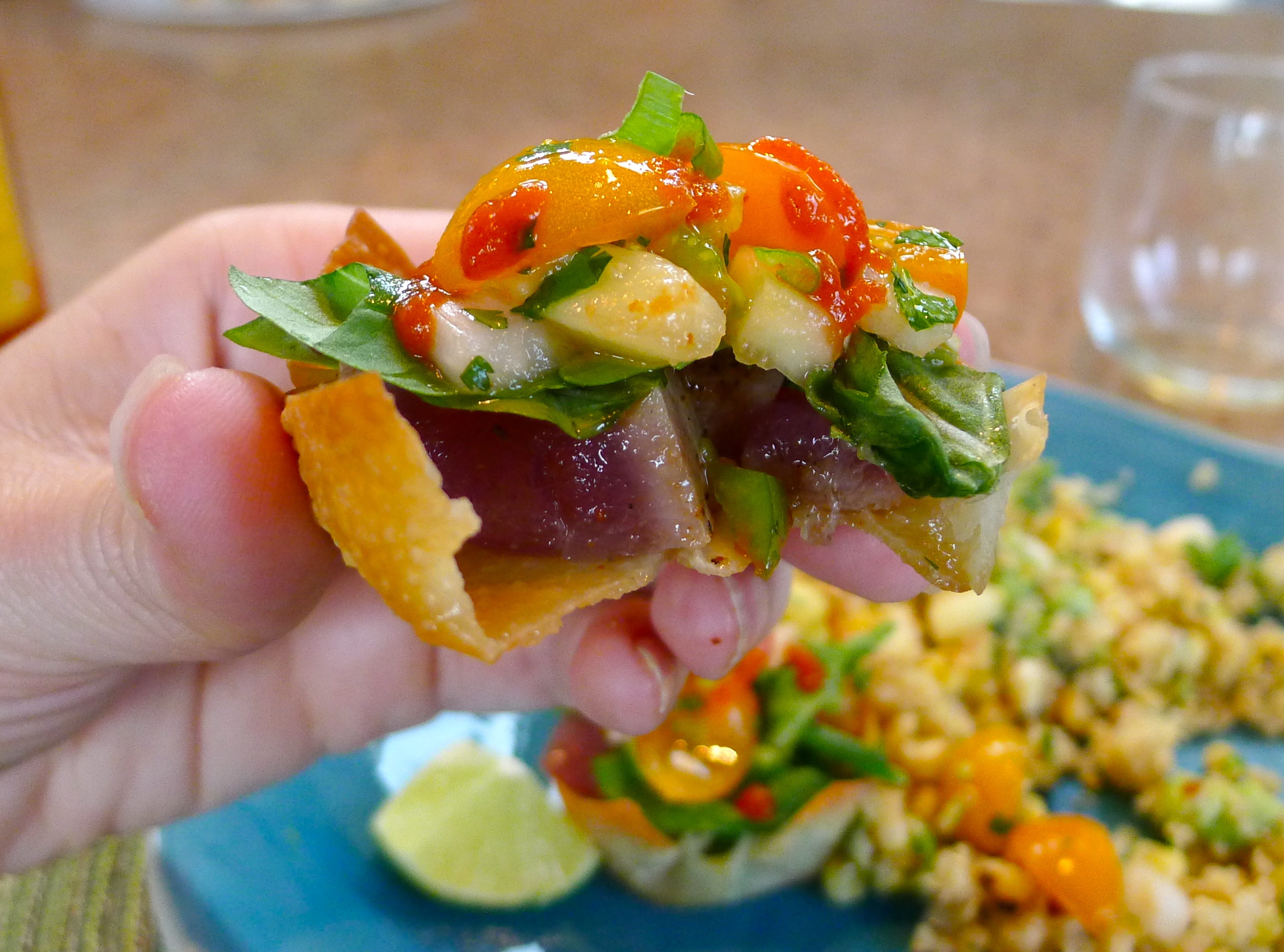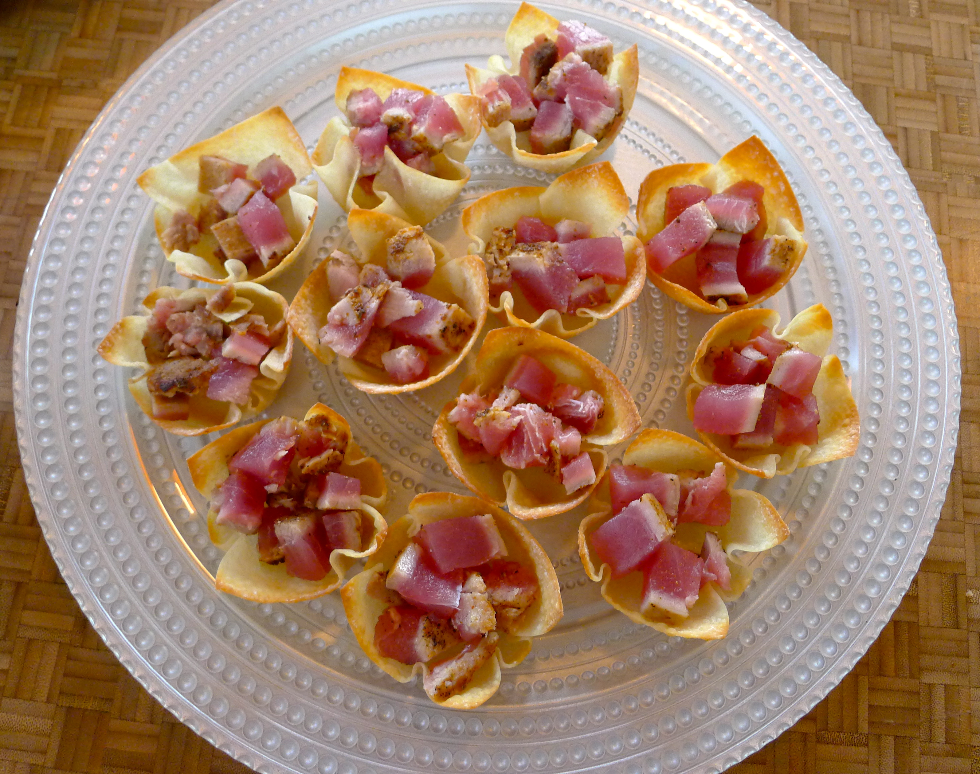 John chopped up the tuna and I put a little in each wonton taco shell.