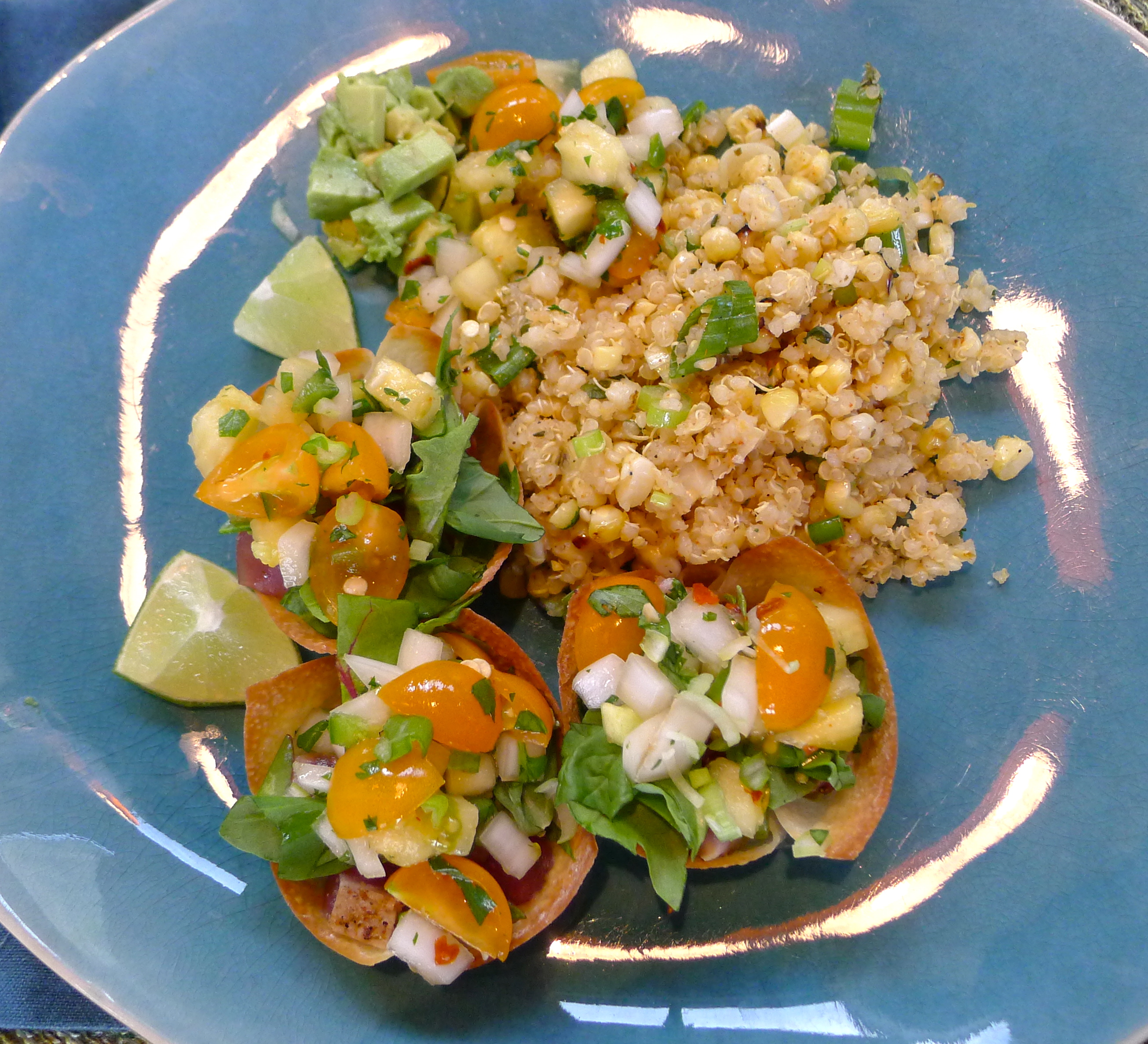 I had leftover cilantro-lime quinoa, to which I added charred corn and chopped green onion to go with our cute little wonton tacos. The shells were crisp and light, and did a good job of holding the filling together. The ahi was a little pricey, but these would be an ideal party food for a group. You could really fill them with anything you want! They’d be scrumptious filled with chicken salad, chopped shrimp, even traditional taco meat.