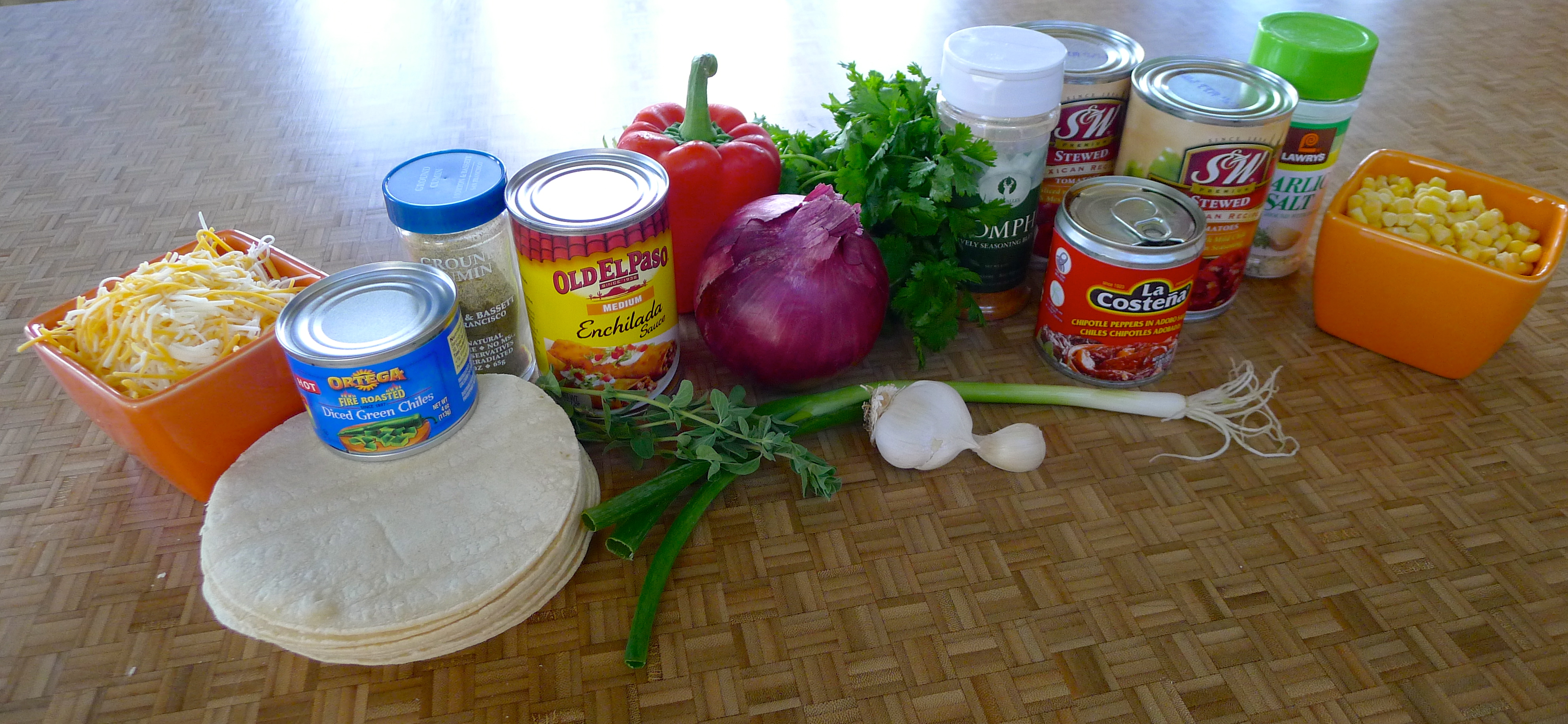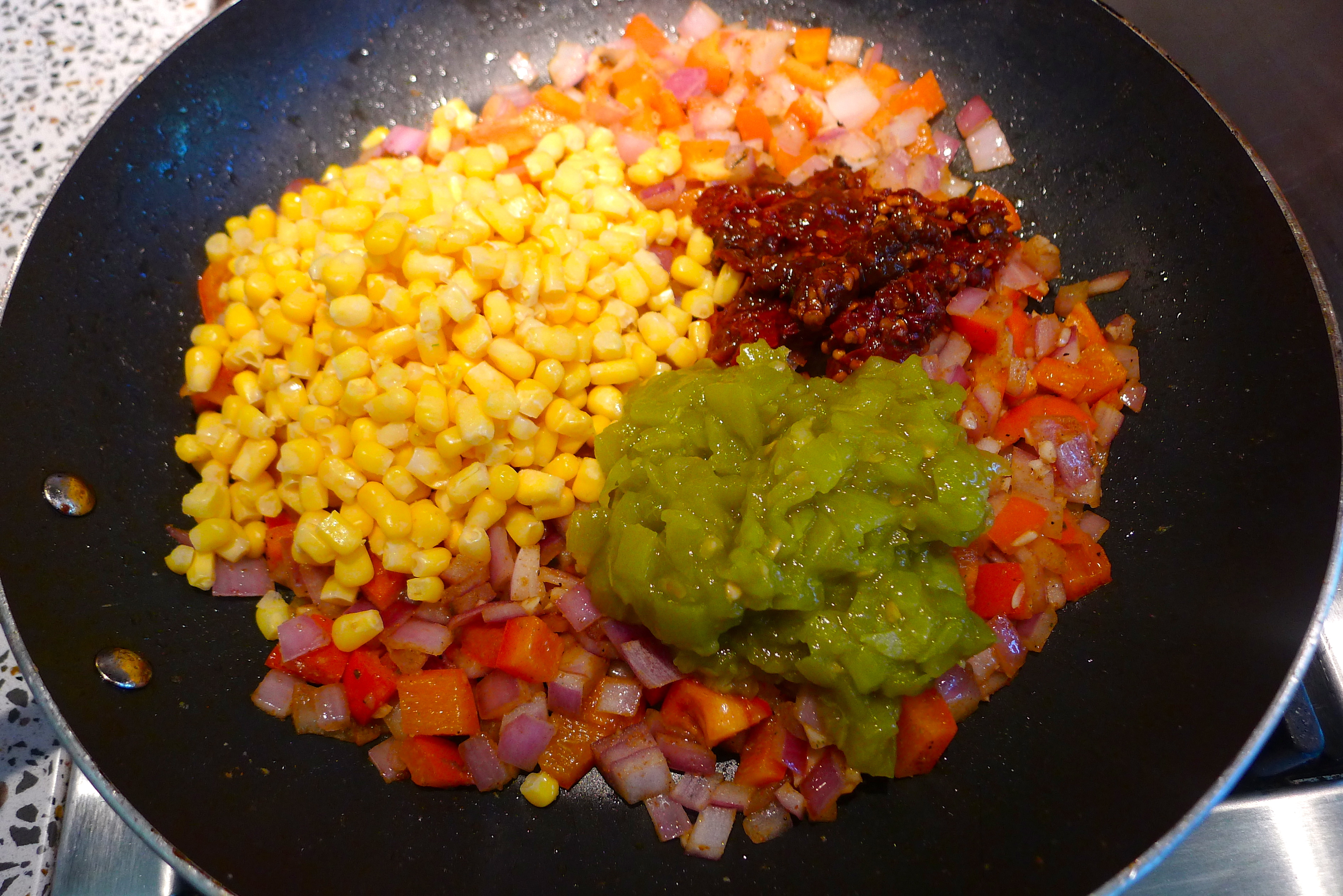 Next, I added a cup of frozen corn, the green chiles, and the chipotles. Spicy! In went the stewed tomatoes. (Side: I didn’t like the big half-tomato chunks, so I cut them into smaller pieces right there in the pan. Next time, I’ll use diced tomatoes.)