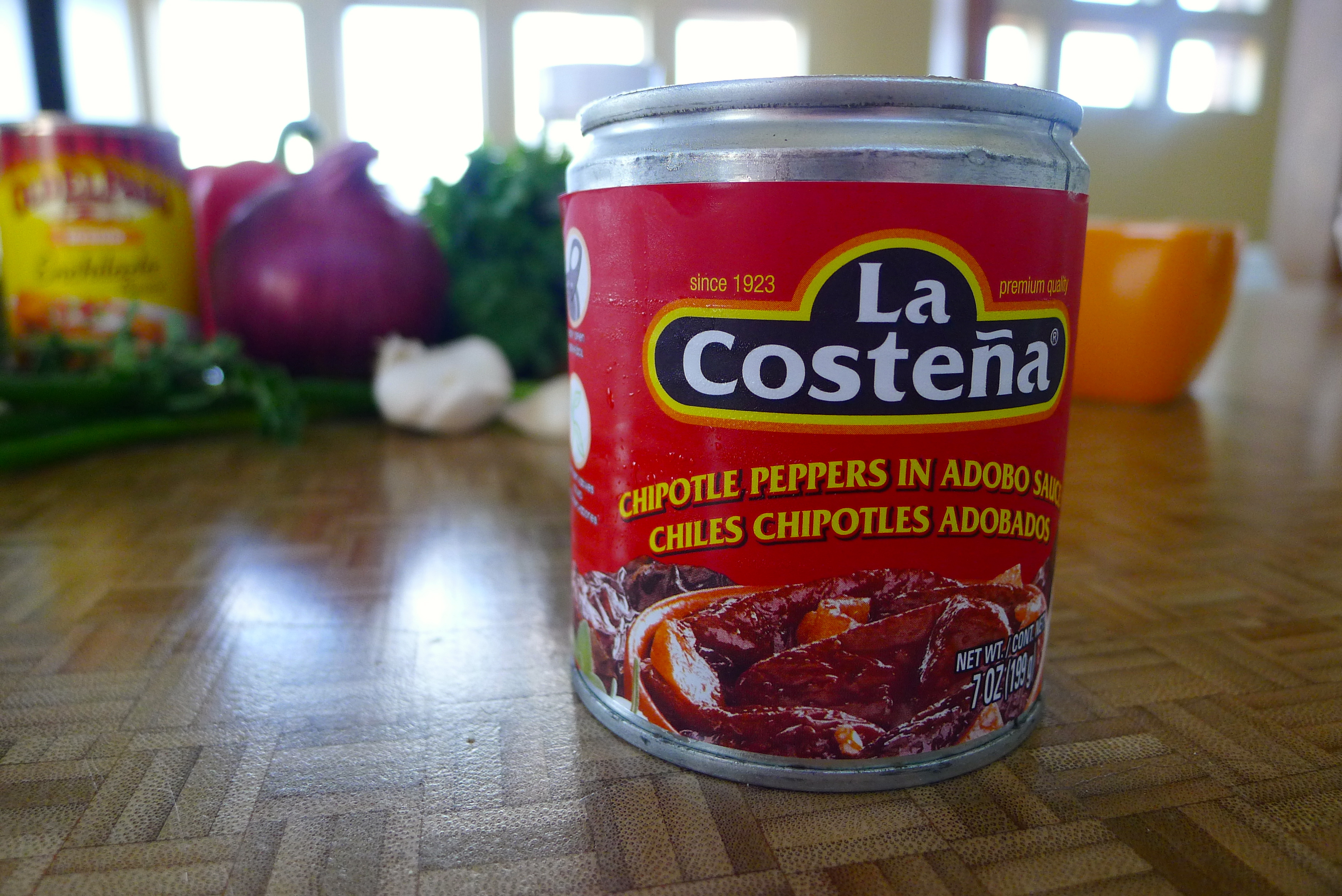 Next up: the whole reason I was making this recipe! I minced four large chipotle peppers. I also got my canned goods opened up and ready to go- fire-roasted green chiles, enchilada sauce, and two cans of stewed tomatoes.