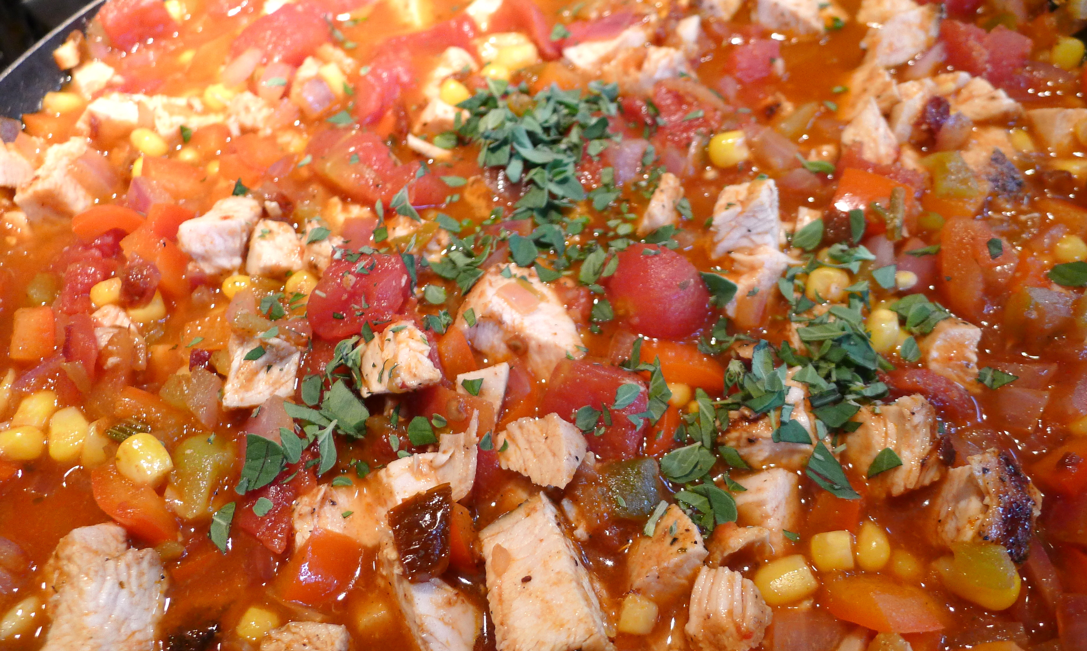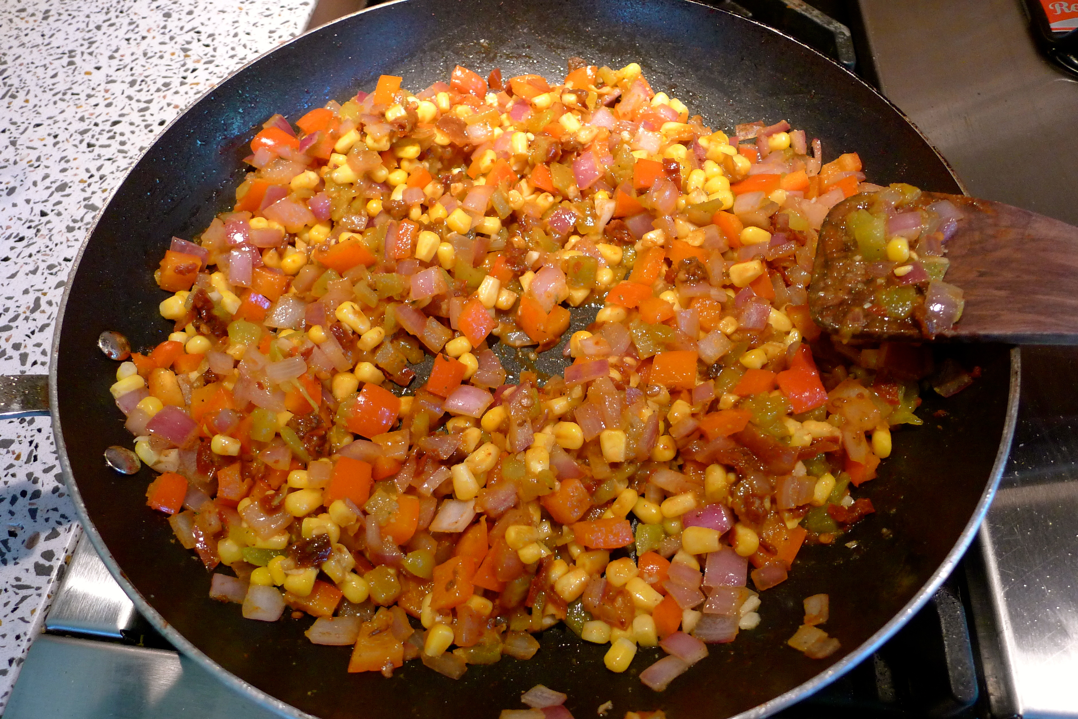 Sauté onion and red bell pepper in chicken drippings. Add garlic salt, more Mexican seasonings, and more cumin. Add garlic, corn, and chiles. Stir well to combine. Add tomatoes and simmer for a couple of minutes.