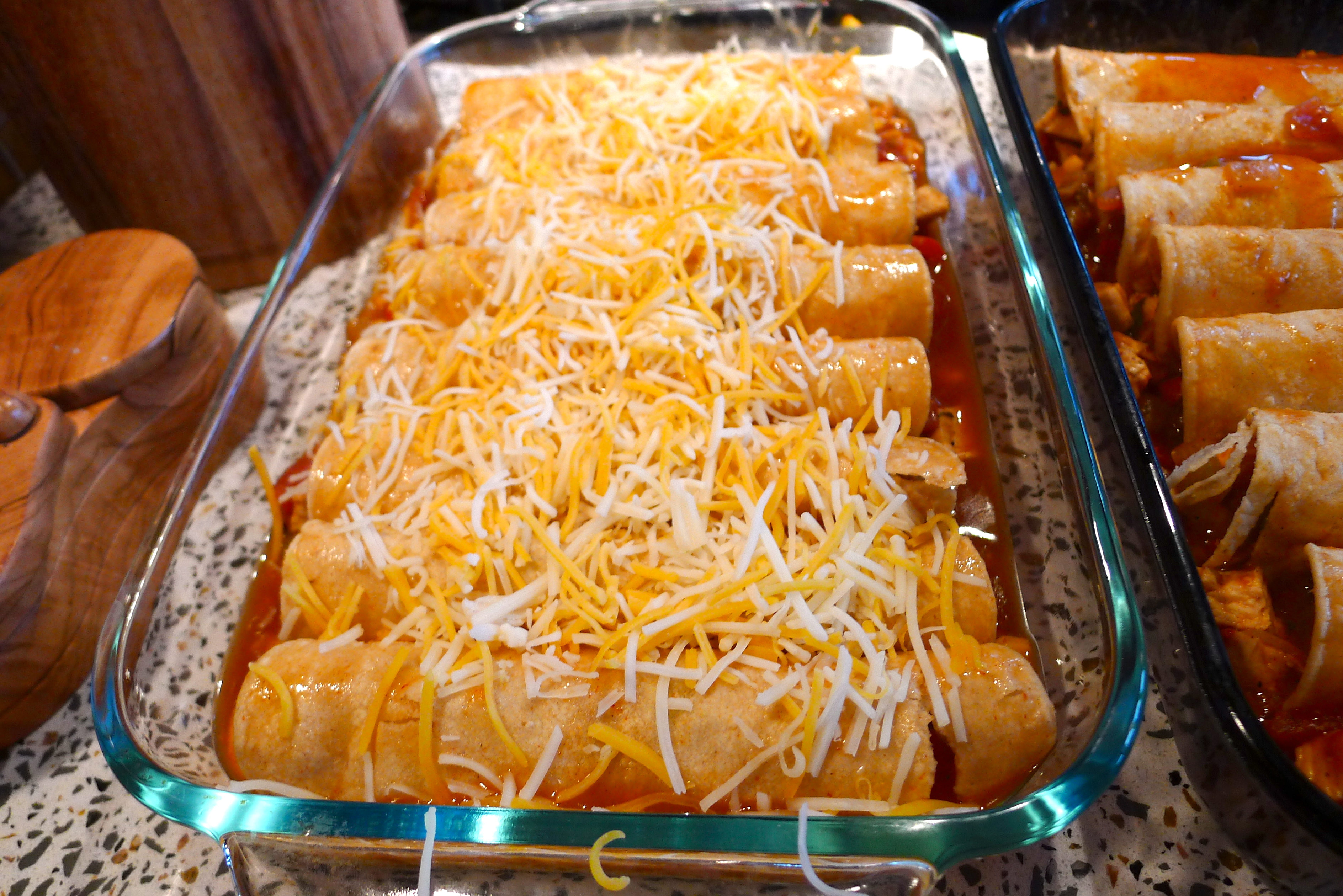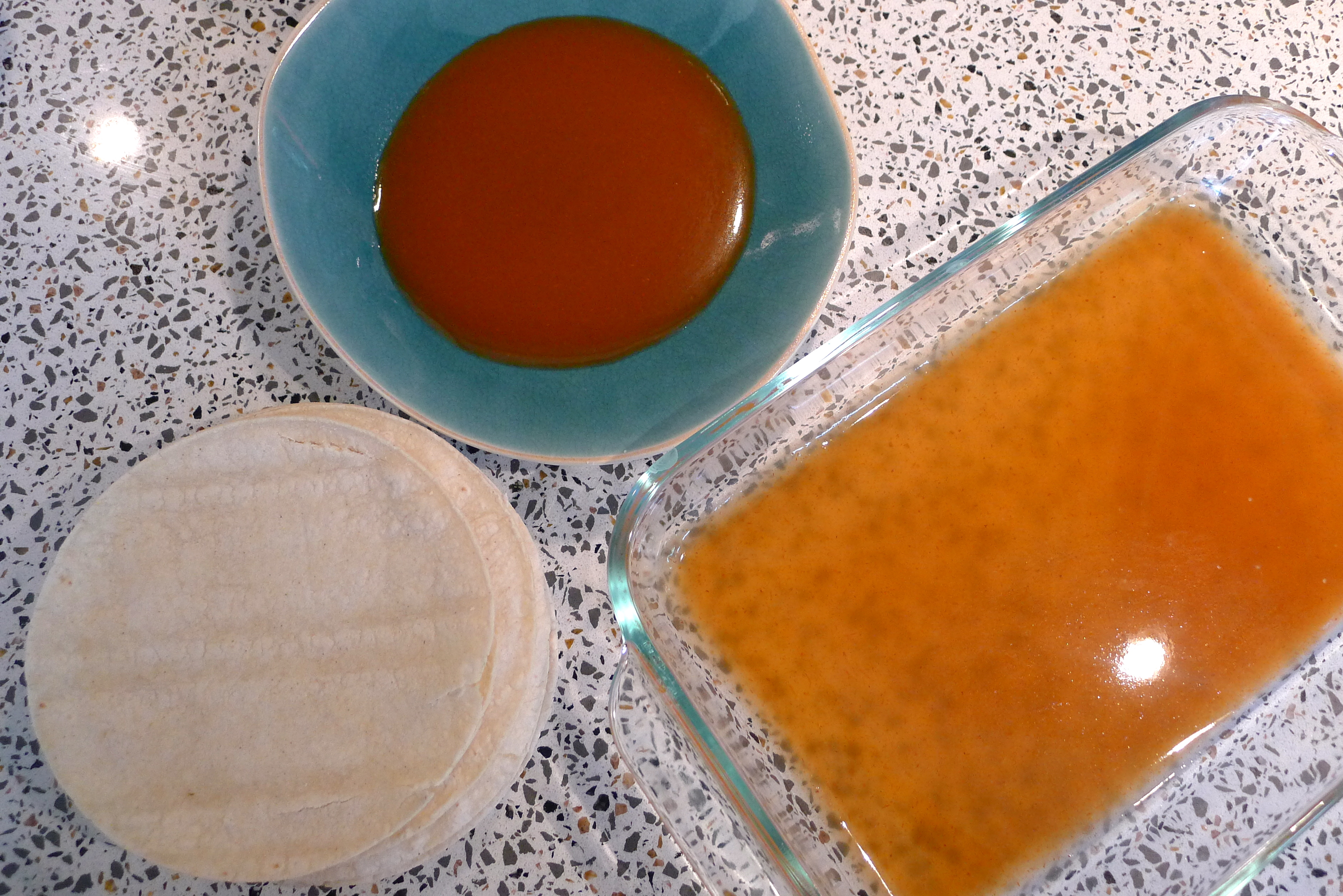 I prefer flour tortillas myself, but traditional enchiladas use corn tortillas. Per Tyler’s recommendation, I microwaved the tortillas for 30 seconds to soften them up. Then I dipped one in the enchilada sauce, lightly coating both sides. In the baking pan (to avoid even more mess), I scooped some of the filling into the saucy tort and rolled it so the seam side was down. Truth? Aside from my fingertips, it wasn’t a messy situation at all!