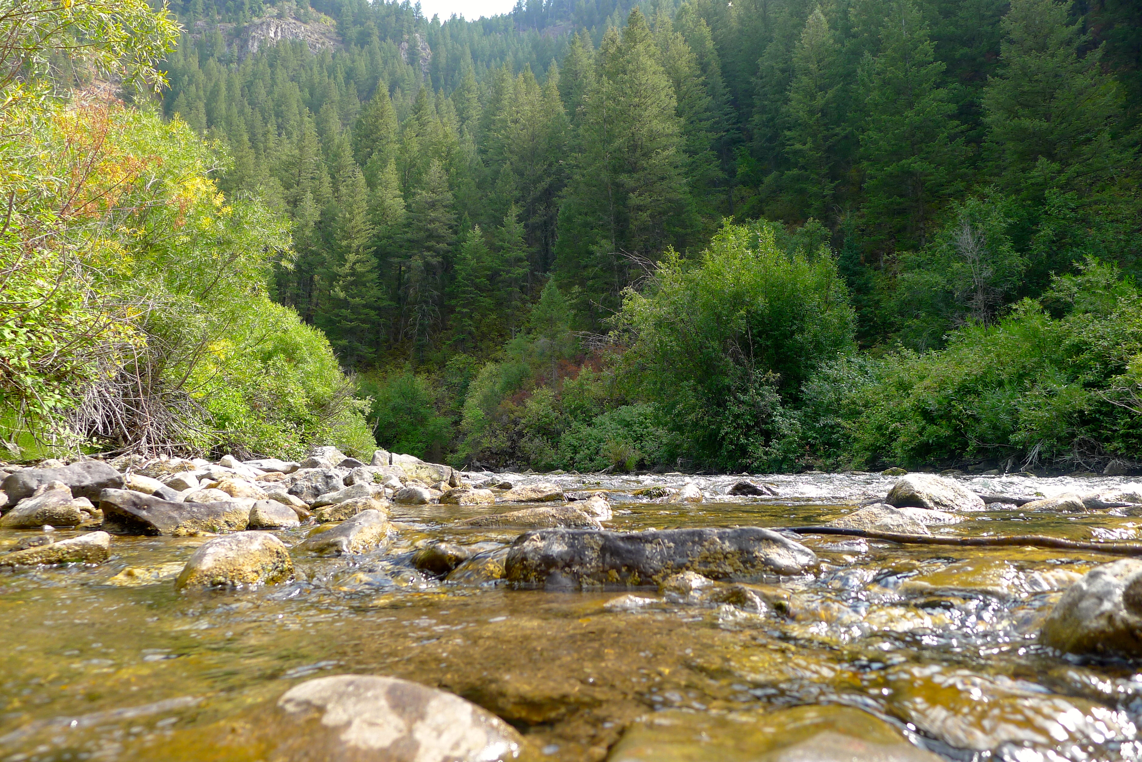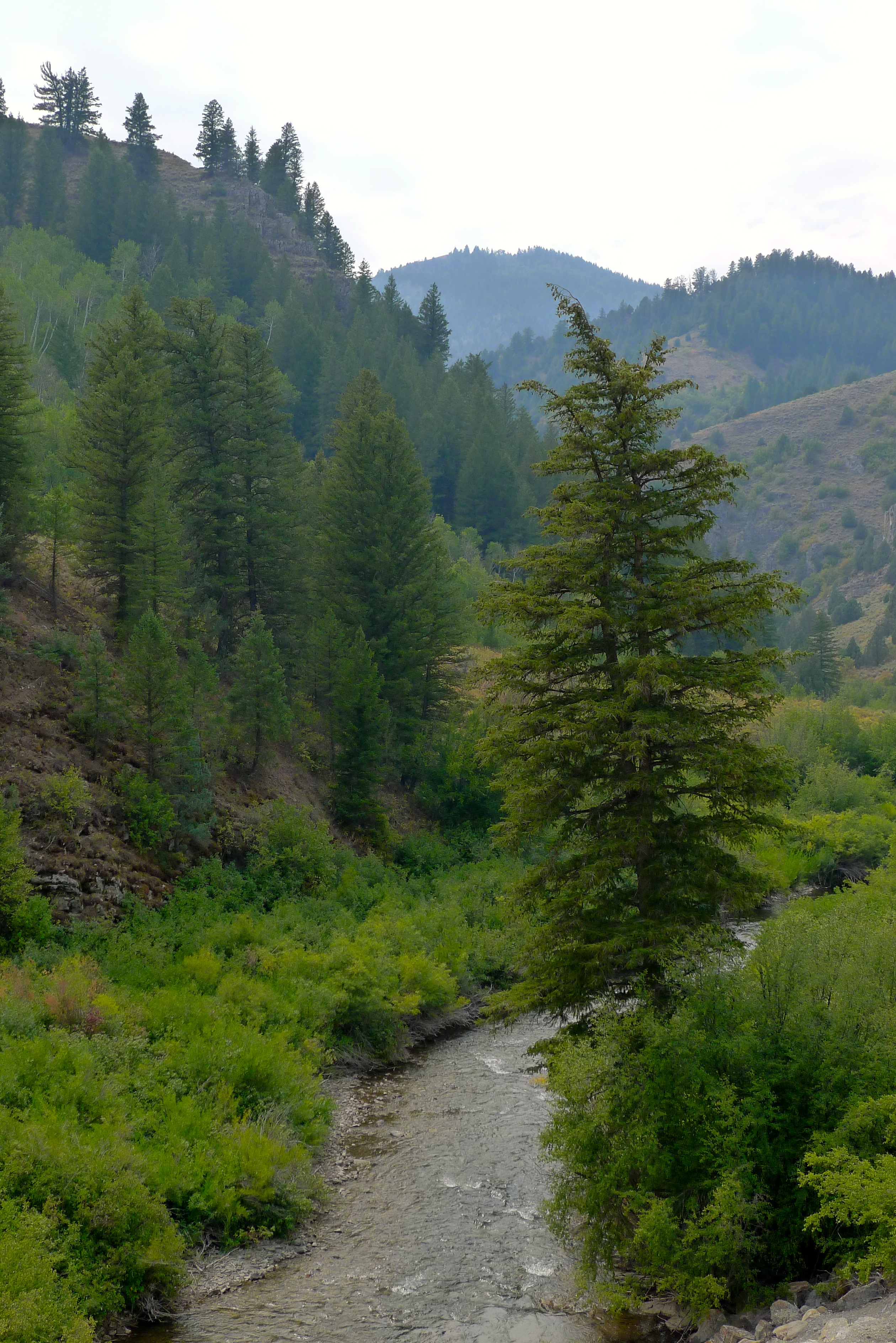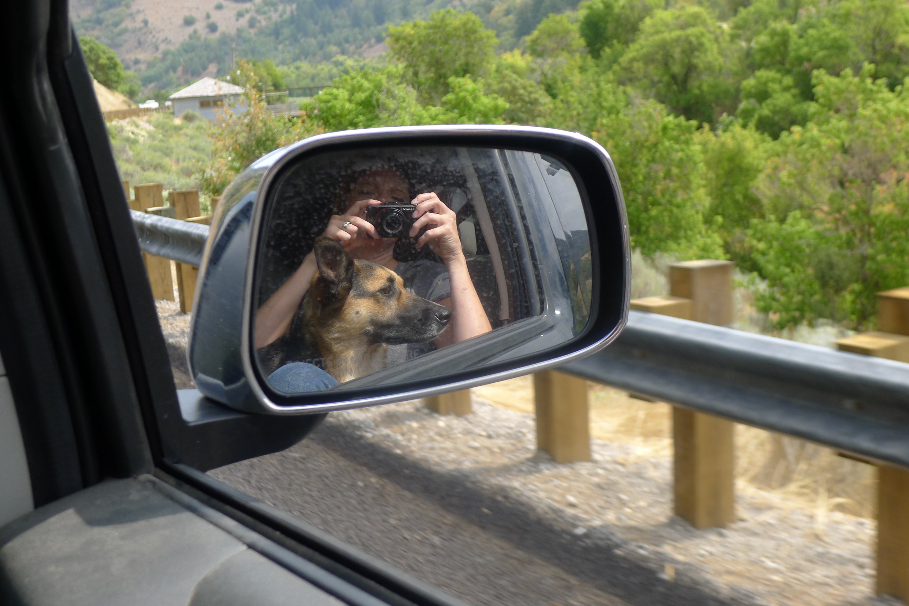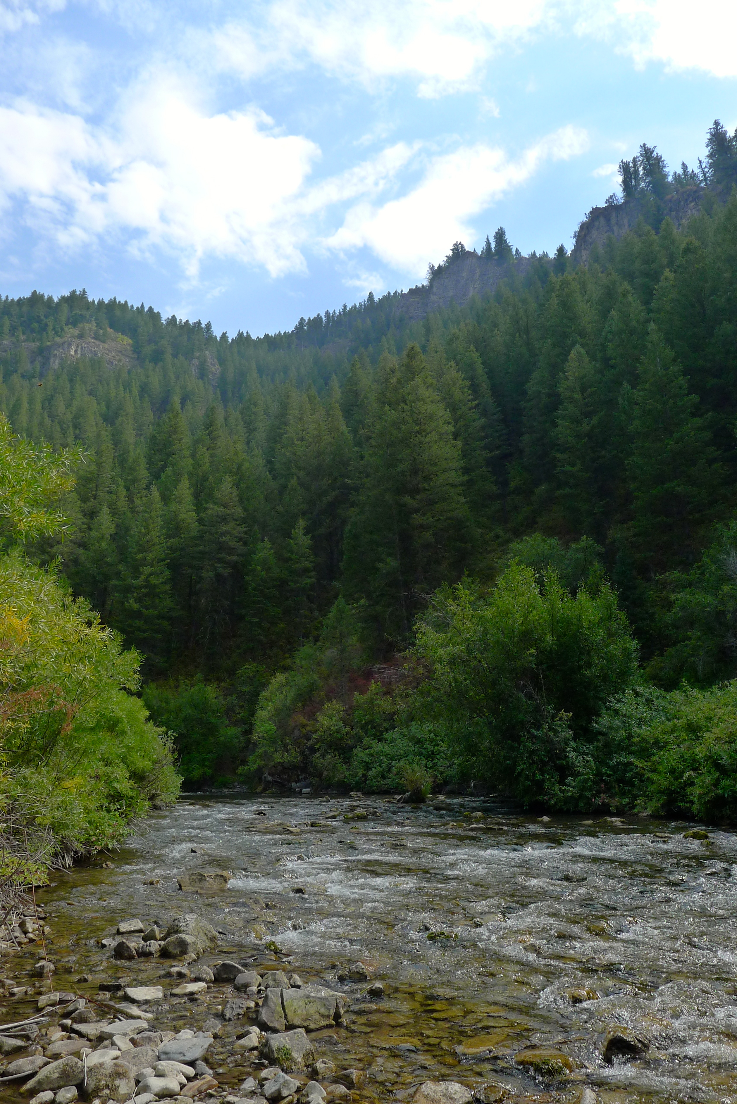 We hopped back into the still-packed truck and stopped at Beaver Mountain ski area, just to check it out. Then we went on the hunt for a good stretch of the Logan River for fishing. At one turn-out, we could see the river below, gently curving around a bend with a trail alongside it. Bingo! I filled a backpack with a hat, magazines, and a bottle of wine, grabbed a chair, and started down the semi-treacherous trail toward the river. I’d find a spot by the river to read while John fished a few holes along the bend. Heavenly! After scouring the area, we realized there was less river bank real estate than we thought. But we’d already trekked down the hill, so I plopped the chair in a shallow eddy, poured some wine, and kicked off my shoes. Cholula pranced happily around the river rocks, dragging sticks out of the water.