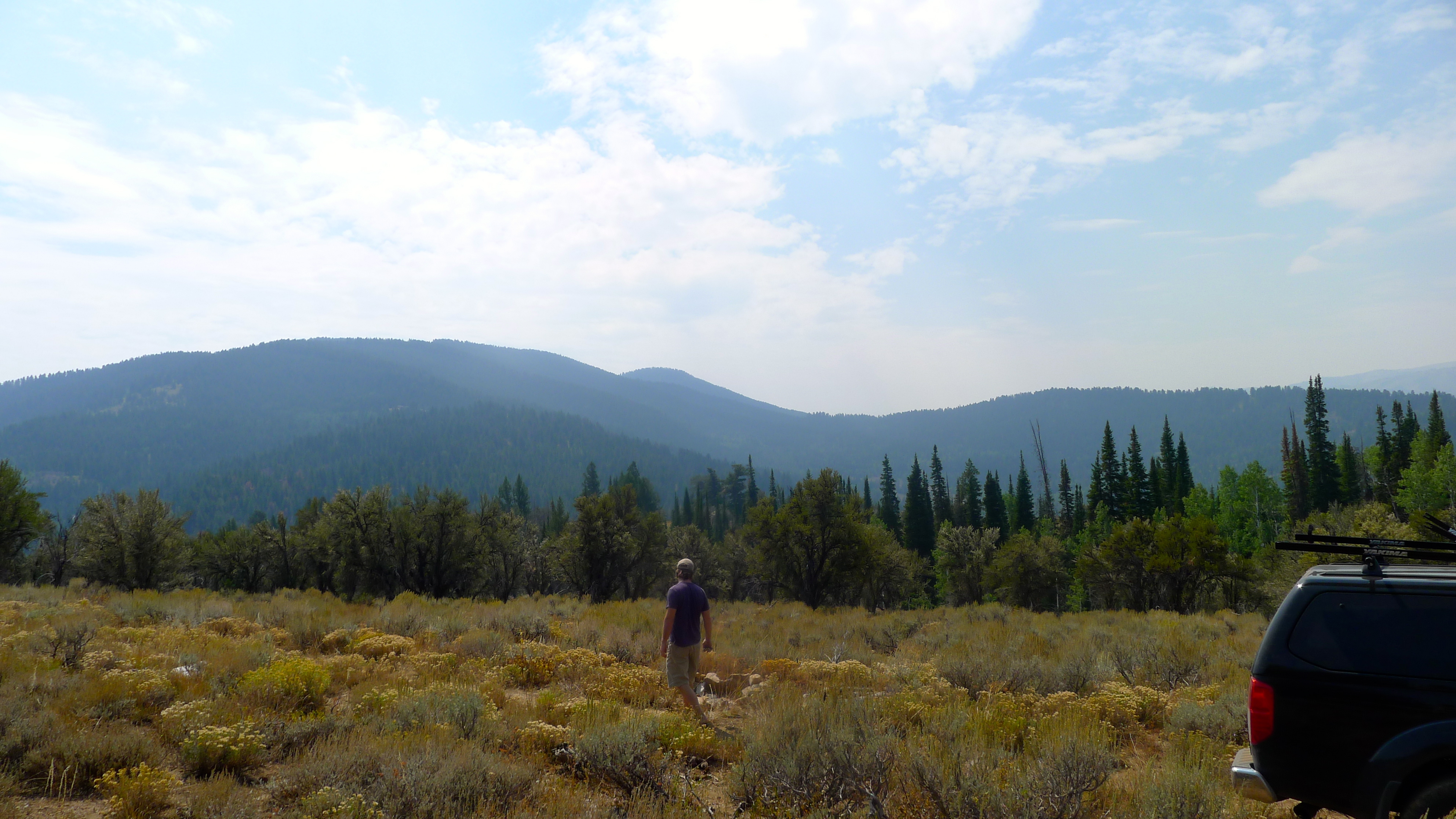 I never see the turn-off until John veers off the road. There it was, the old gate, chained and locked. I held my breath while John jiggled the key in the padlock and held on to everything else as we bounced up the road. John said something like, “You’re right- Betty couldn’t make it up here.” The view was just as I remembered it, vast and gorgeous. The fire ring John built three years ago was still in tact, a stack of faded firewood next to it. What I didn’t remember was how HOT this hillside could be. We decided to set up camp later, in case the building clouds sprinkled a little. John would quickly clear a tent pad and then we’d go play.