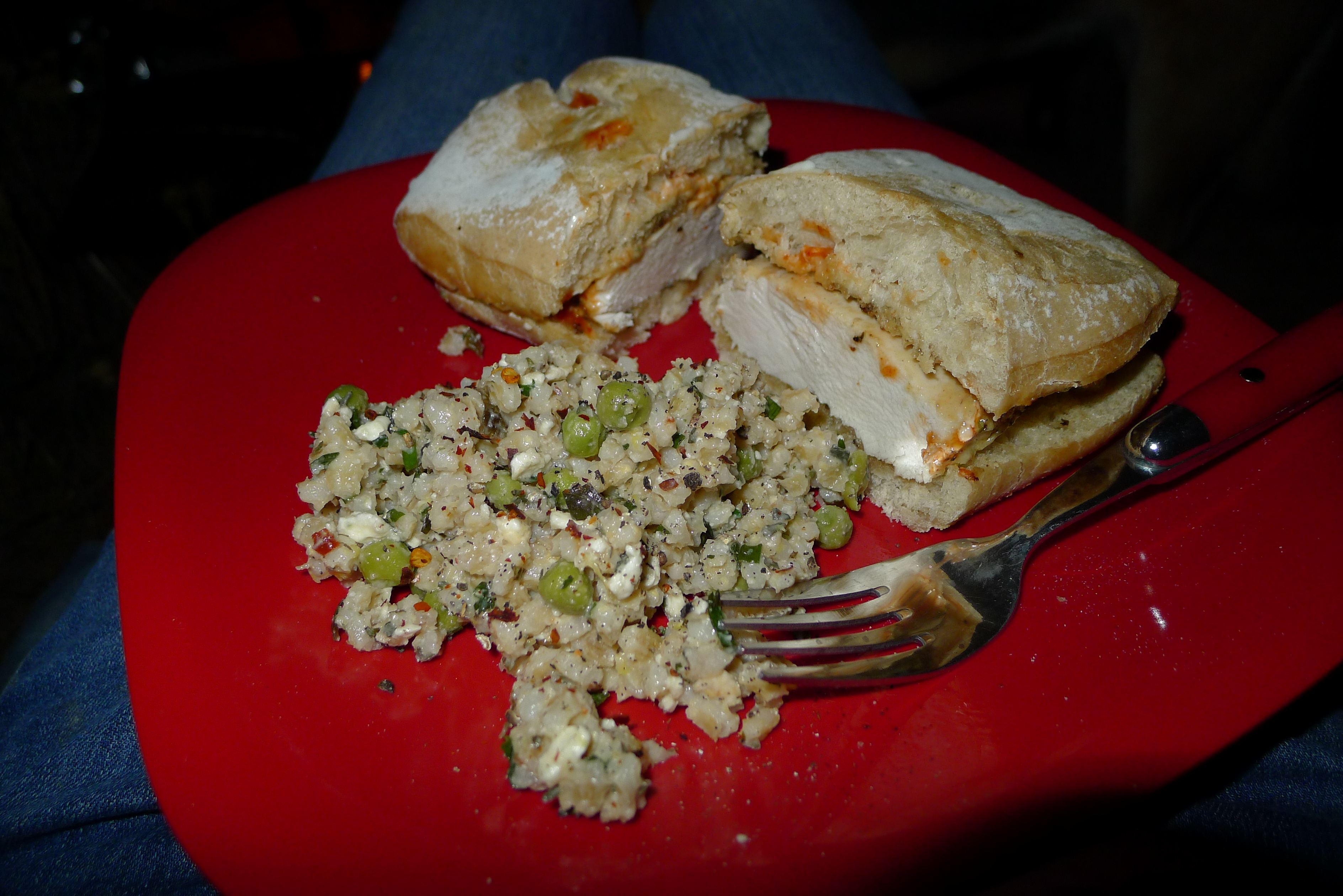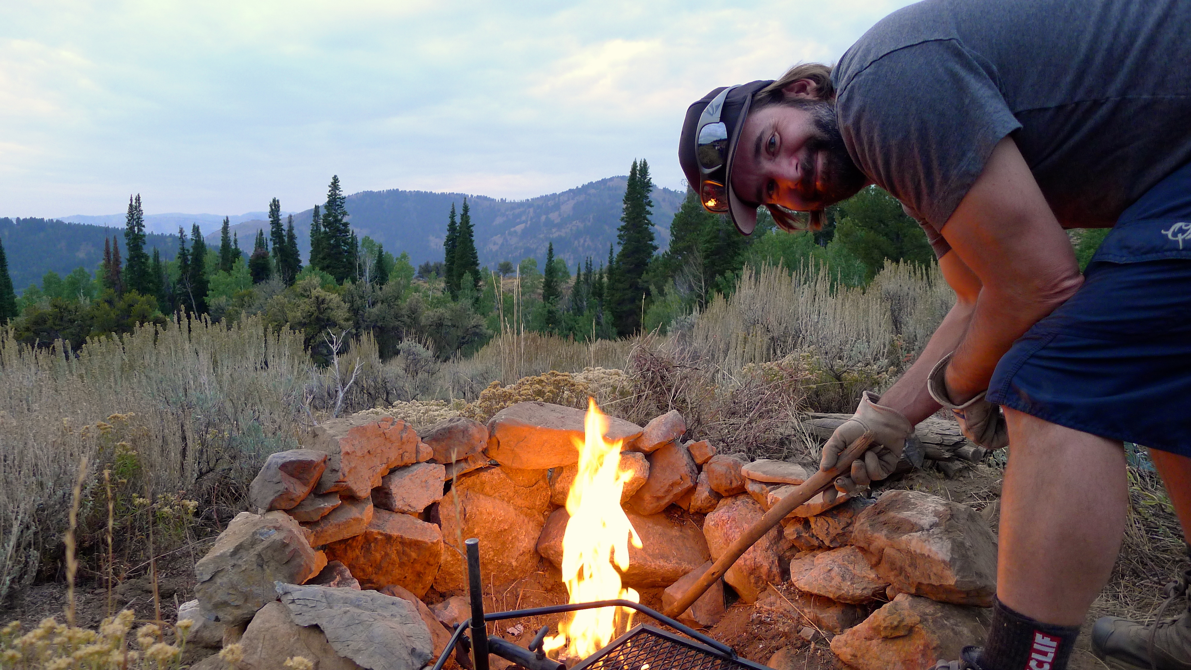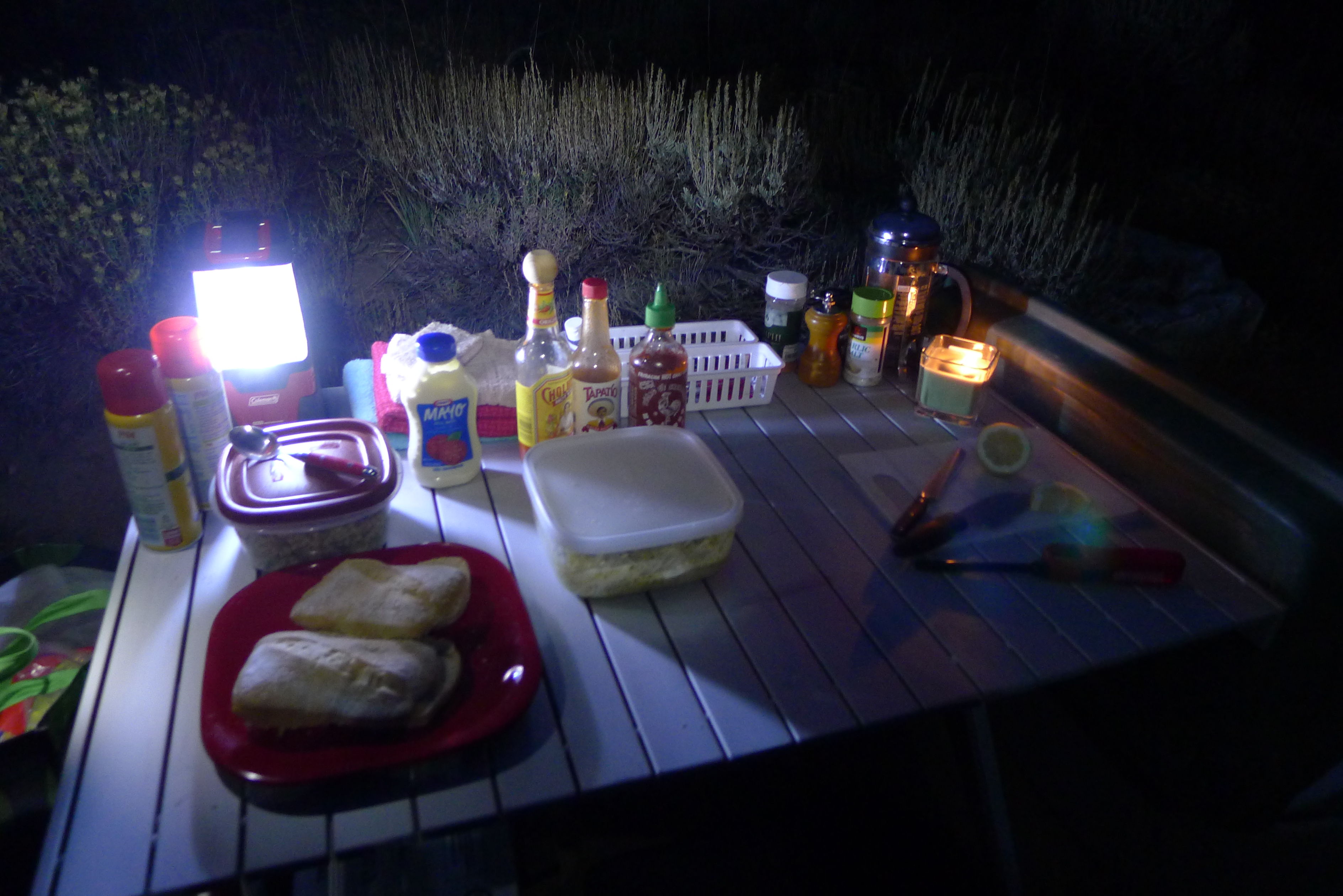Because it was so dry, John spent some time building up the walls of the fire pit (pausing occasionally to sneeze and then call back the dog). By the time we lit the coals to make dinner, the sun was setting behind some thickening clouds. The coals took longer than expected, and we made dinner by the light of our headlamps. Every few minutes, one of us would say, “Did we remember the _____?” or “You know what we forgot?” We told ourselves we were just out of practice and didn’t mention what we both knew- that everything we needed was at home, just waiting inside Betty. It was 10pm before we ate. (The Peep’s sammies were scrumptious.)