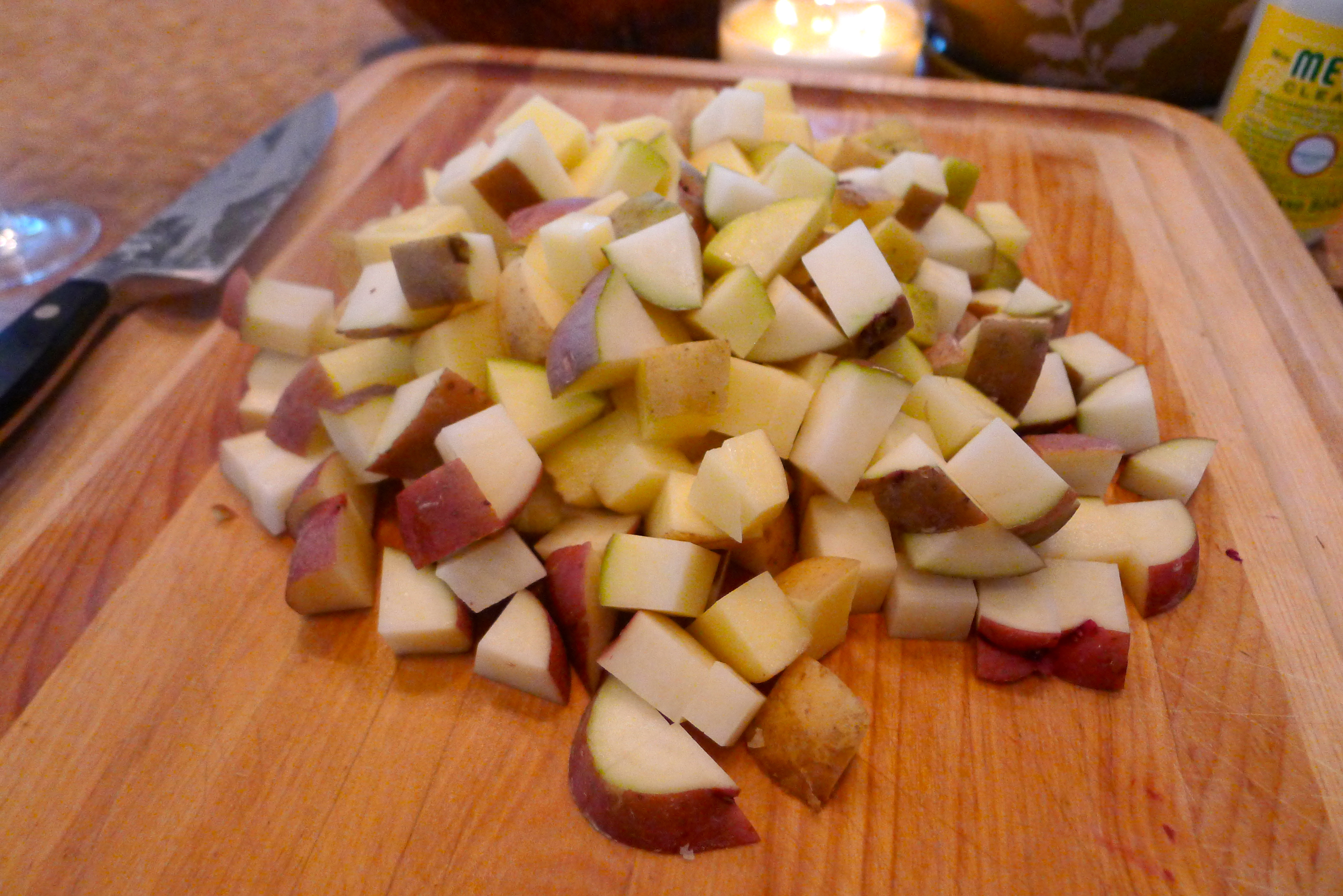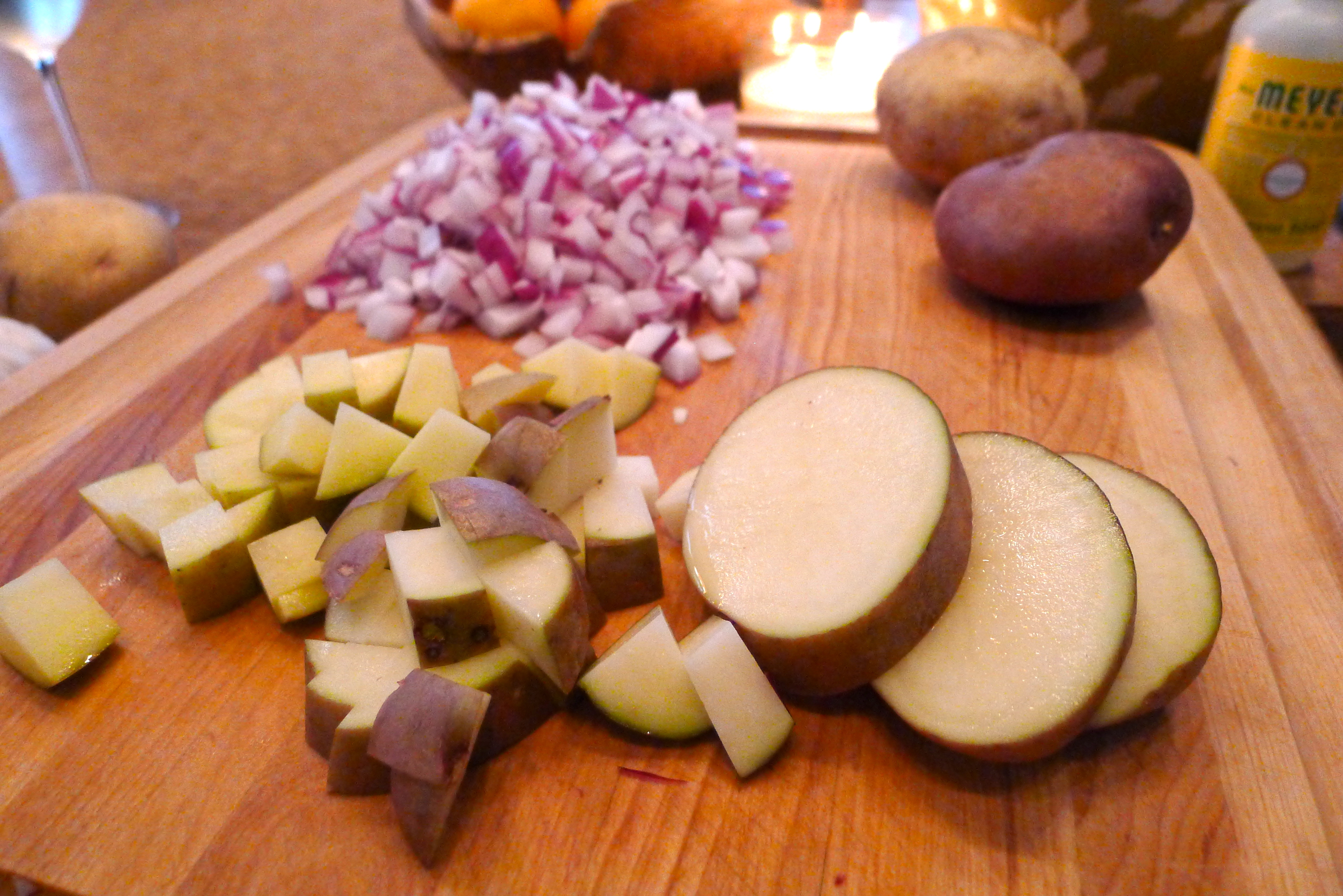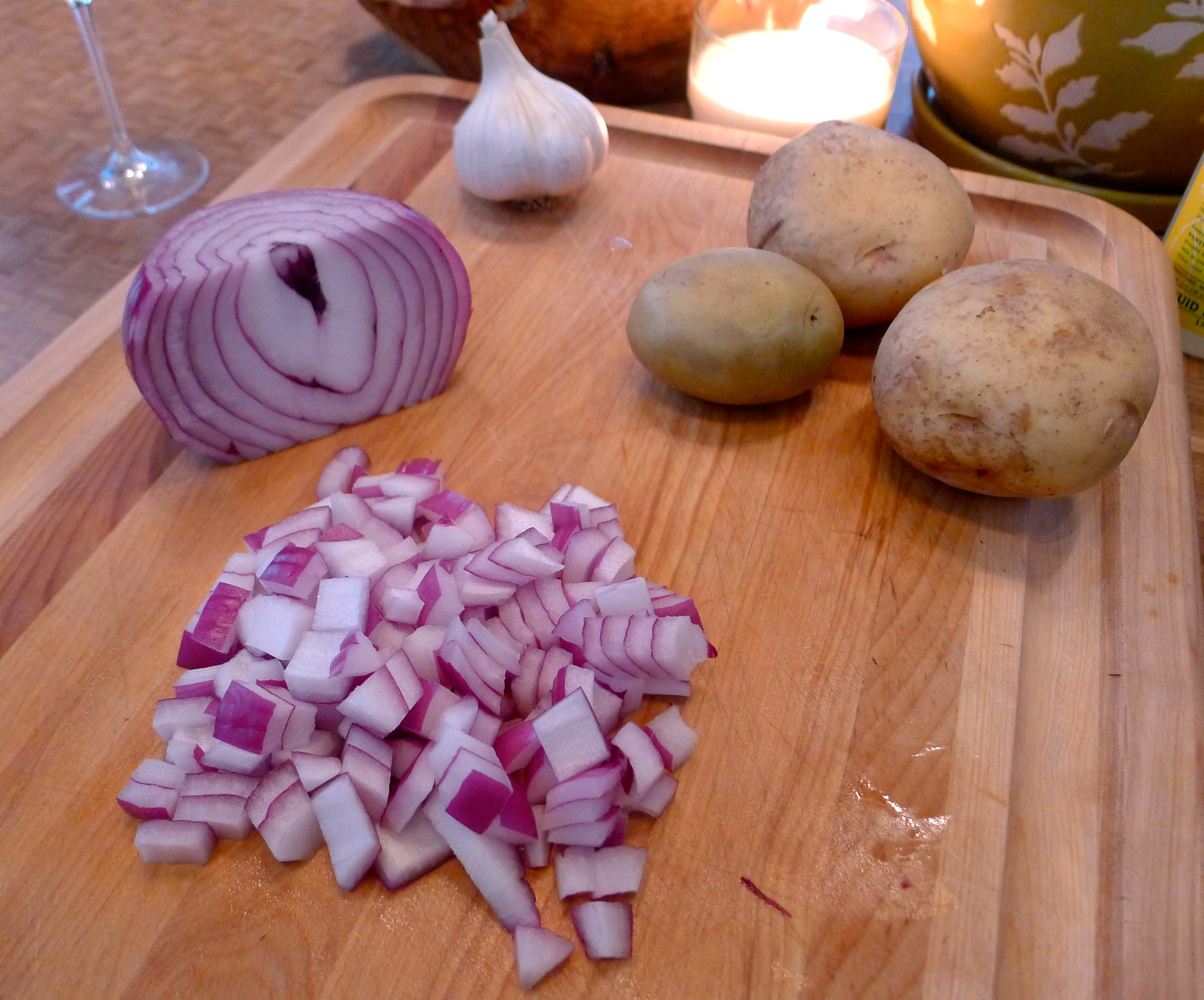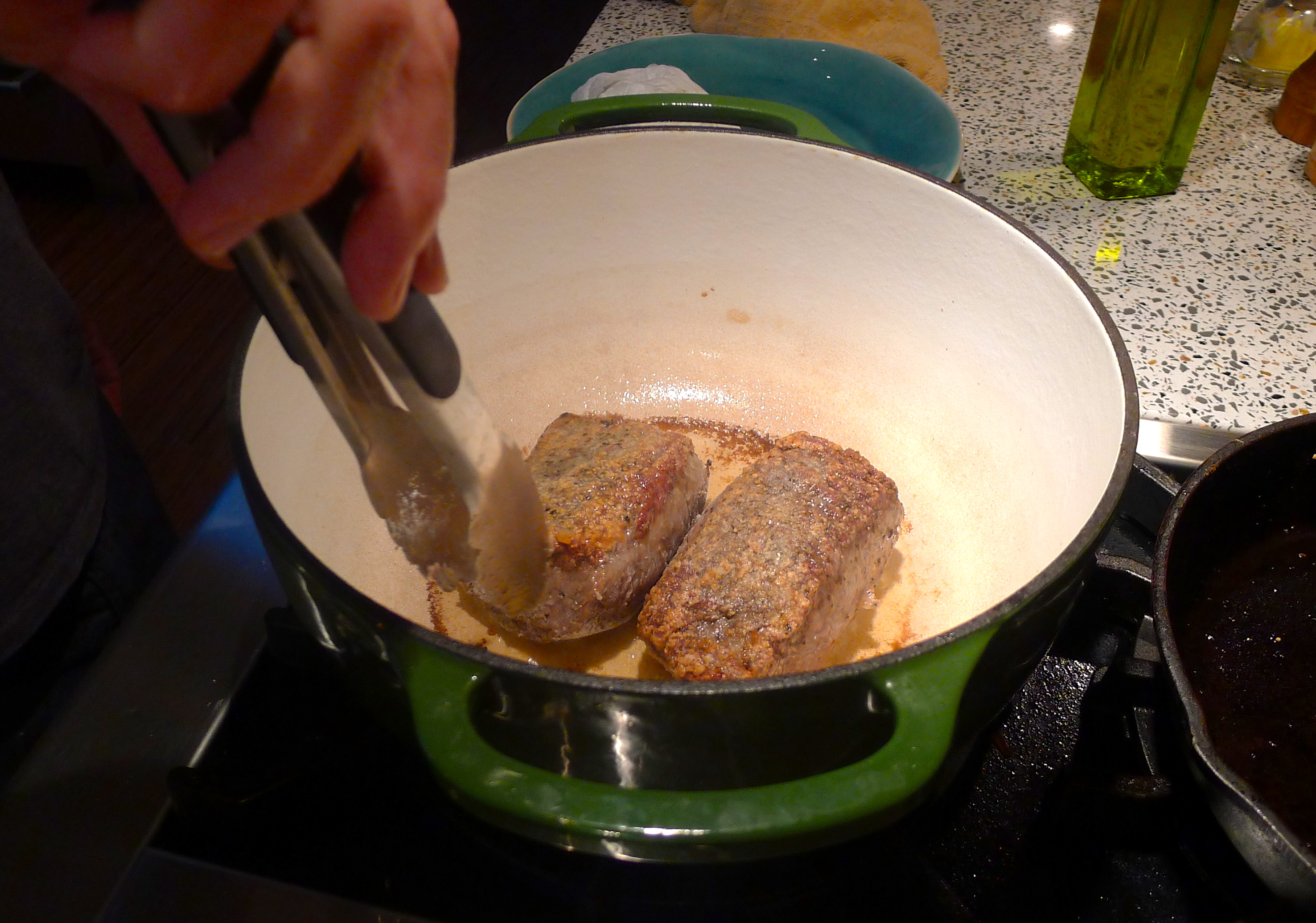Sometimes simple is best. There’s not a lot of fancy culinary skill going on with this stew. The flavorful ingredients speak for themselves and mingle together into a delicious stew. While the rain fell steadily outside, John seasoned the meat and seared it on both sides. He set it aside for later while I prepped onion, garlic, and lots of potatoes. All good stews include potatoes!